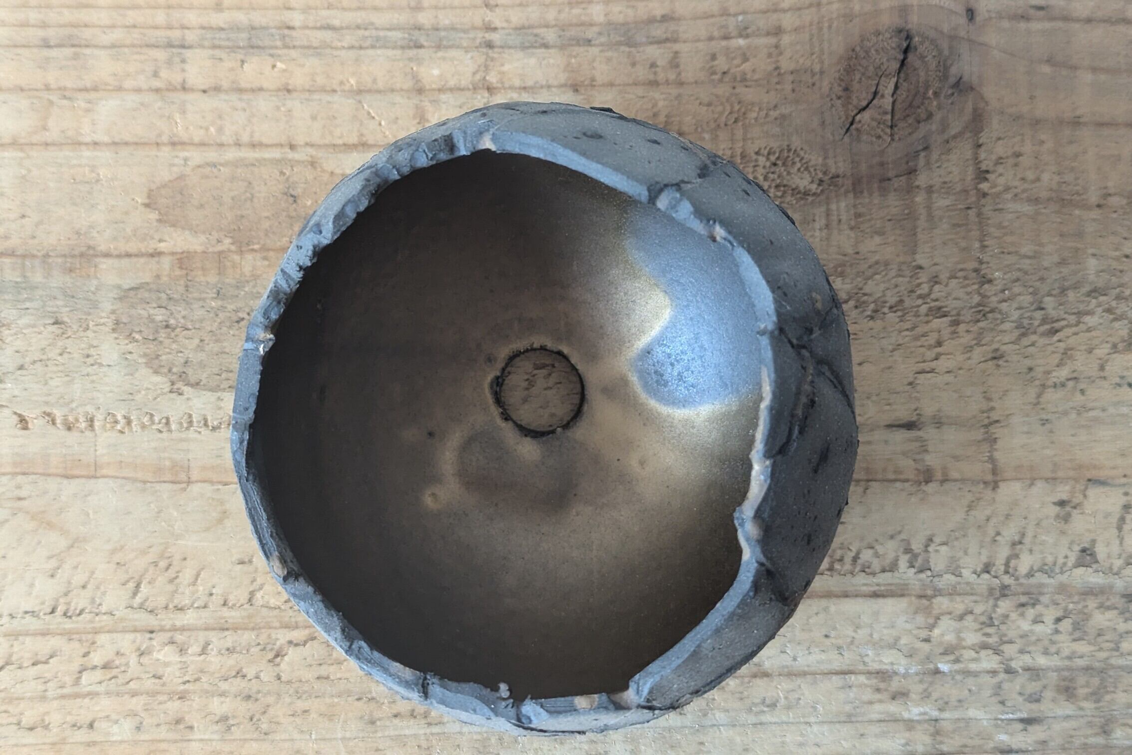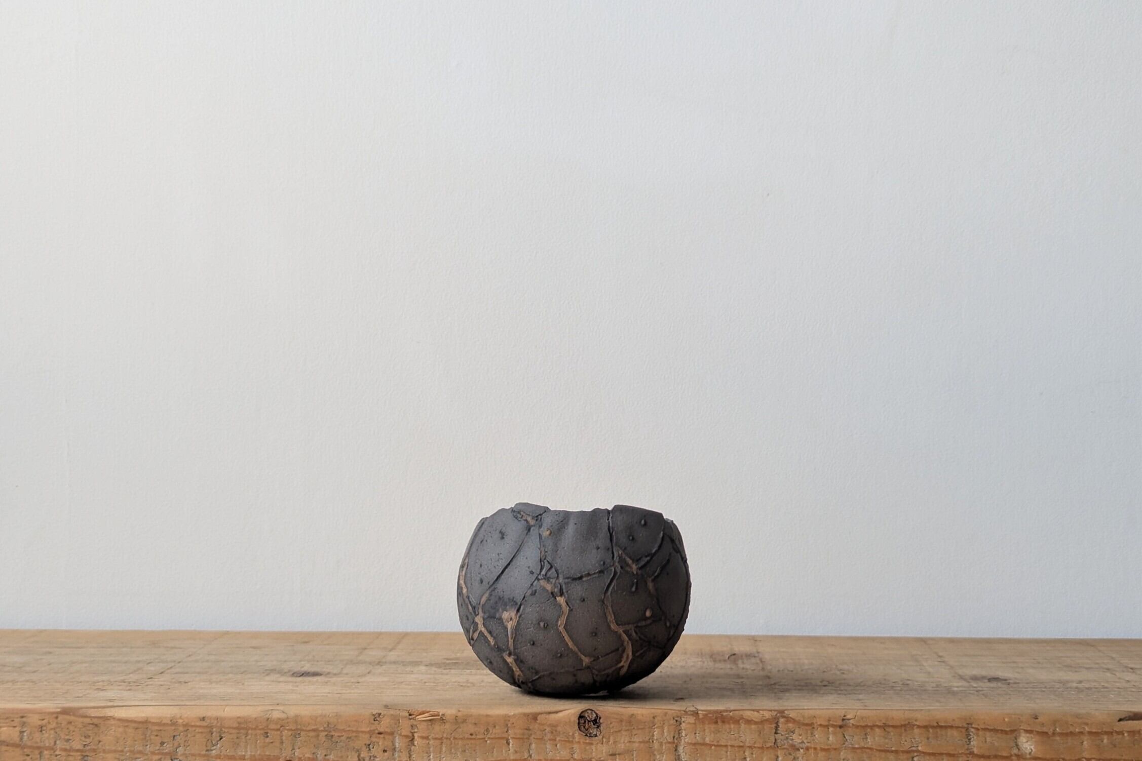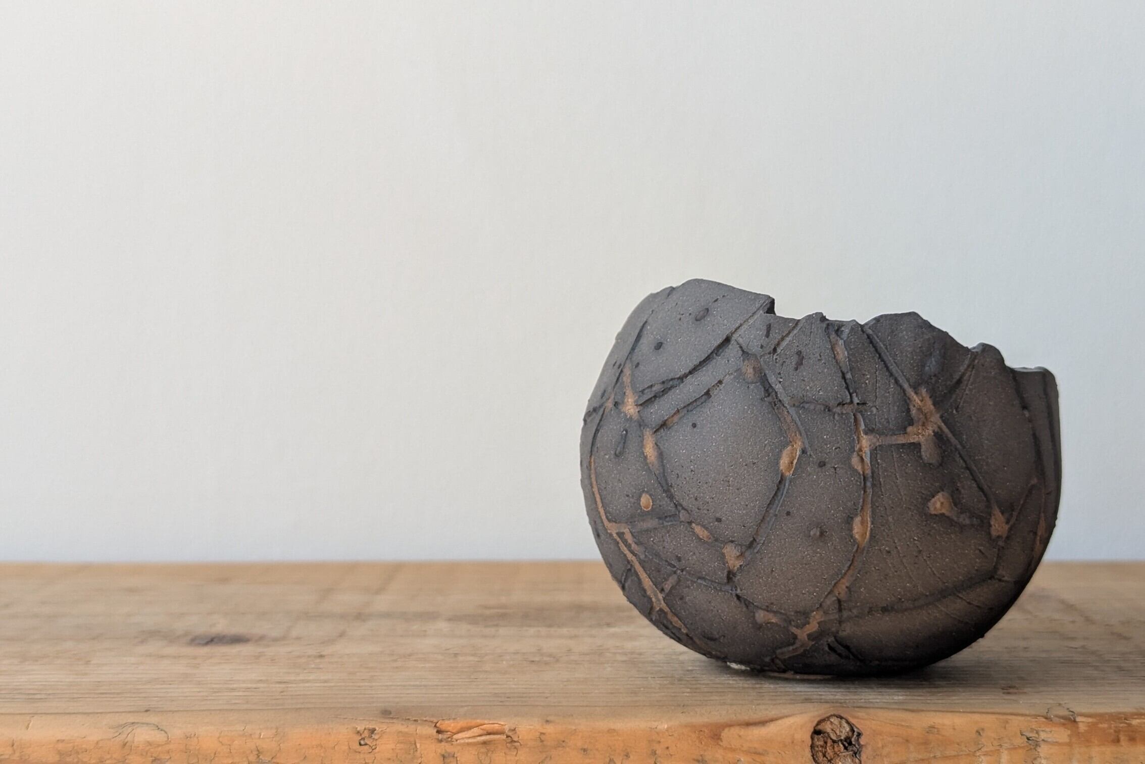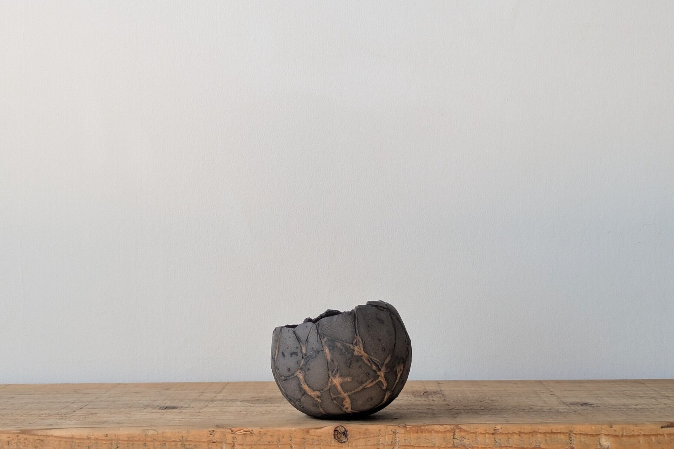 球型に成型した陶土に激しいひび割れを作り金色の釉薬を流し込みました。金色と黒色のカラーバランスが美しい隕石の様なデザインの器です。