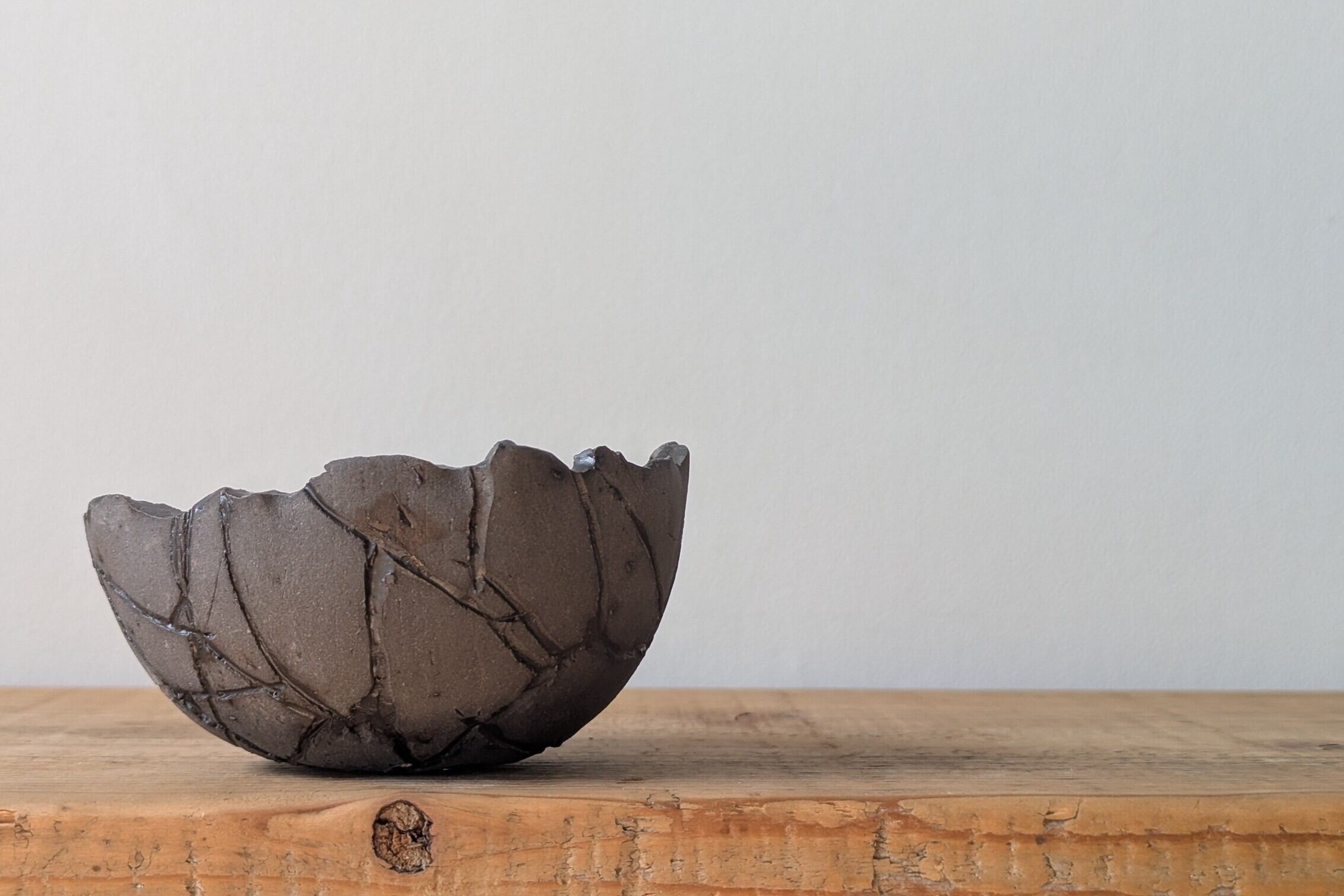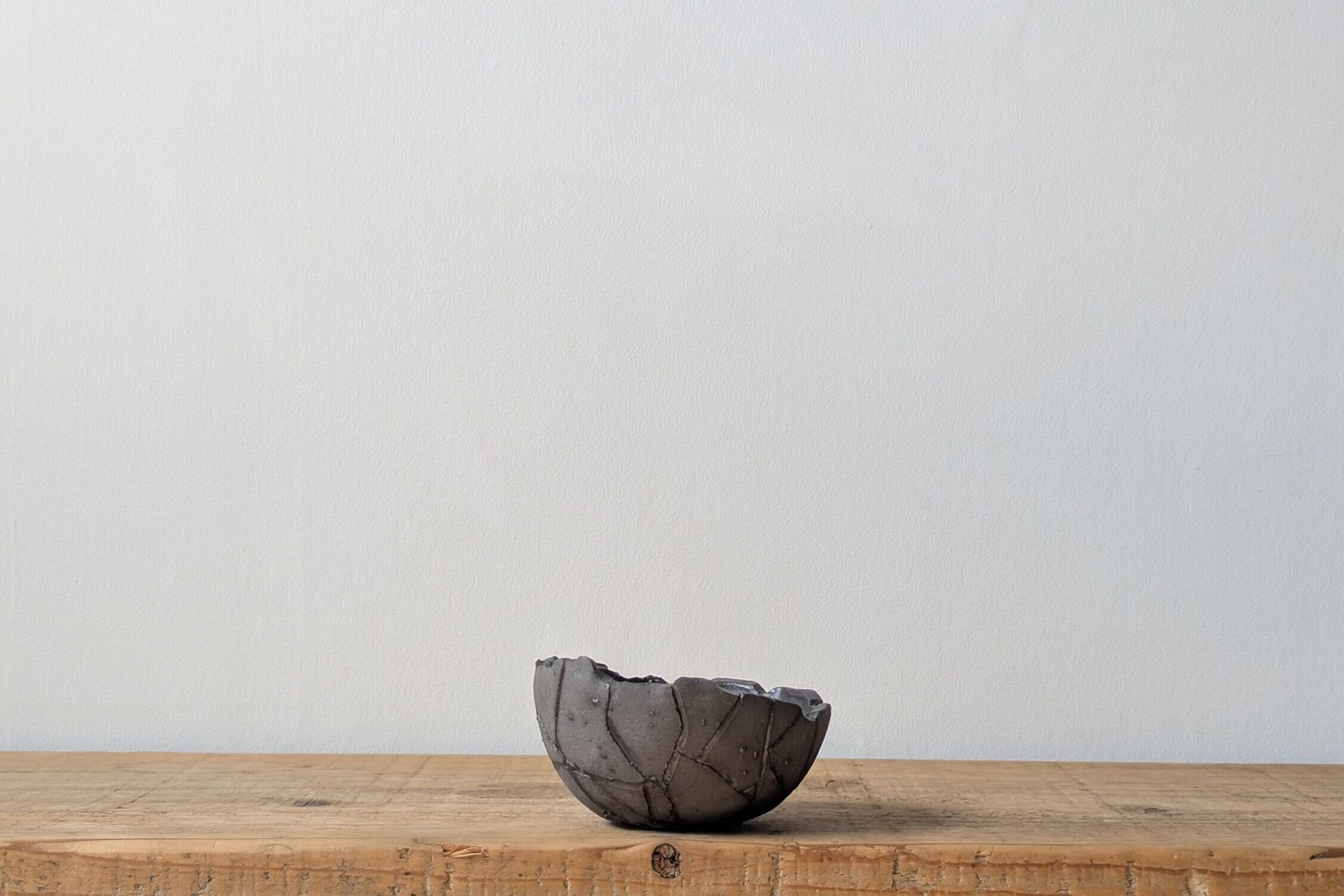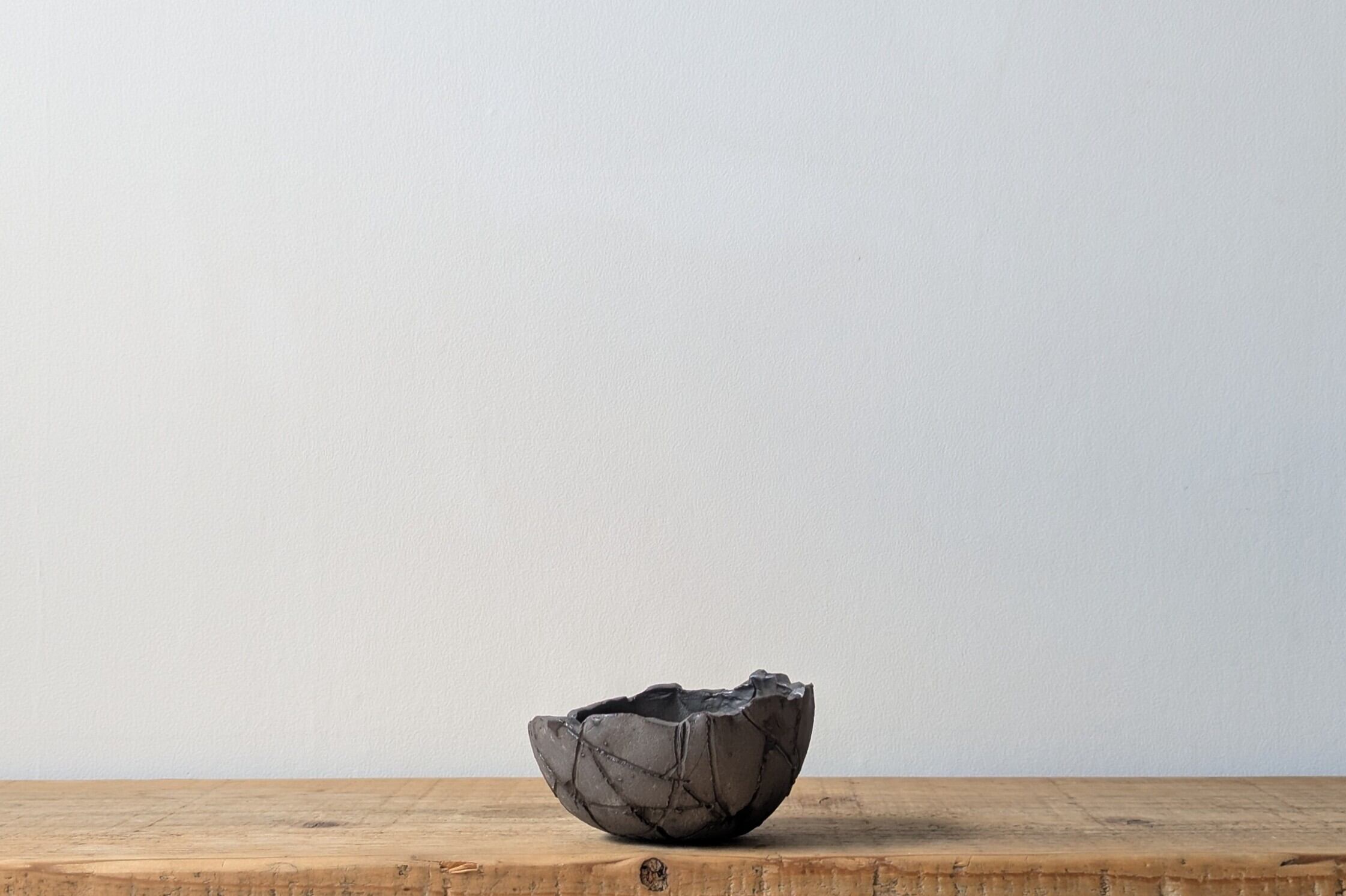 お椀型に成型した陶土に激しいひび割れを作り金色の釉薬を流し込みました。金色と黒色のカラーバランスが美しい隕石の様なデザインの器です。