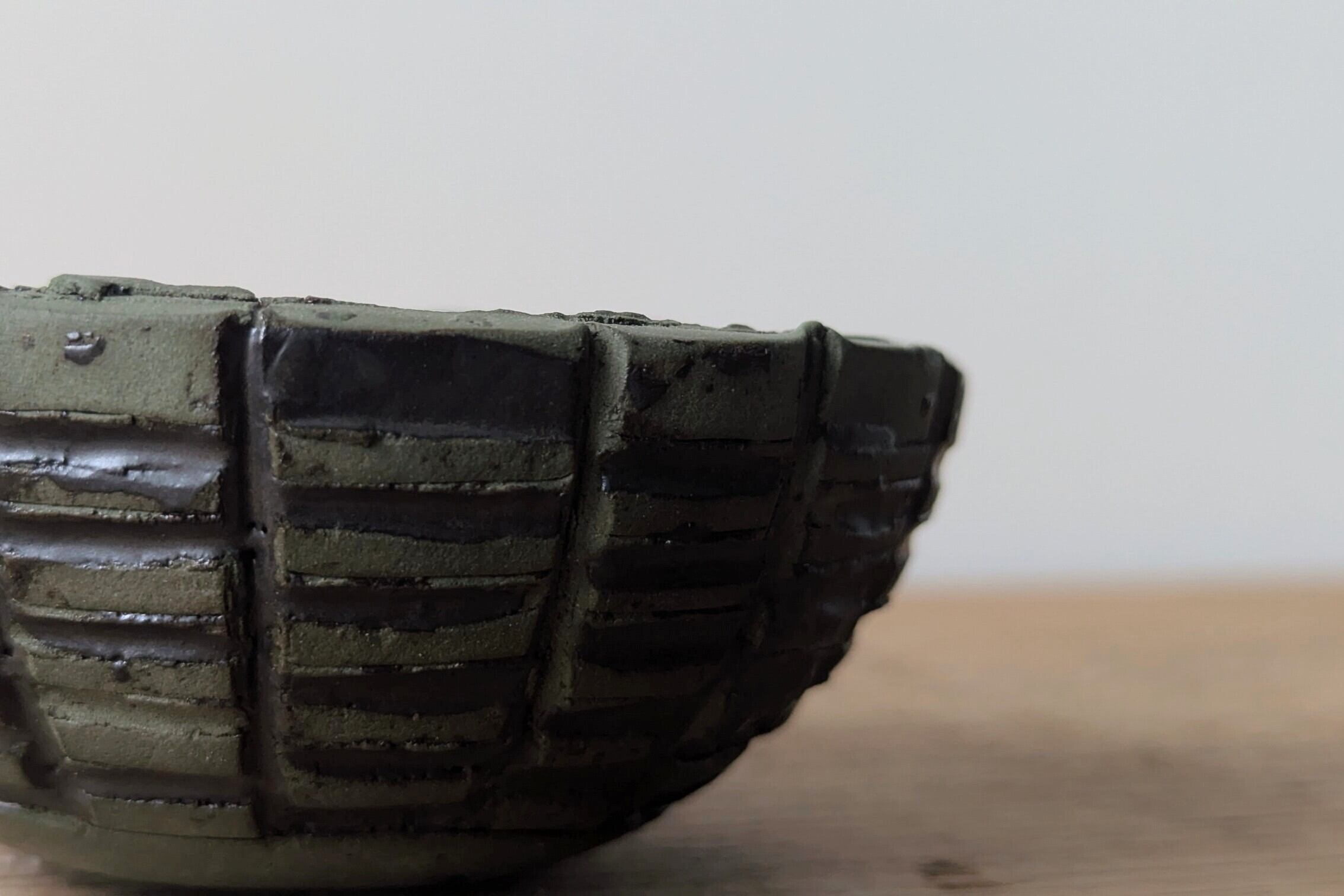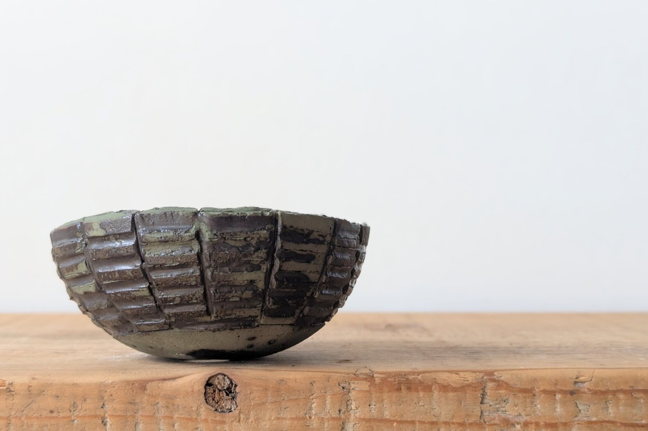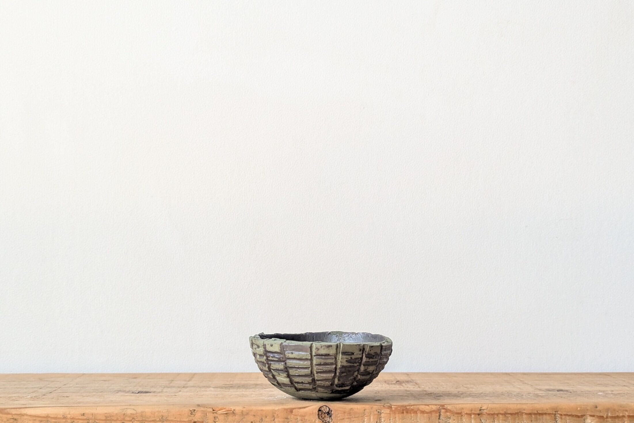 球型に成型した陶土にバランスよくライン状に削り、マットブラックの釉薬を注ぎました。グリーンとの色合いが重厚感のある仕上がりになりました。ゴツゴツした植物と併せるととてつもなく強い雰囲気になるでしょう。