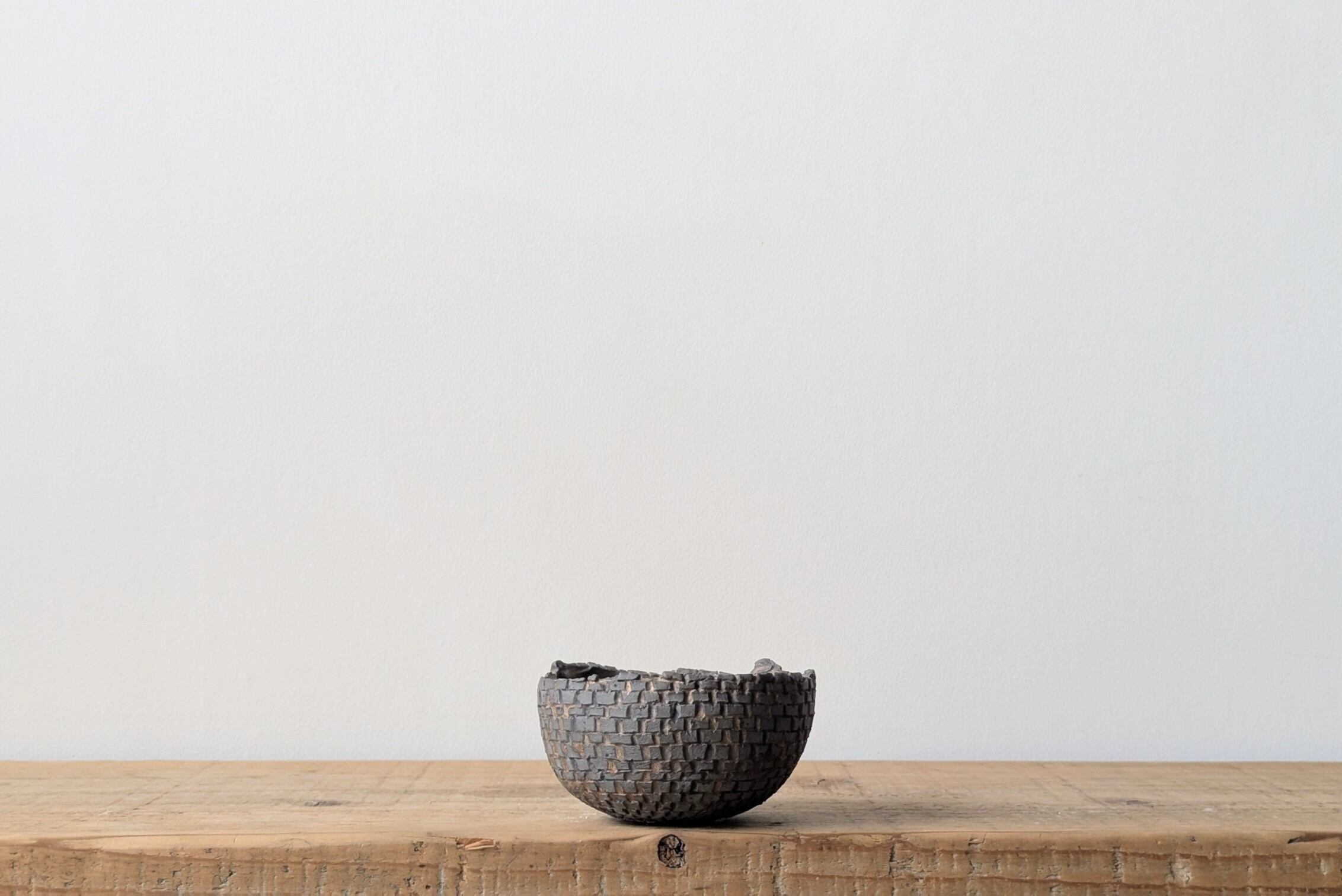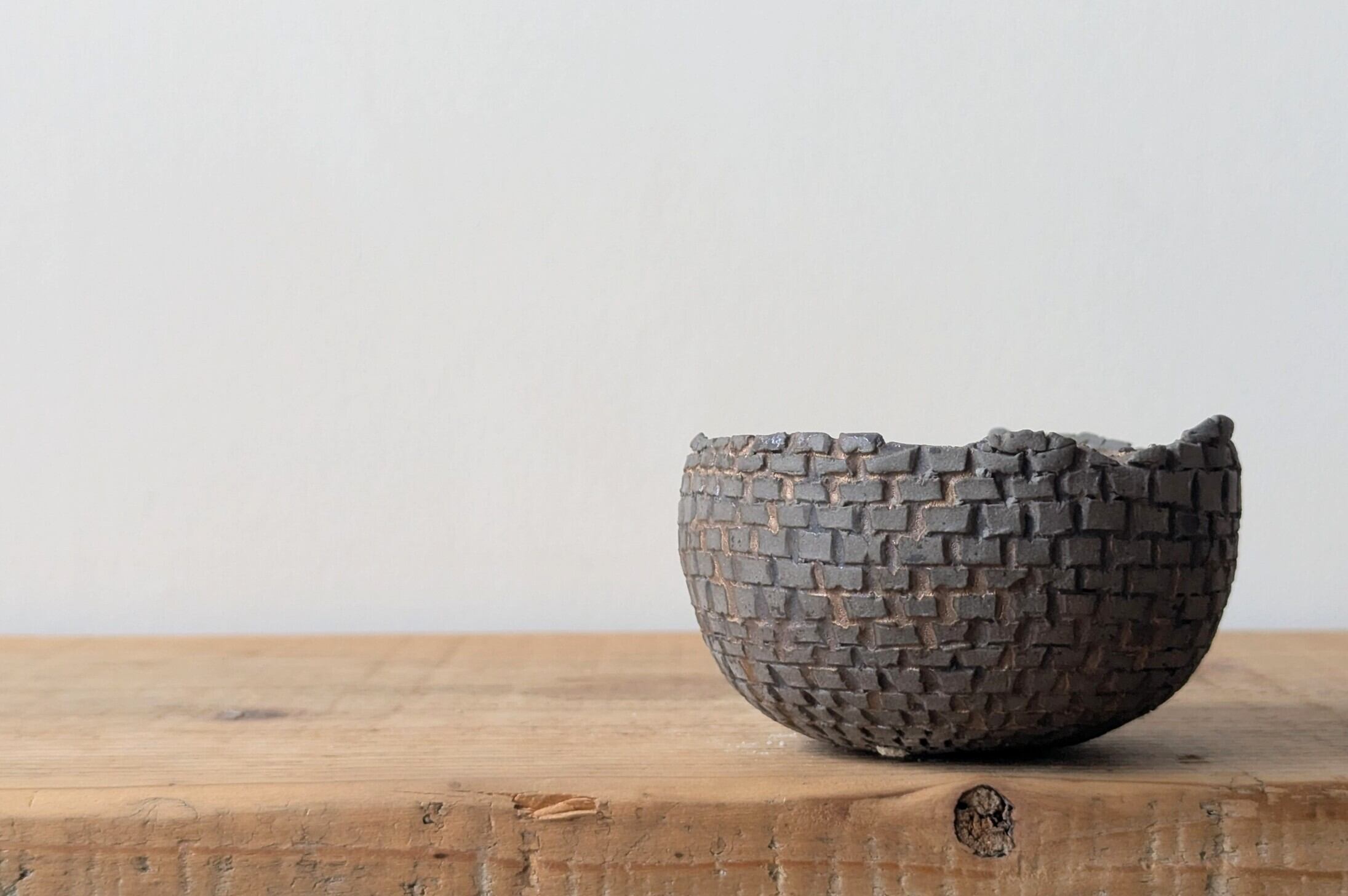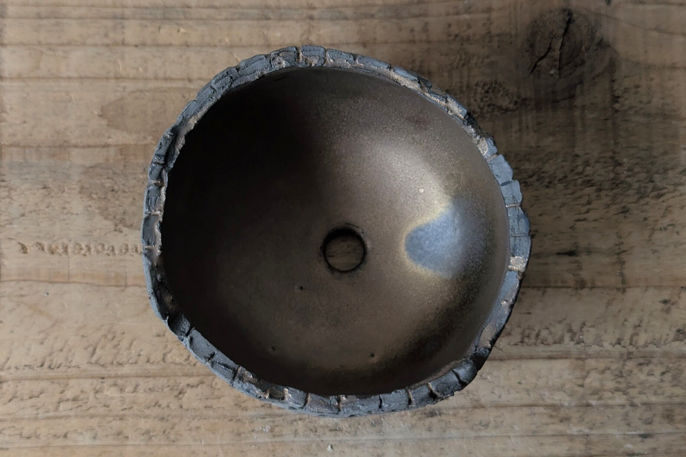 お椀型に成型した陶土にレンガの壁の様な模様を施しアンティークゴールドの釉薬を溝に施しました。まるで中世ヨーロッパの城壁の様な雰囲気で、植物を渋くカッコよく演出できる器です。