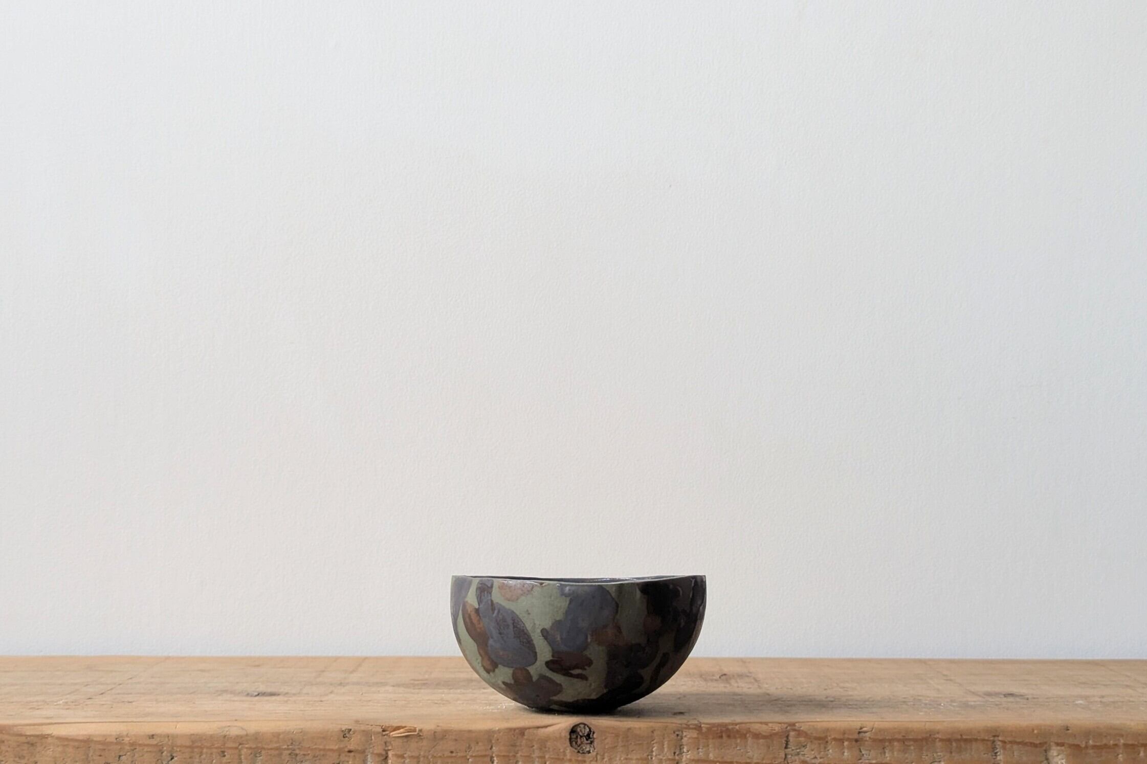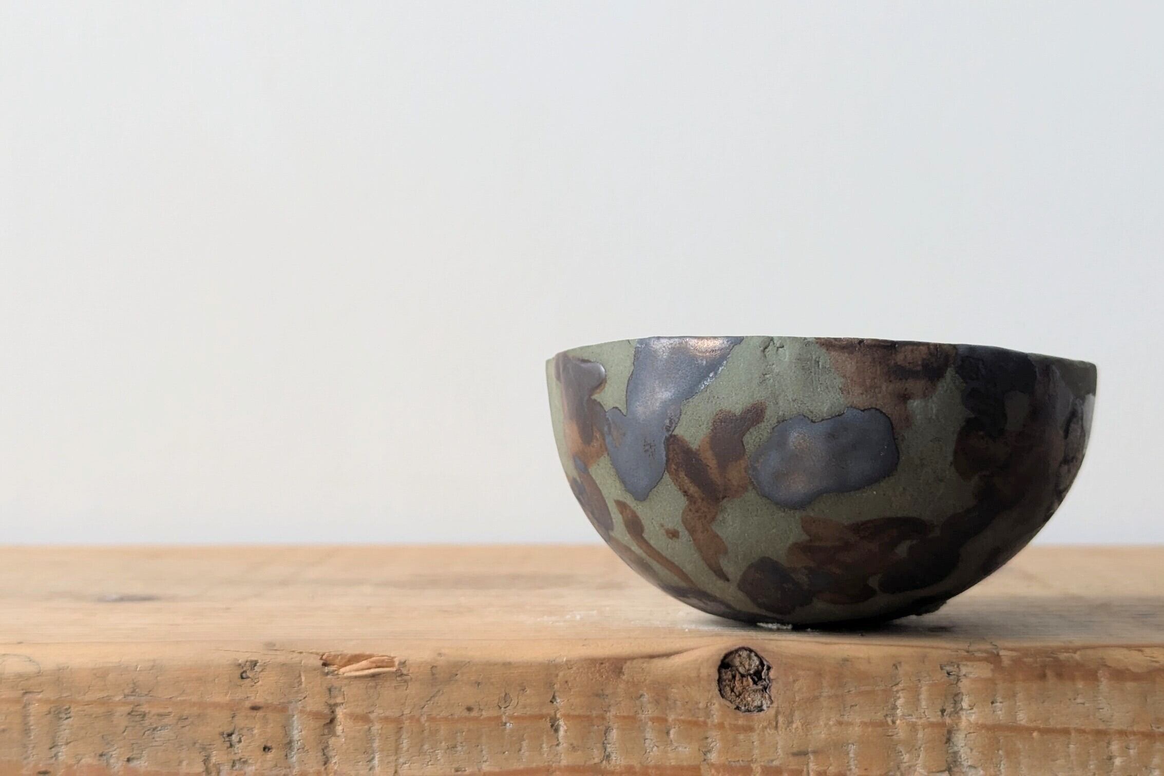 お椀型に成型した陶土に迷彩風にブラック野釉薬とゴールドの釉薬を施しました。ありそうで無かった迷彩柄の器です!植物との相性は抜群です。