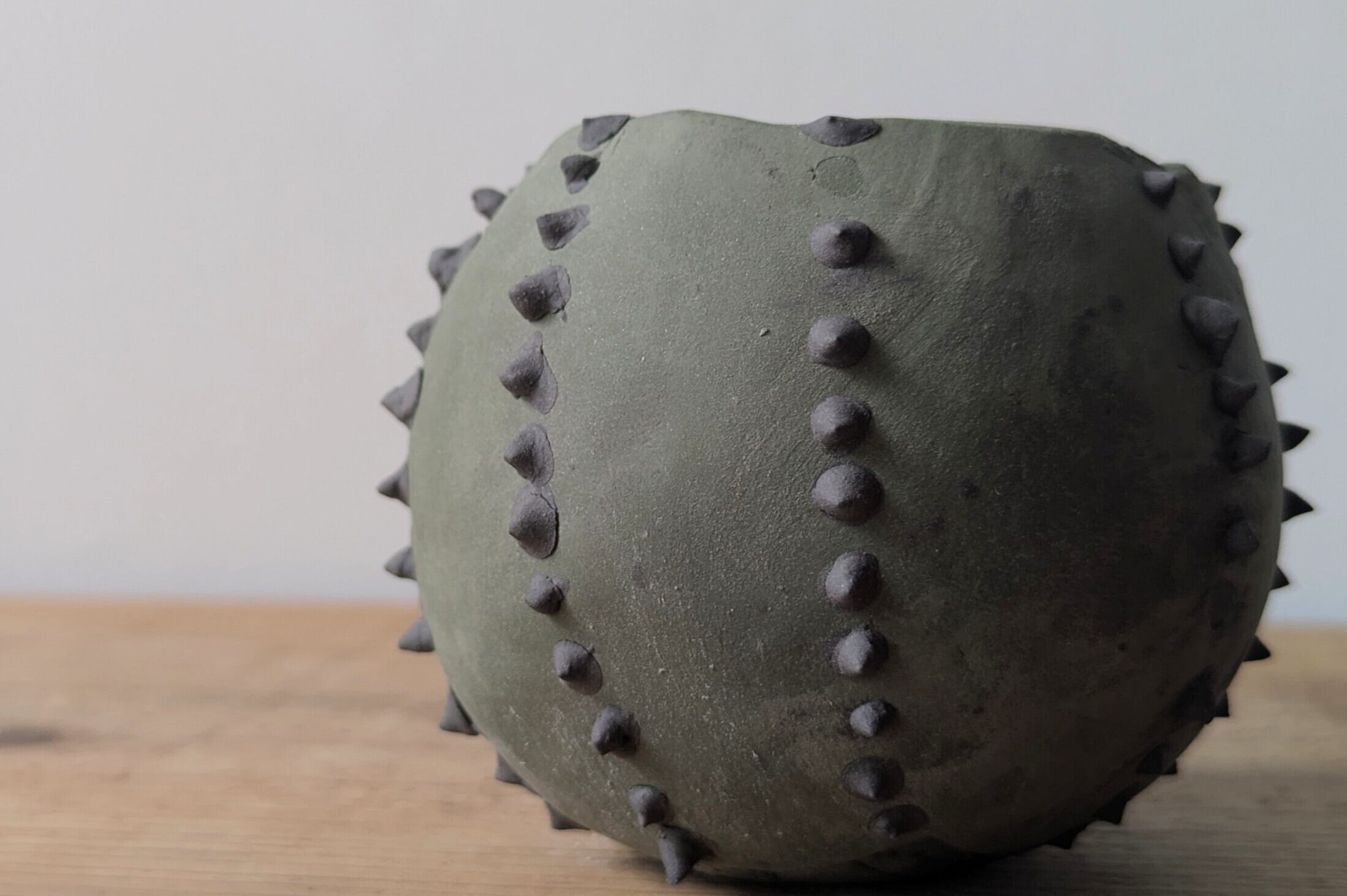 球型に成型したグレーの陶土に黒色のトゲを沢山つけ内側はアンティークゴールドの釉薬で仕上げました。サボテンデザインなので接ぎ木風の仕立を楽しめます。