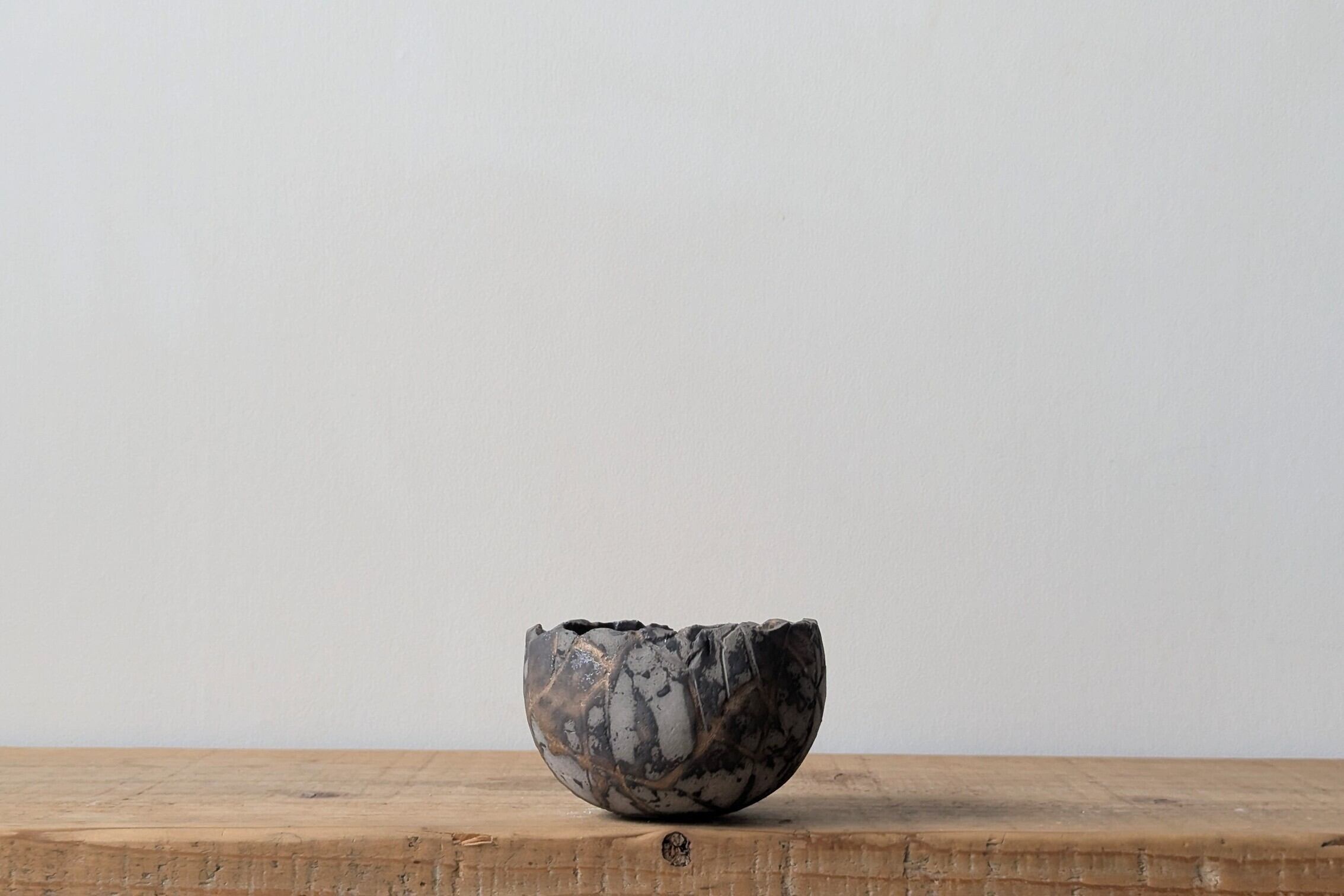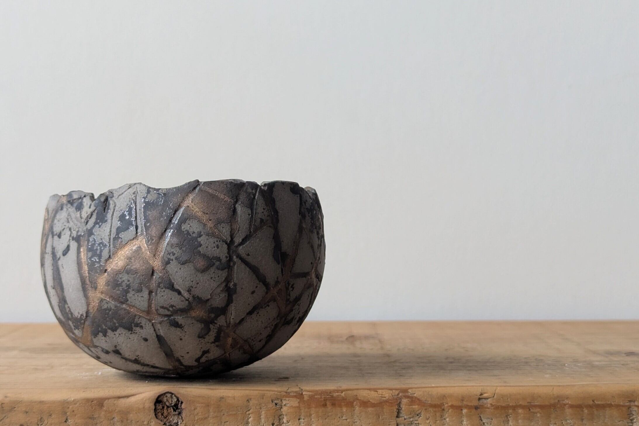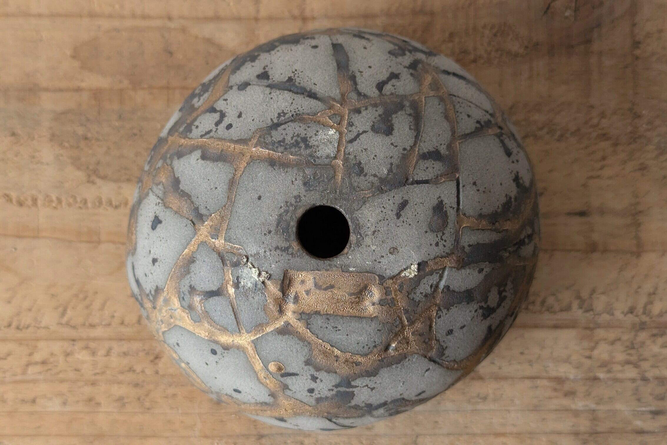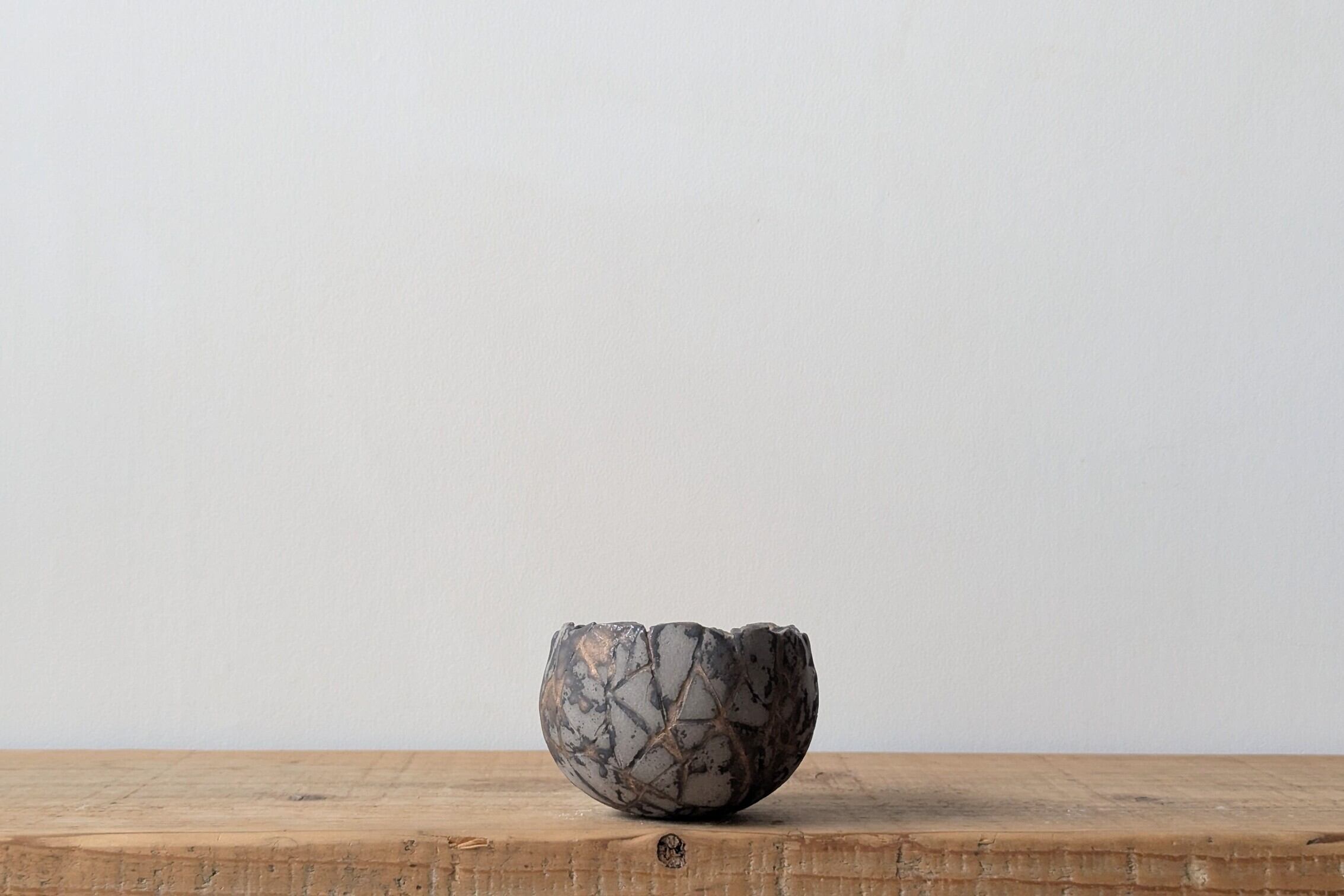 球型に成型した陶土に激しいひび割れを作り金色の釉薬を流し込みました。グレーの下地に金色と黒色がカモ柄の様になり、独特なカラーバランスが美しい隕石の様なデザインの器です。