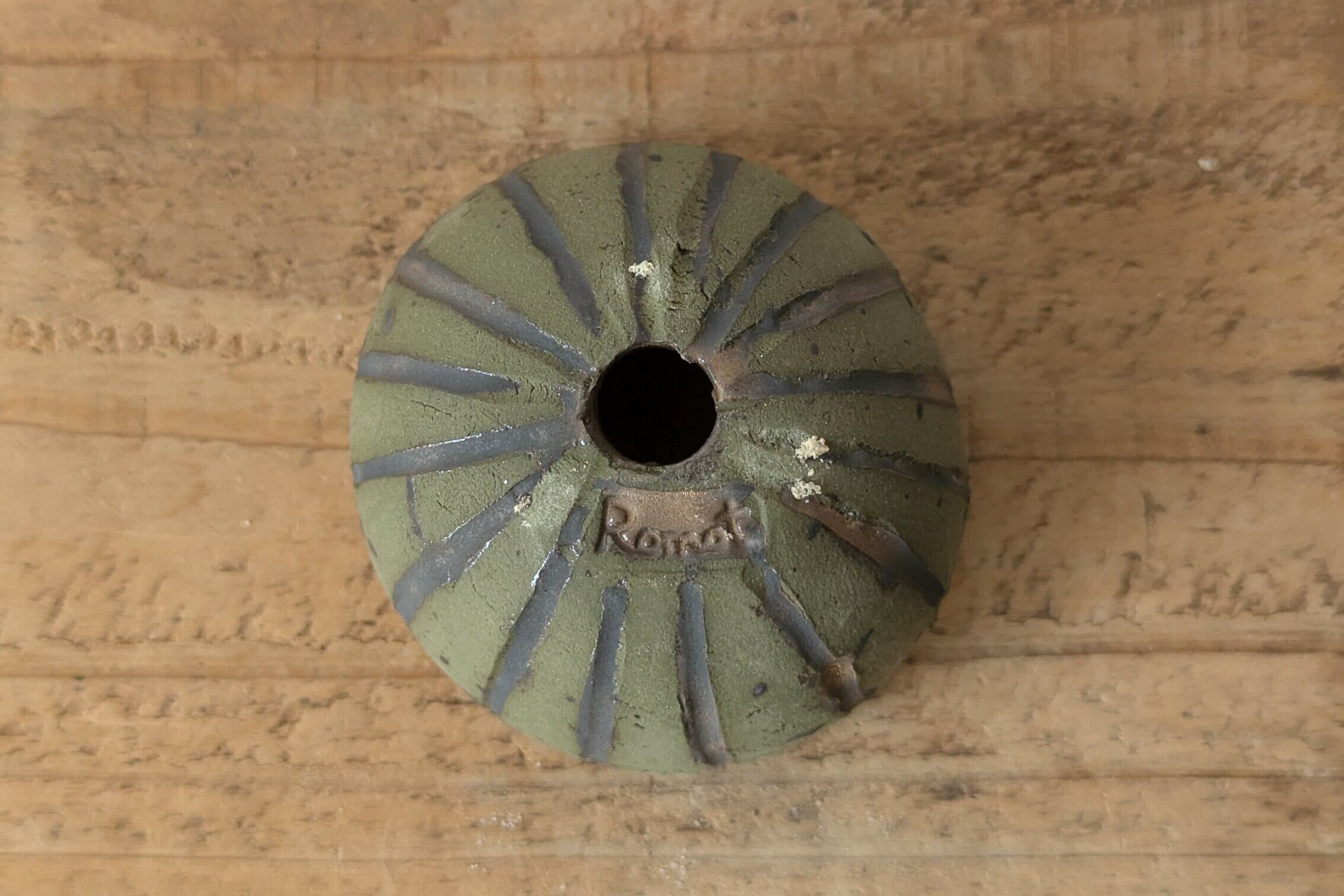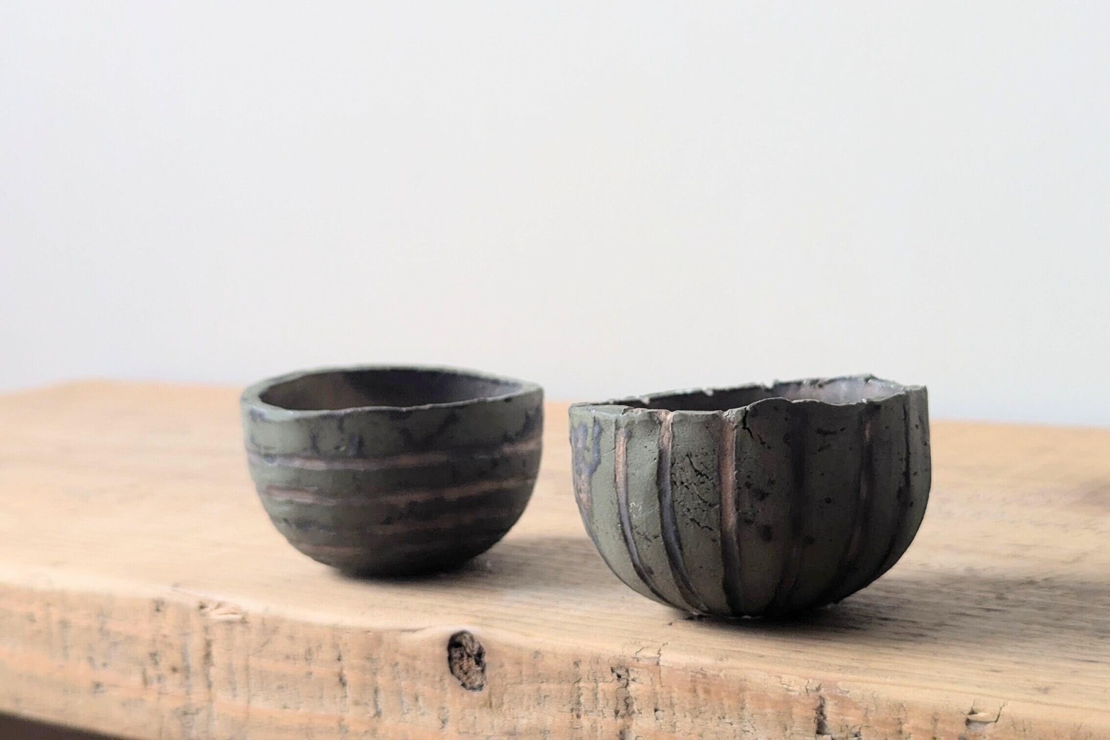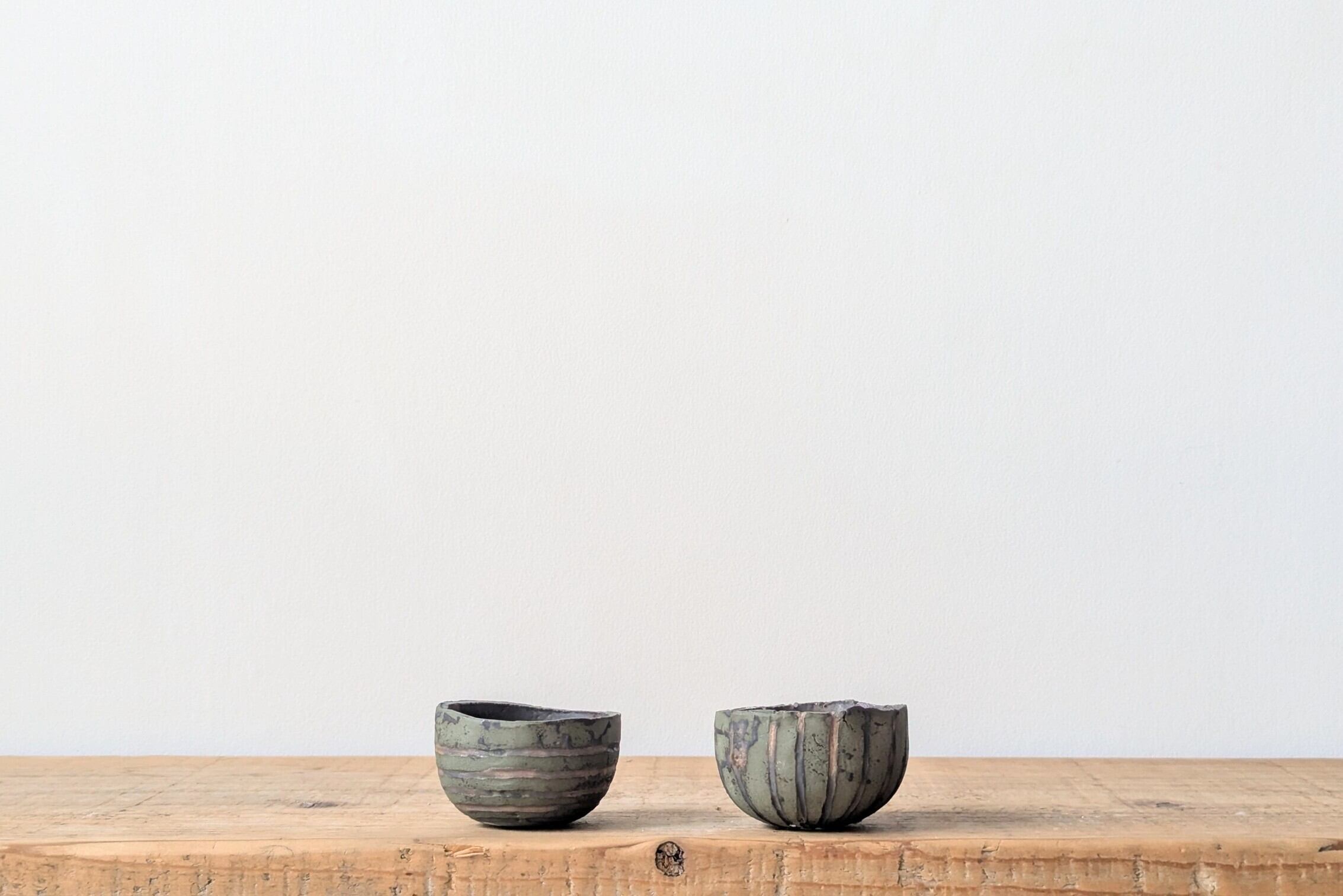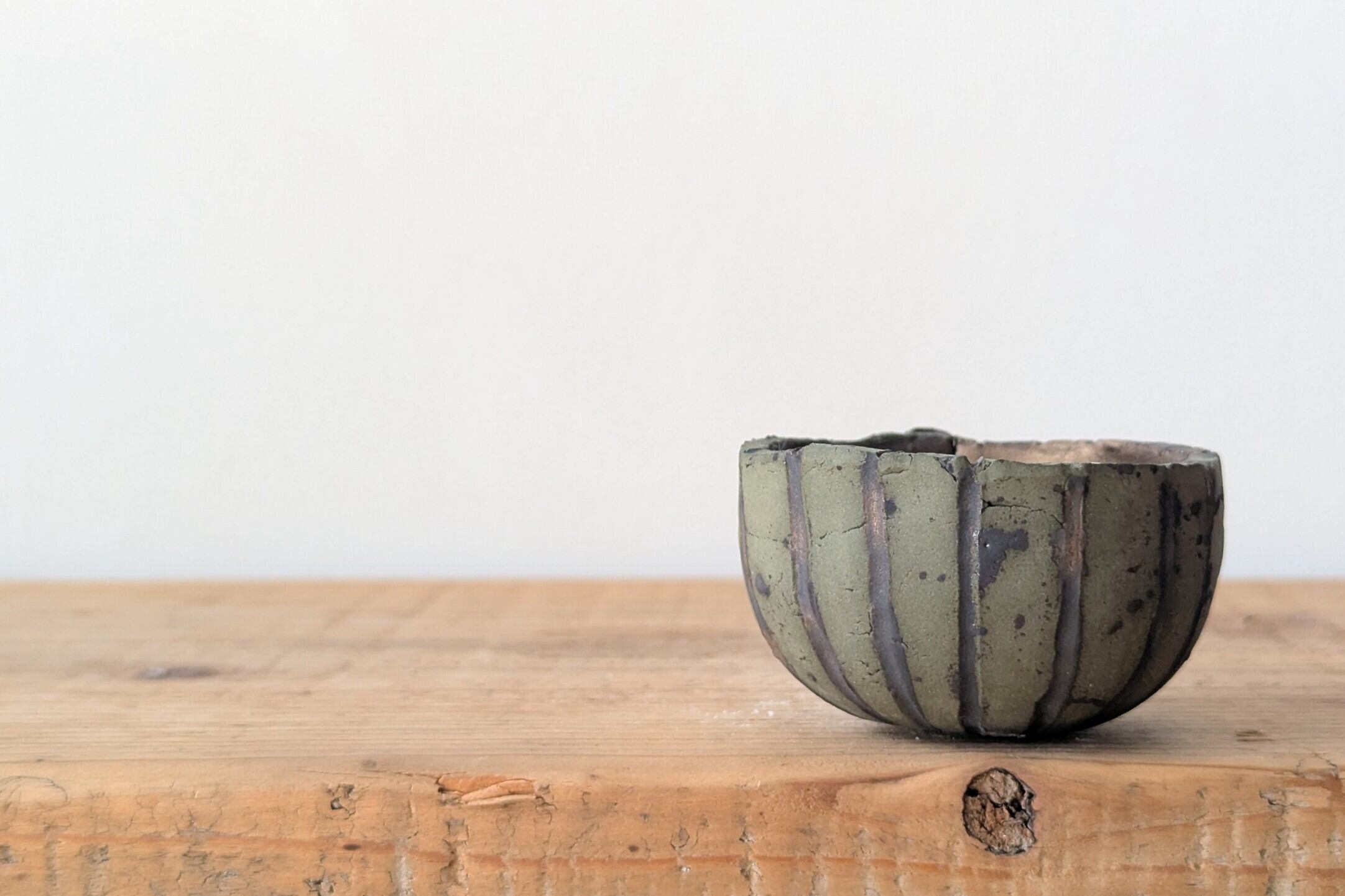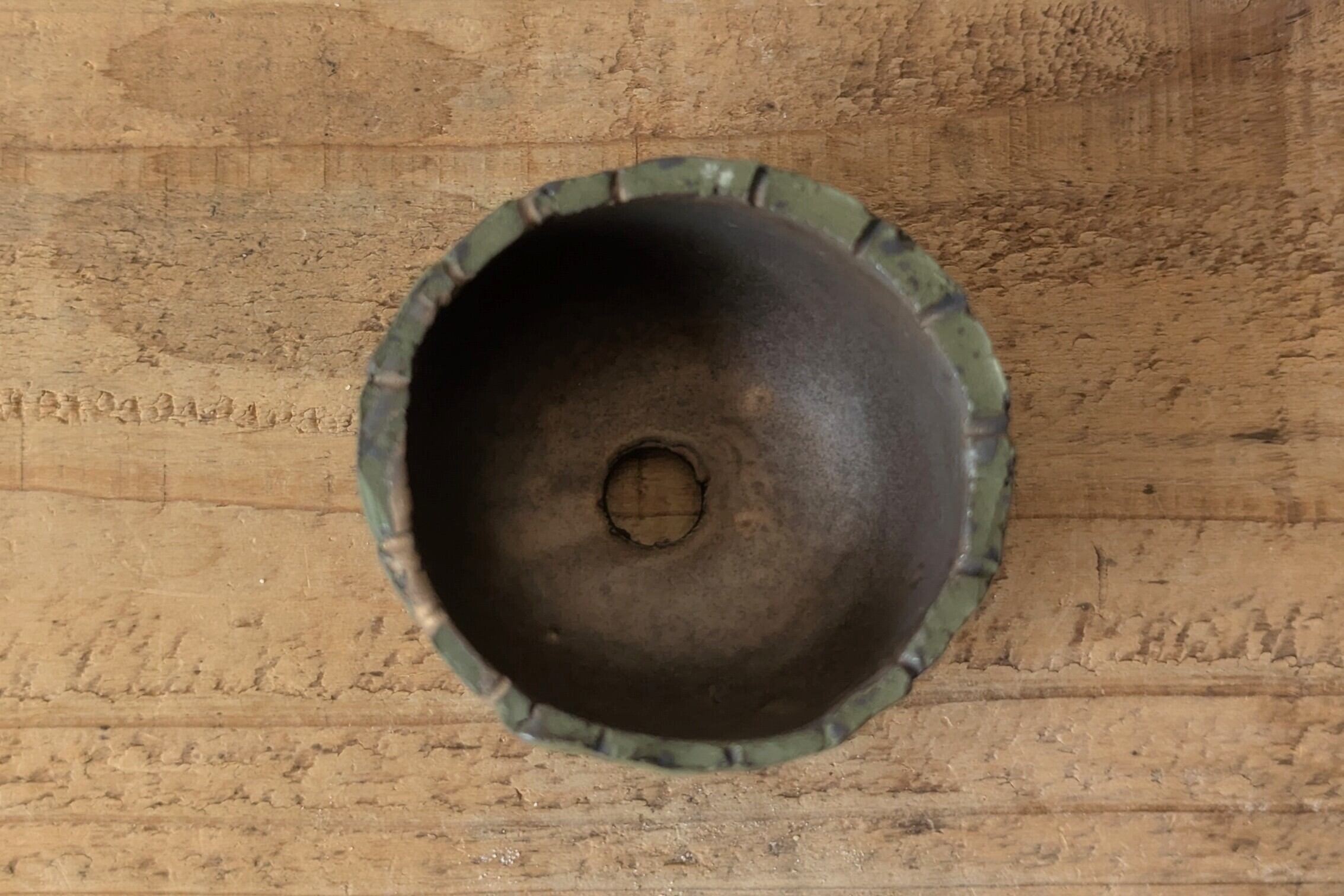 小さなお椀型に成型した成型した陶土にラインを入れてアンティークゴールドの釉薬で仕上げました。実生や小さな植物を入れると存在感のある仕立てになります。
