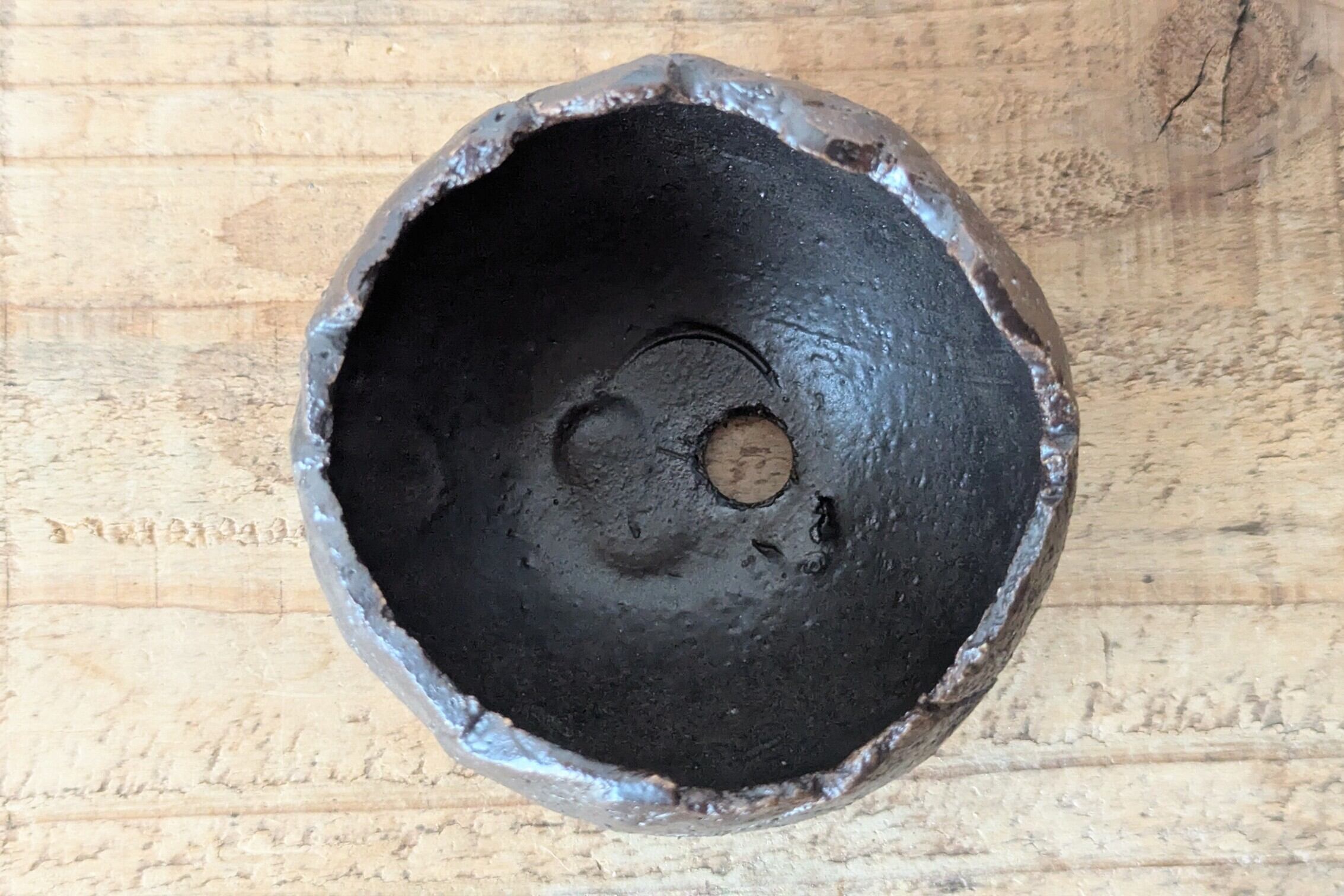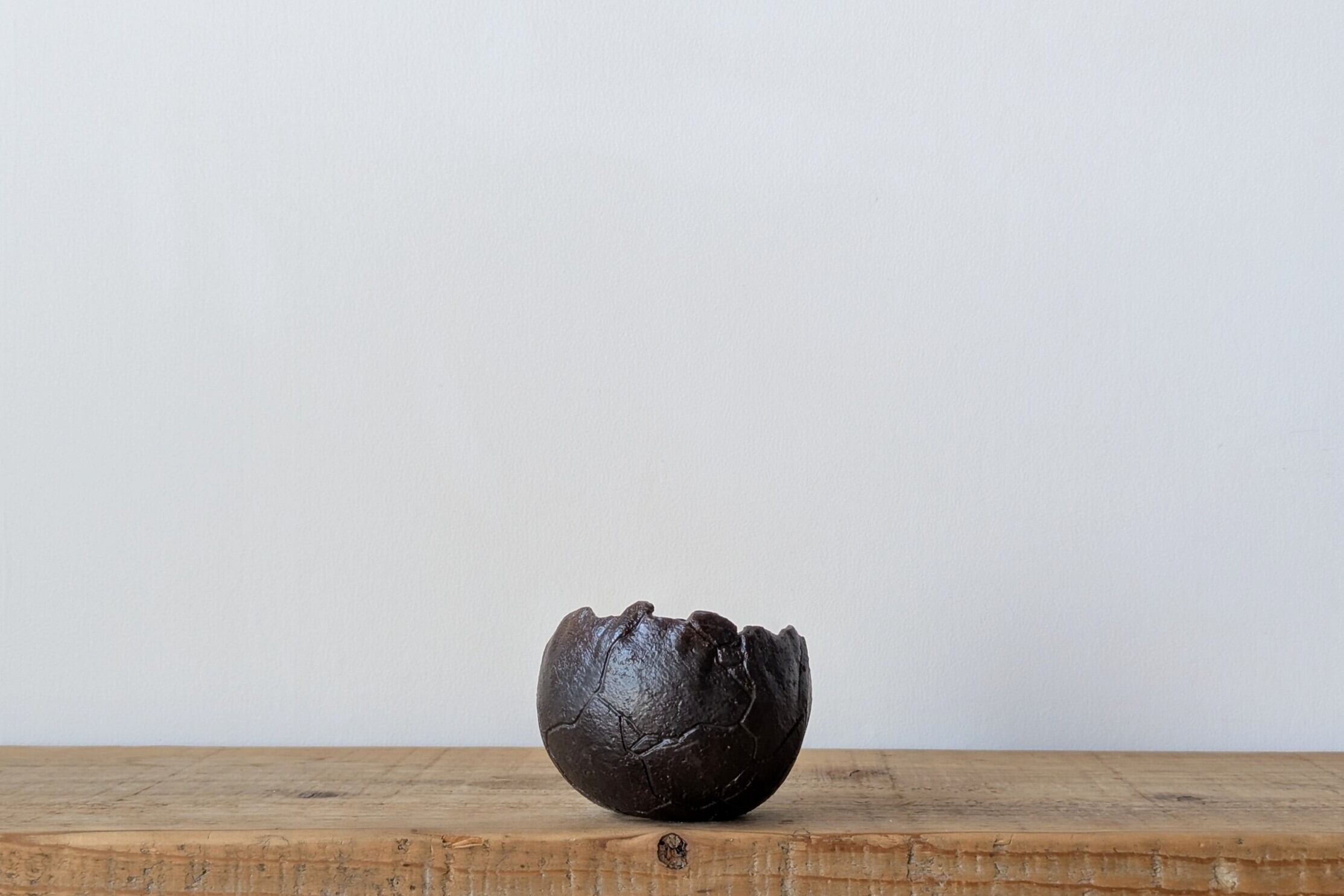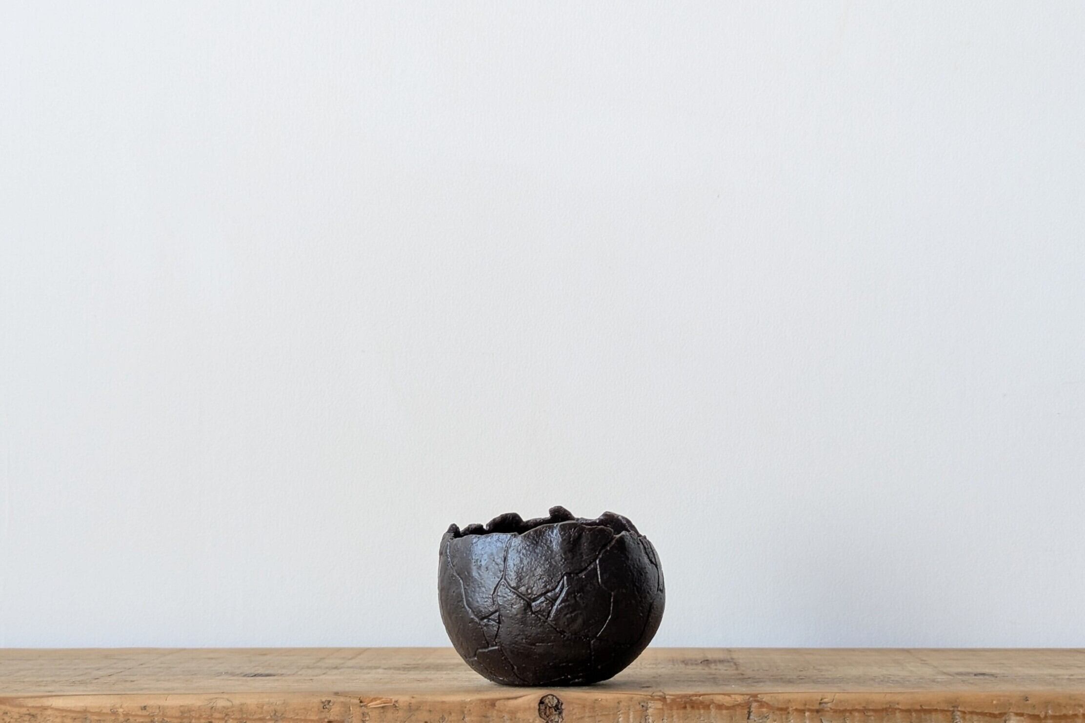 球型に成型した陶土に激しいひび割れを作り金色の釉薬を流し込みました。グレーの下地に金色と黒色がカモ柄の様になり、独特なカラーバランスが美しい隕石の様なデザインの器です。