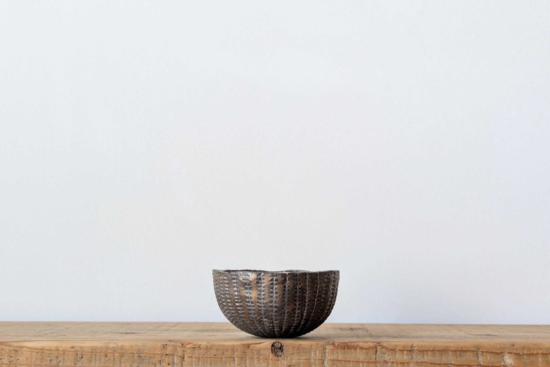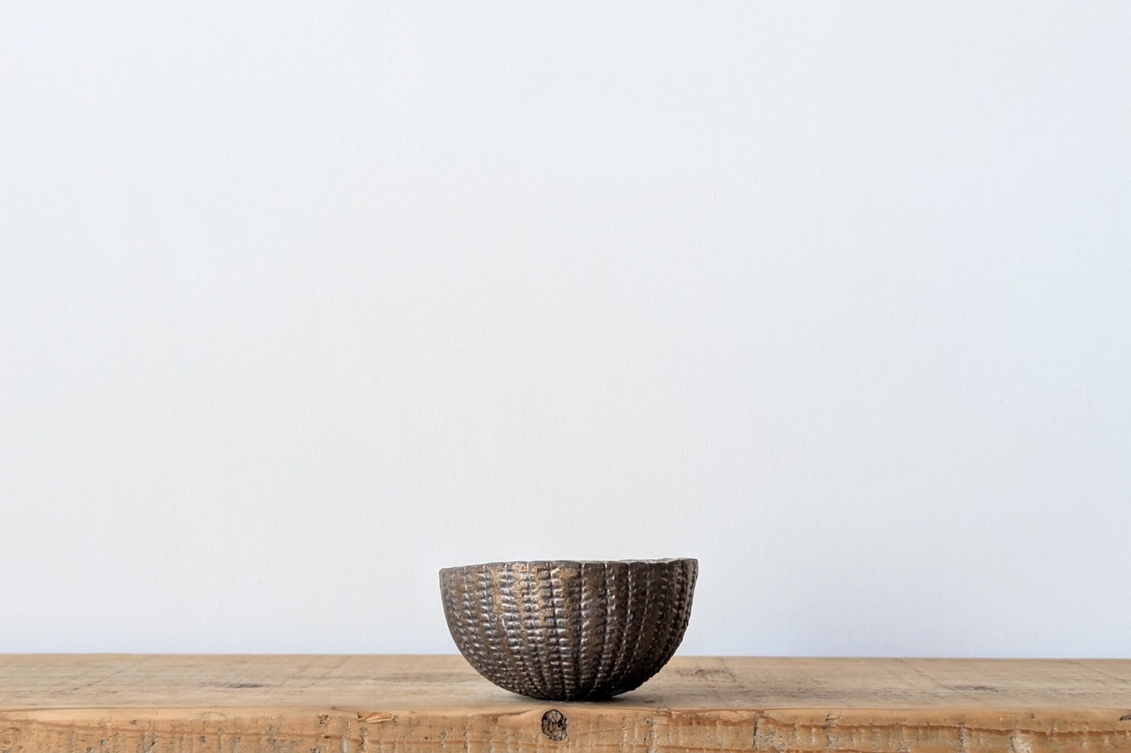 半円型に成型した陶土に模様を施し、釉薬で仕上げました。クラシックゴールドが渋くも豪華な雰囲気があり、実生や小さな植物を入れると存在感のある仕立てになります。