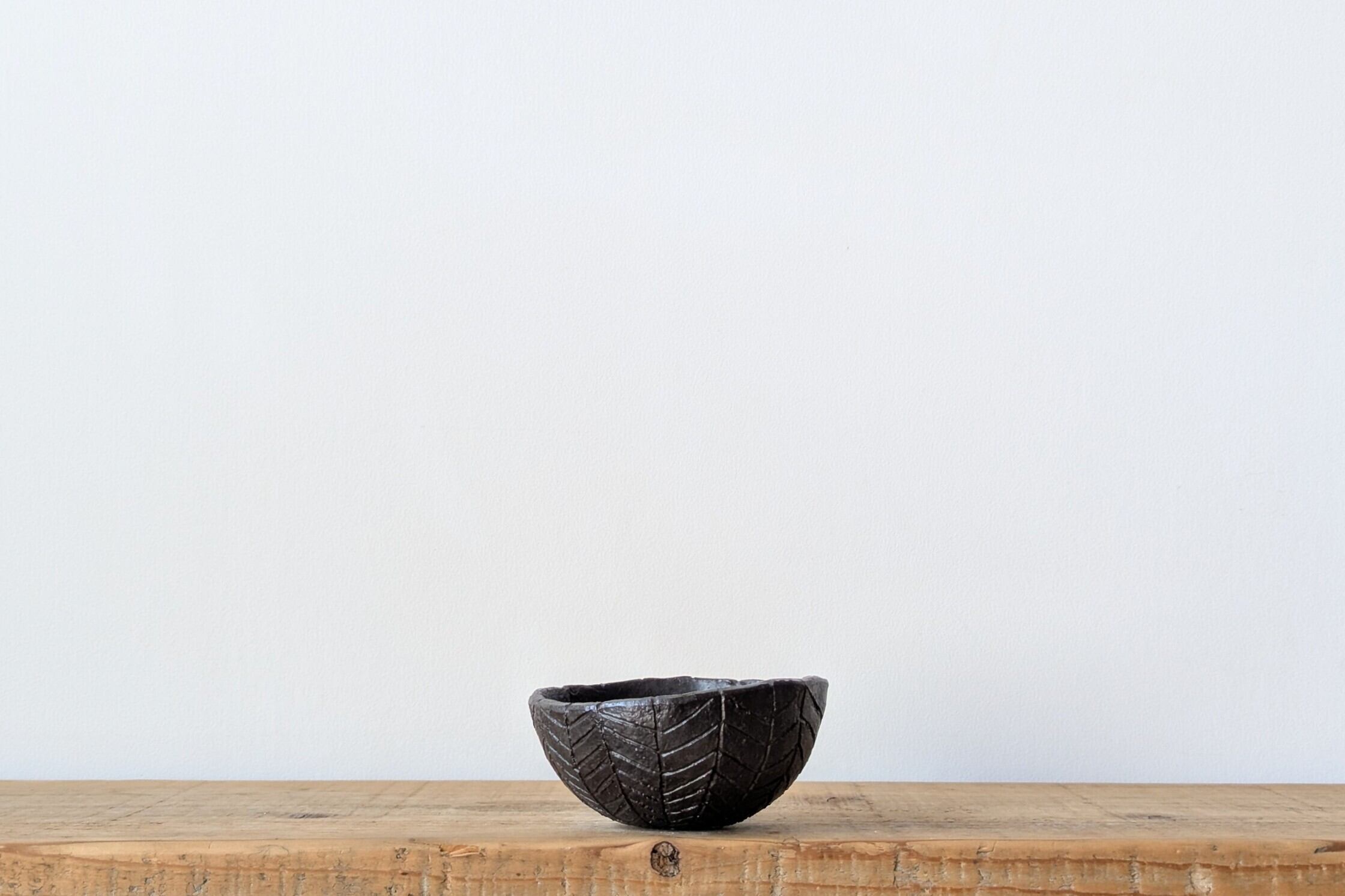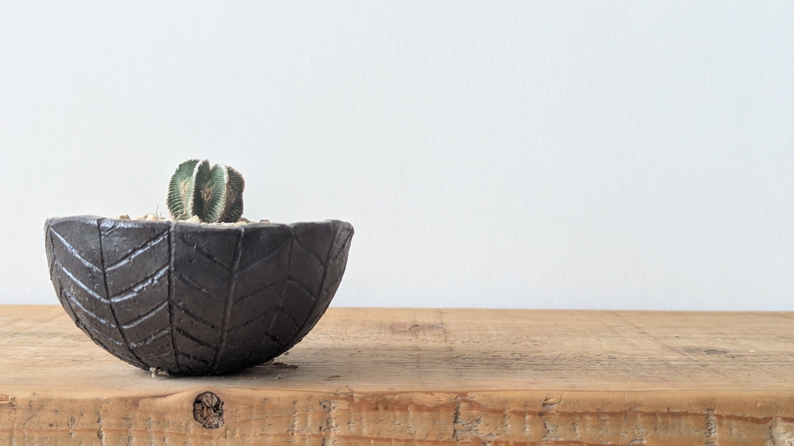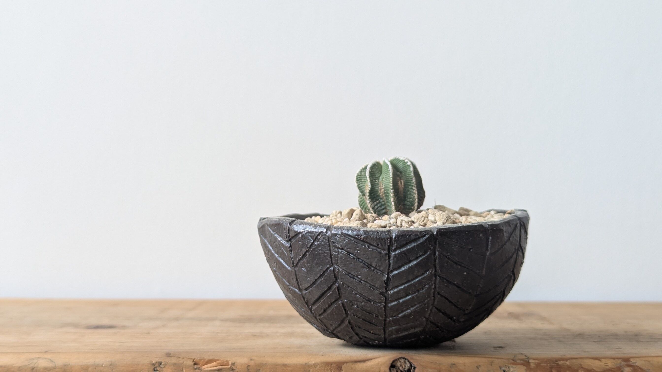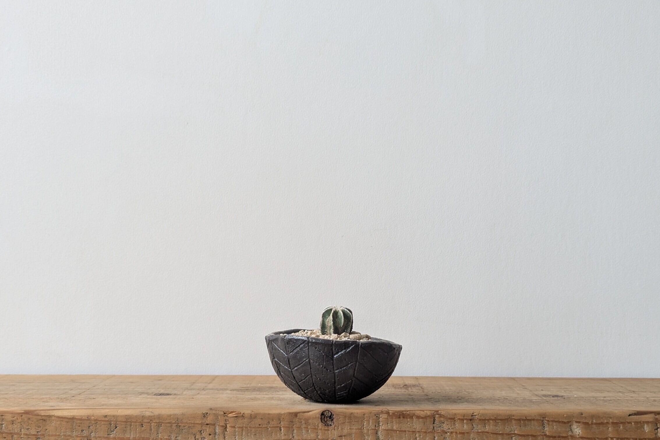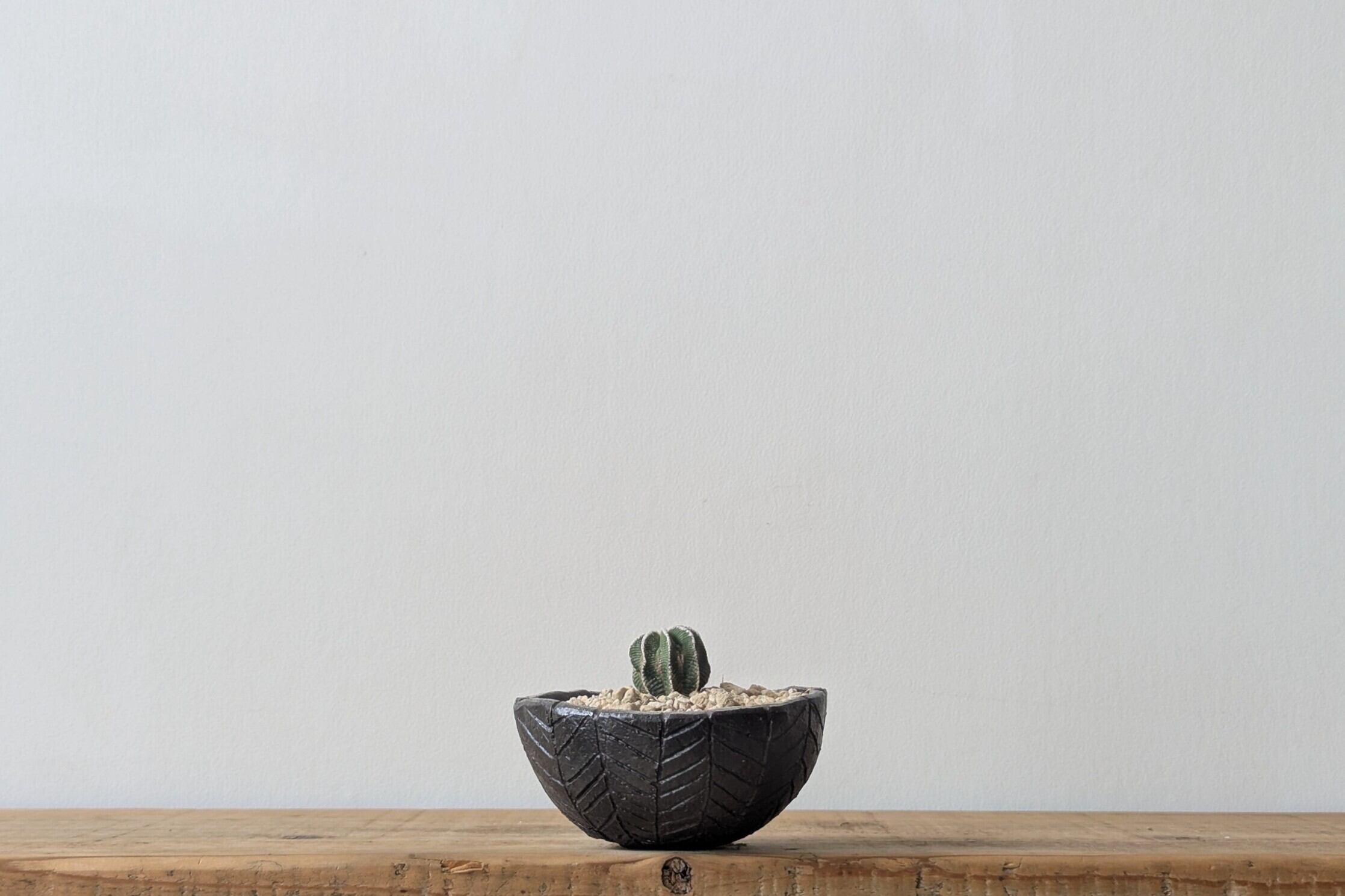 半円型に成型した陶土に模様を施し、マットな黒色の釉薬で仕上げました。シンプルながらも雰囲気があり、どんな植物にもマッチする仕立てになります。