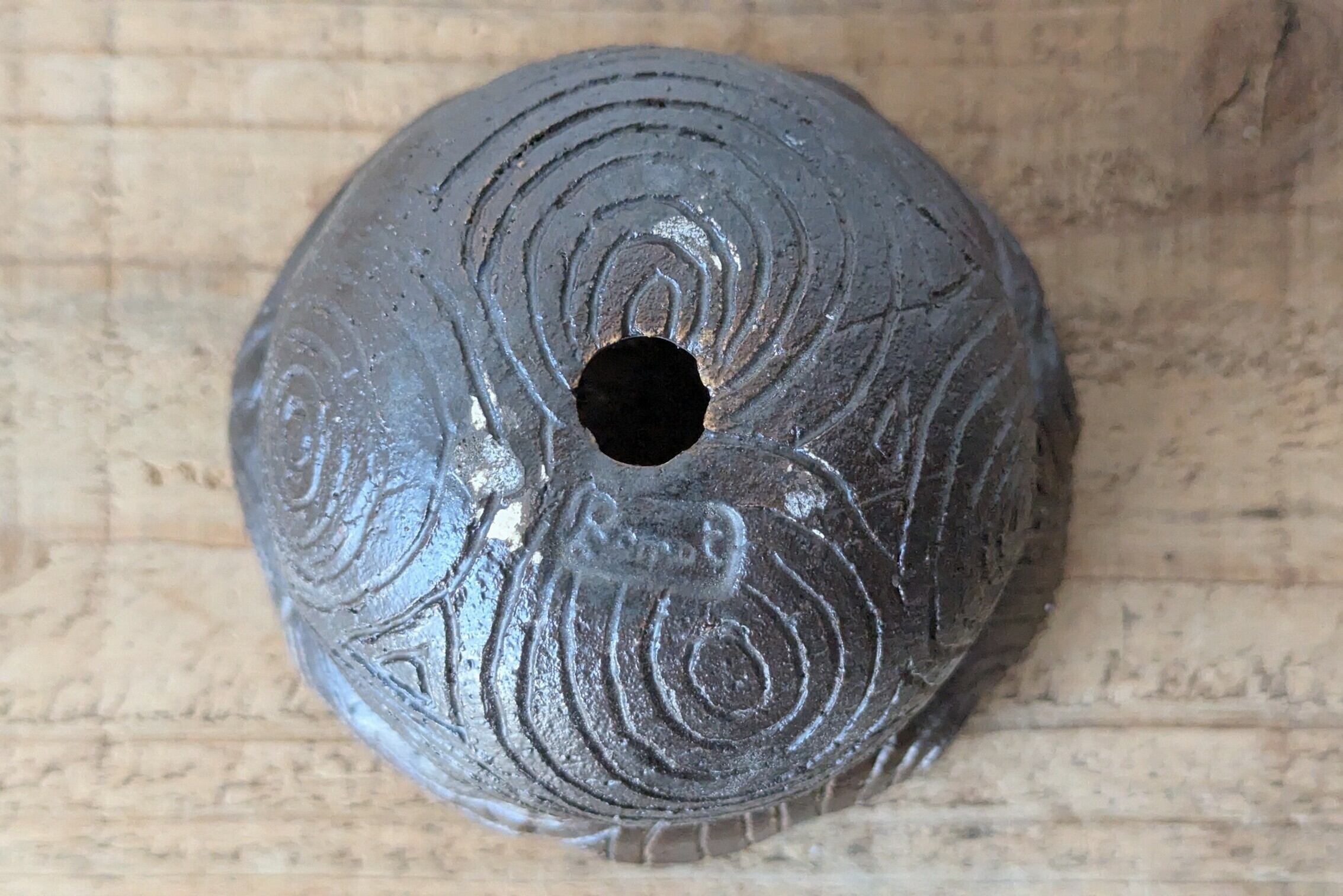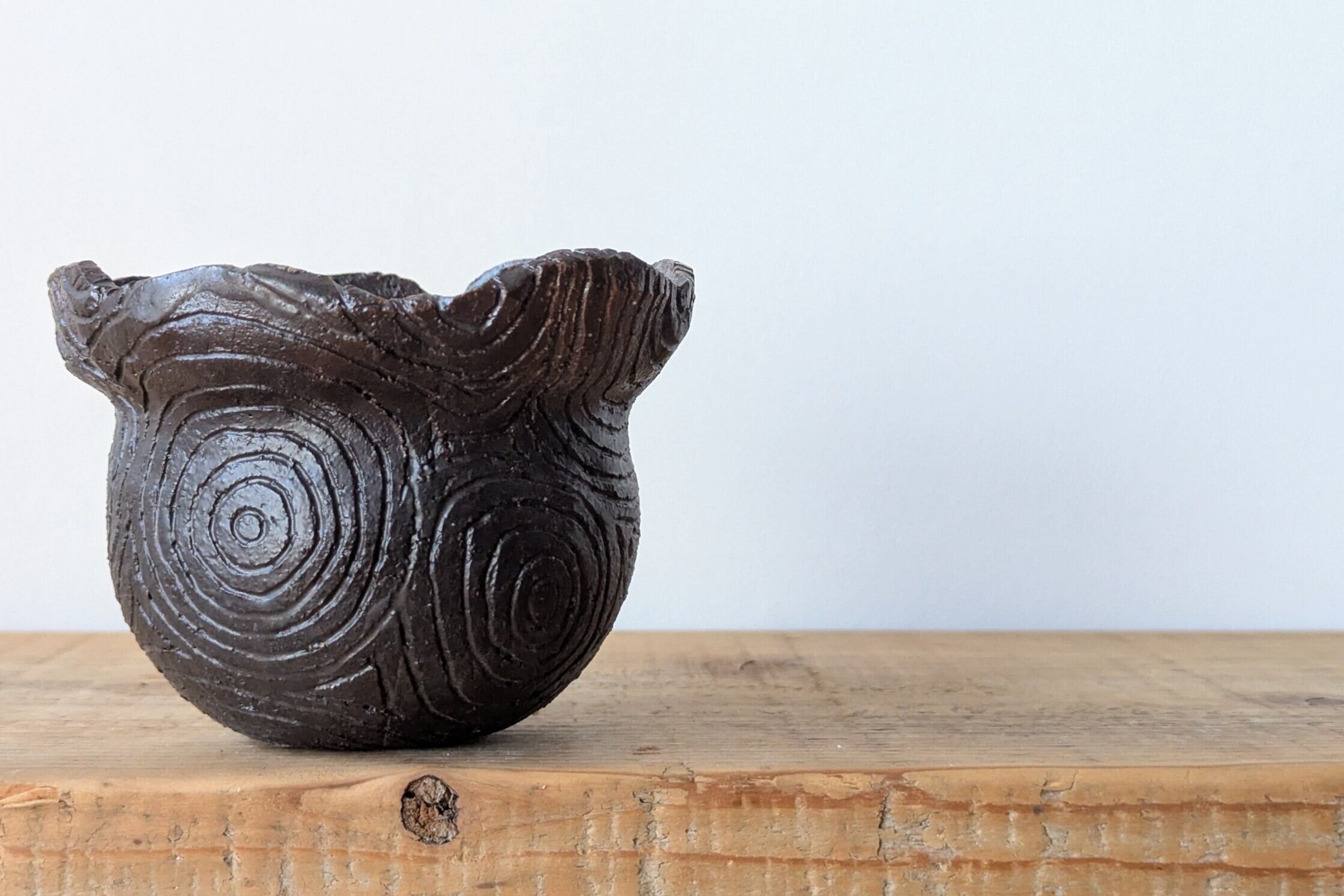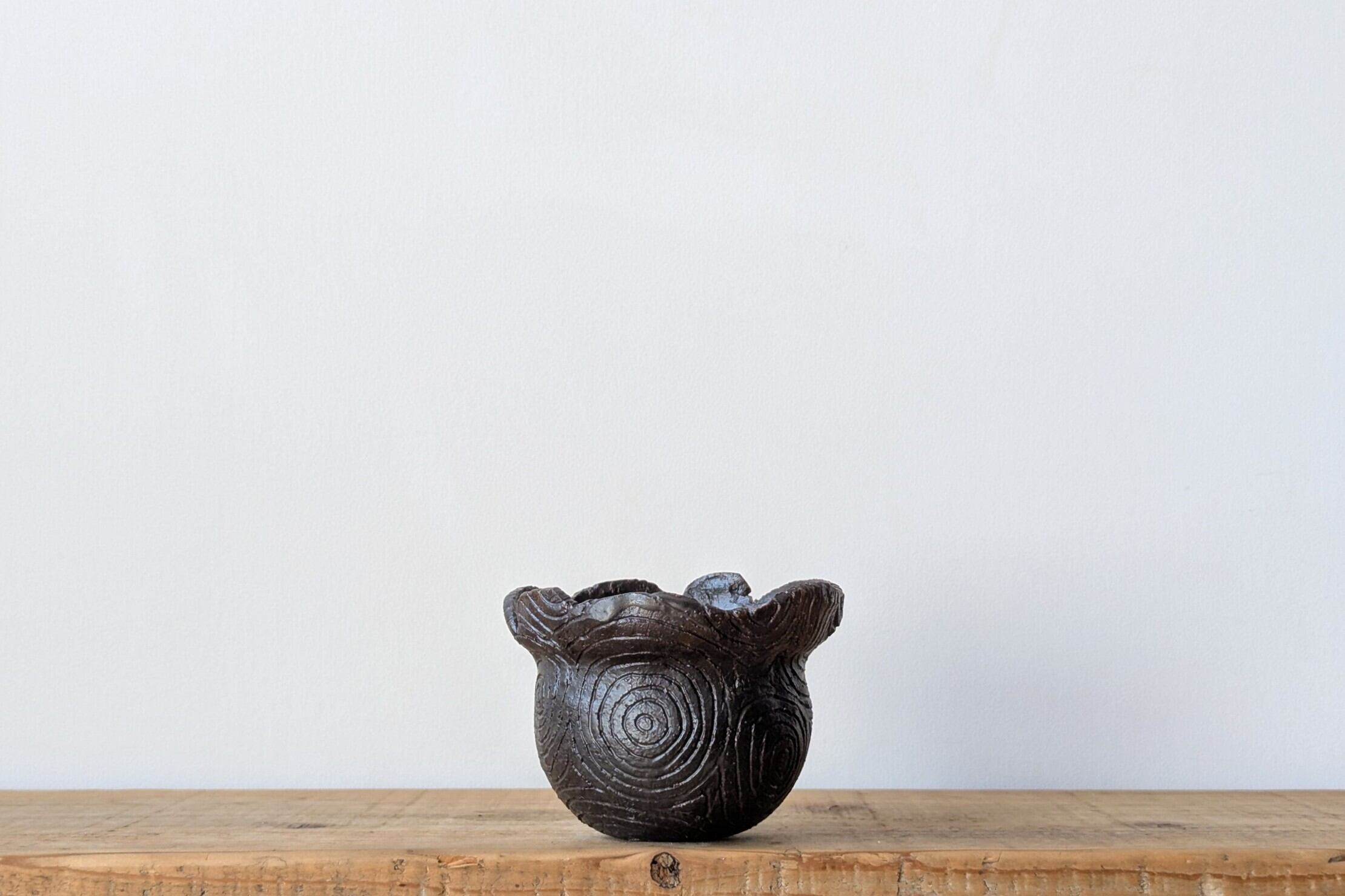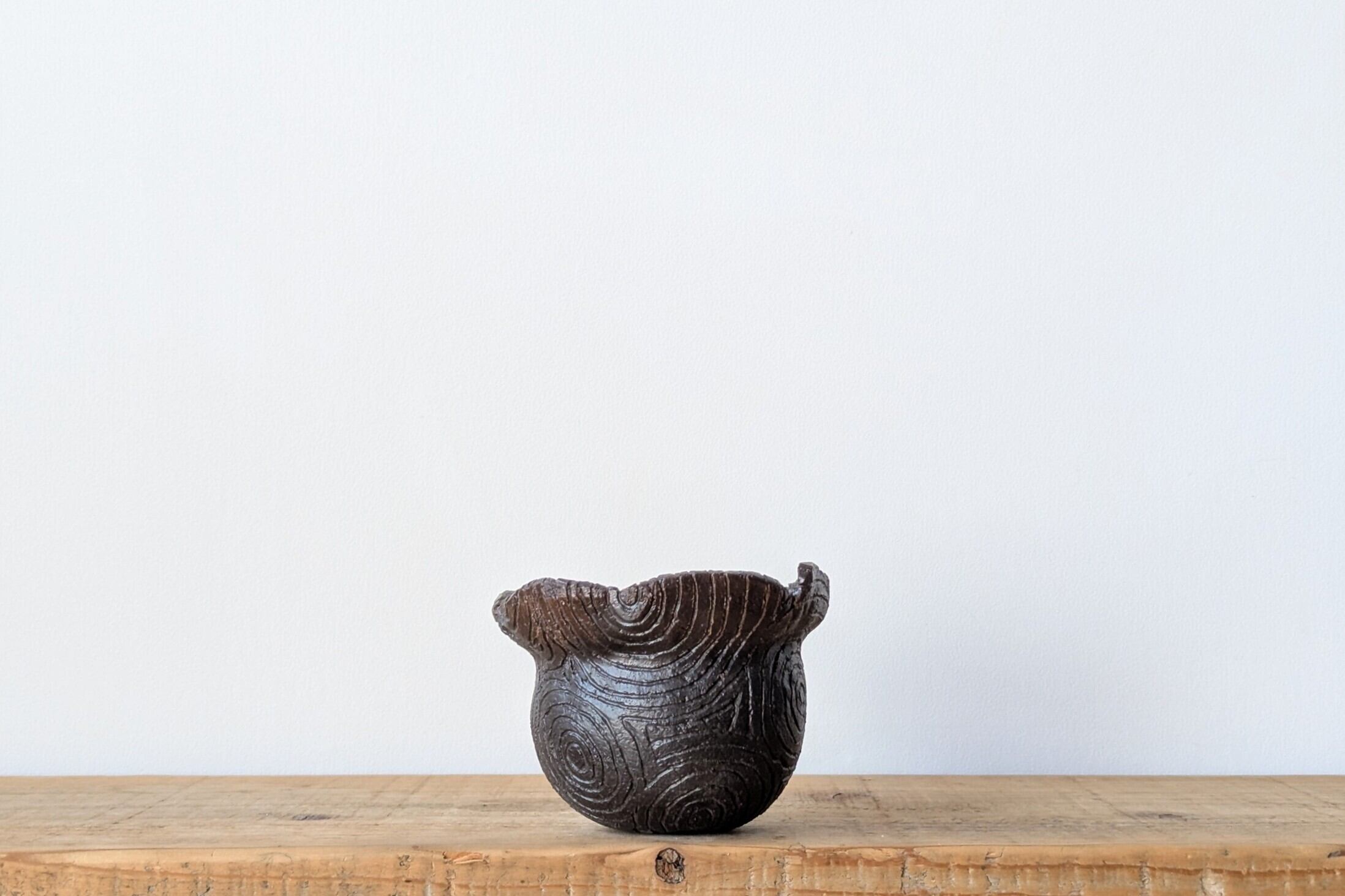 壷型に成型した陶土にぐるぐるの年輪模様をつけて不思議な木目の様な器です。