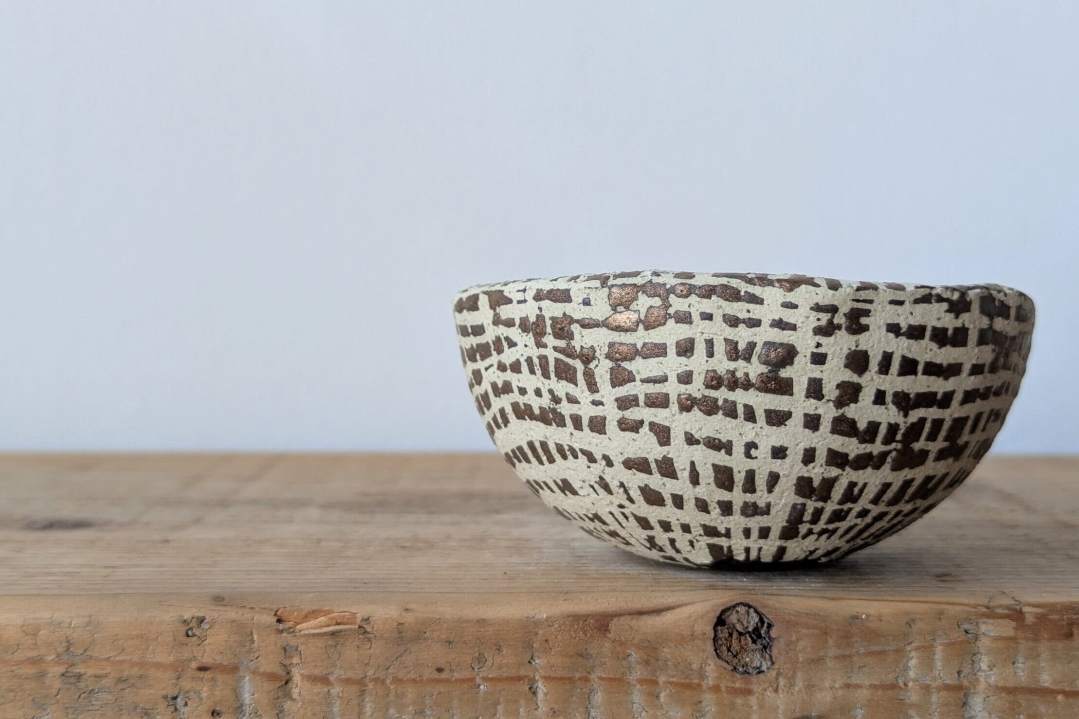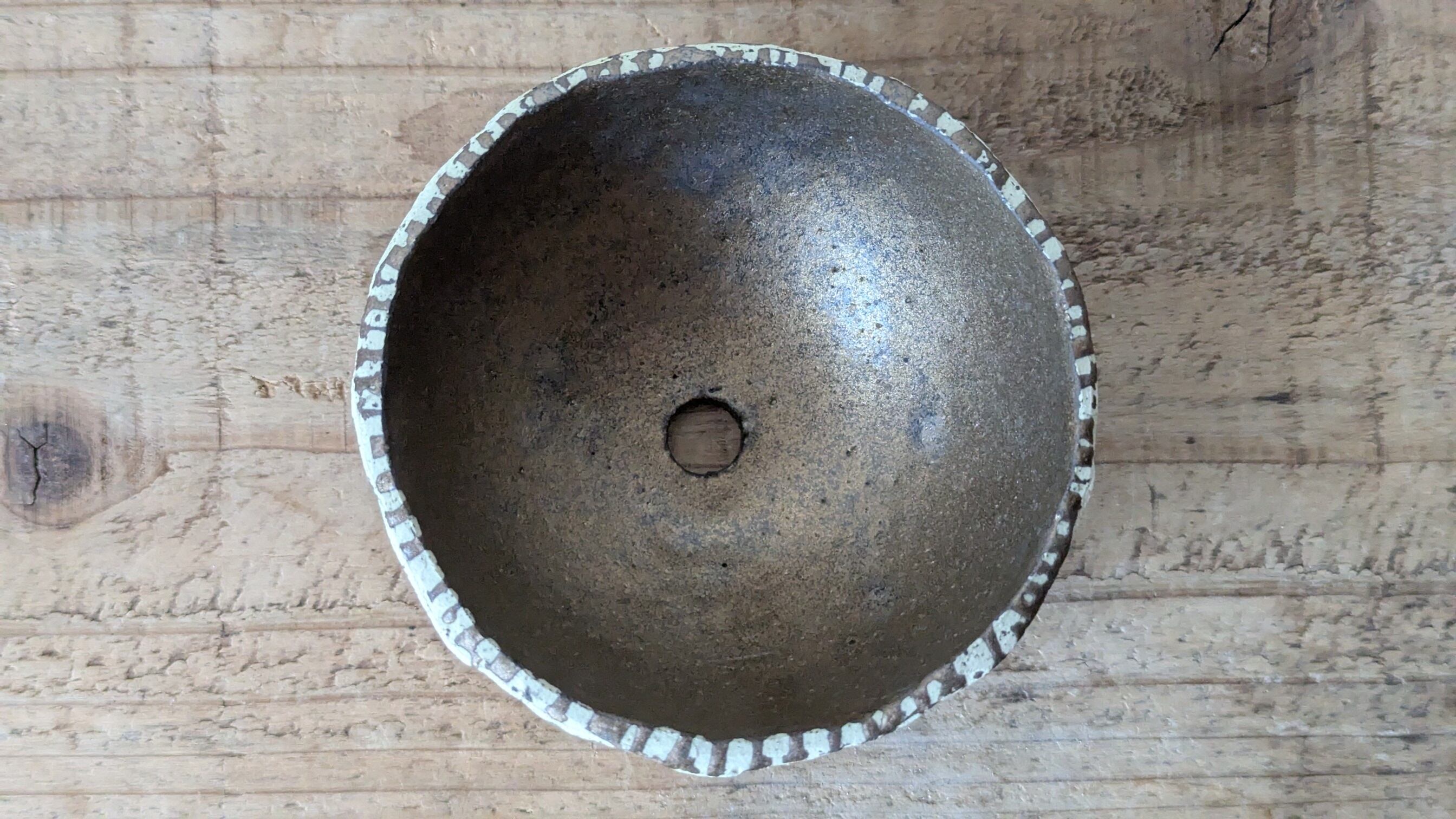 球型に成型した陶土に特殊な技法でラインをつくりアンティークゴールドの釉薬を施しました。ライン部分は炭化しブラックとなった部分とアンティークゴールドがところどころに表情を見せて、色が飛んでしまった部分もでましたが、それがまた独特なアンティークな雰囲気のデザインに仕上がっています。