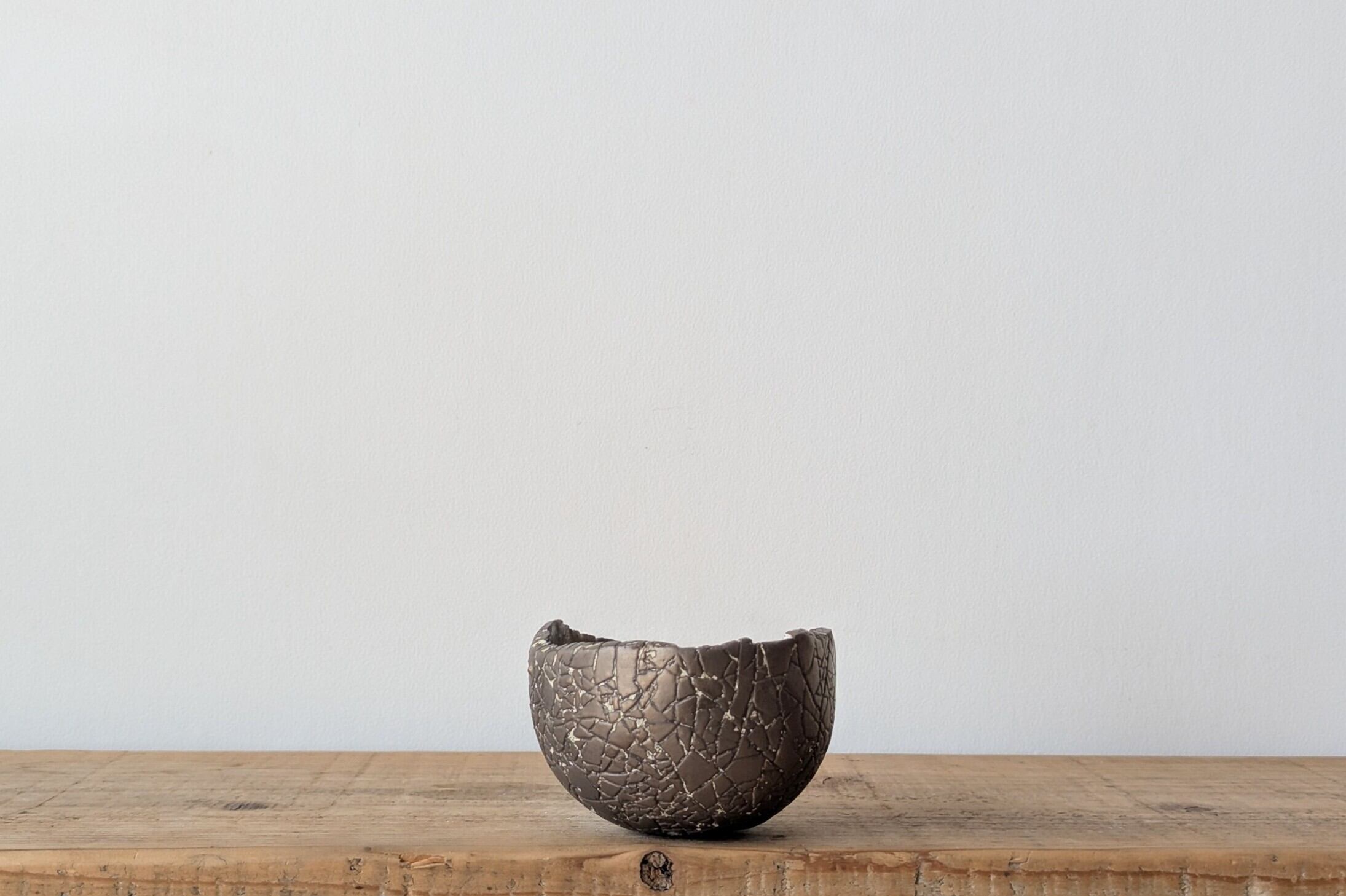 お椀型に成型した陶土に細かいひび割れ模様を作りアンティークゴールドの釉薬で仕上げました。繊細なひび割れを表現したデザインはこれまでに無い独特な雰囲気を演出しています。