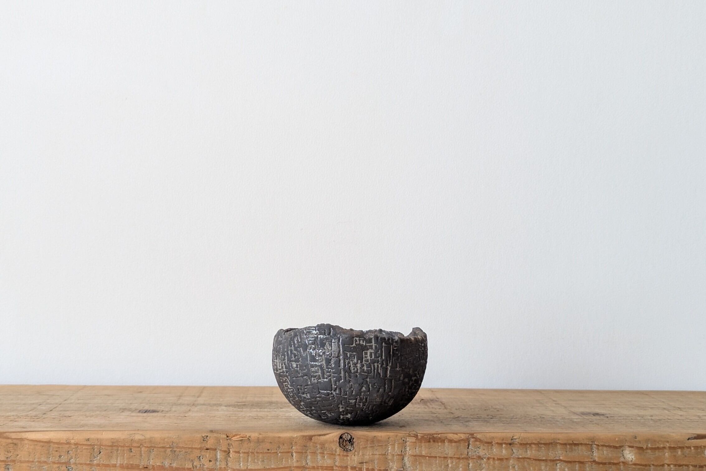 球型に成型した陶土に細かい模様を作り、アンティークゴールドの釉薬を使いました。窯の加減で表面が焼けて黒色にところどころで見せる金色が現れる珍しい仕上がりになっています。