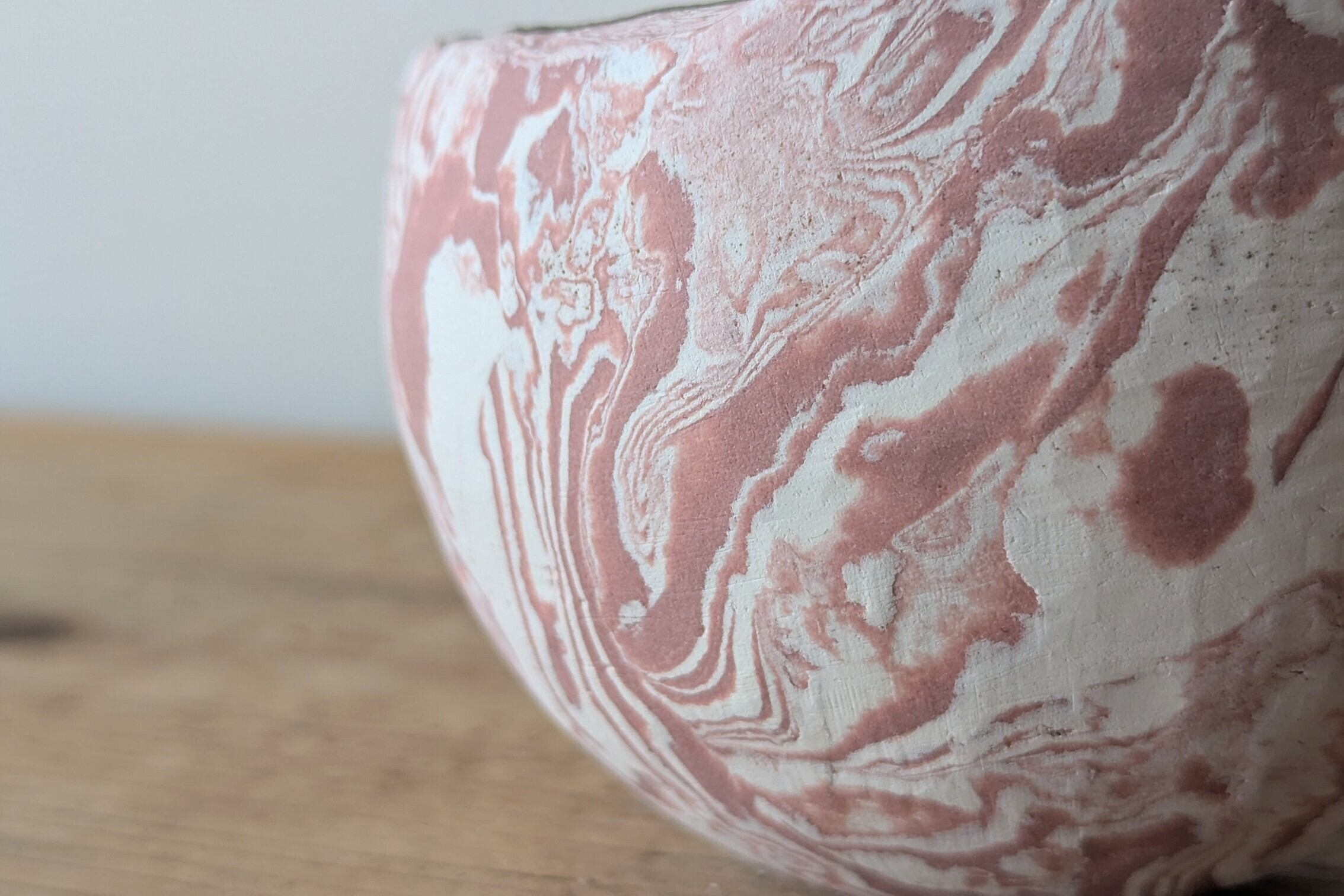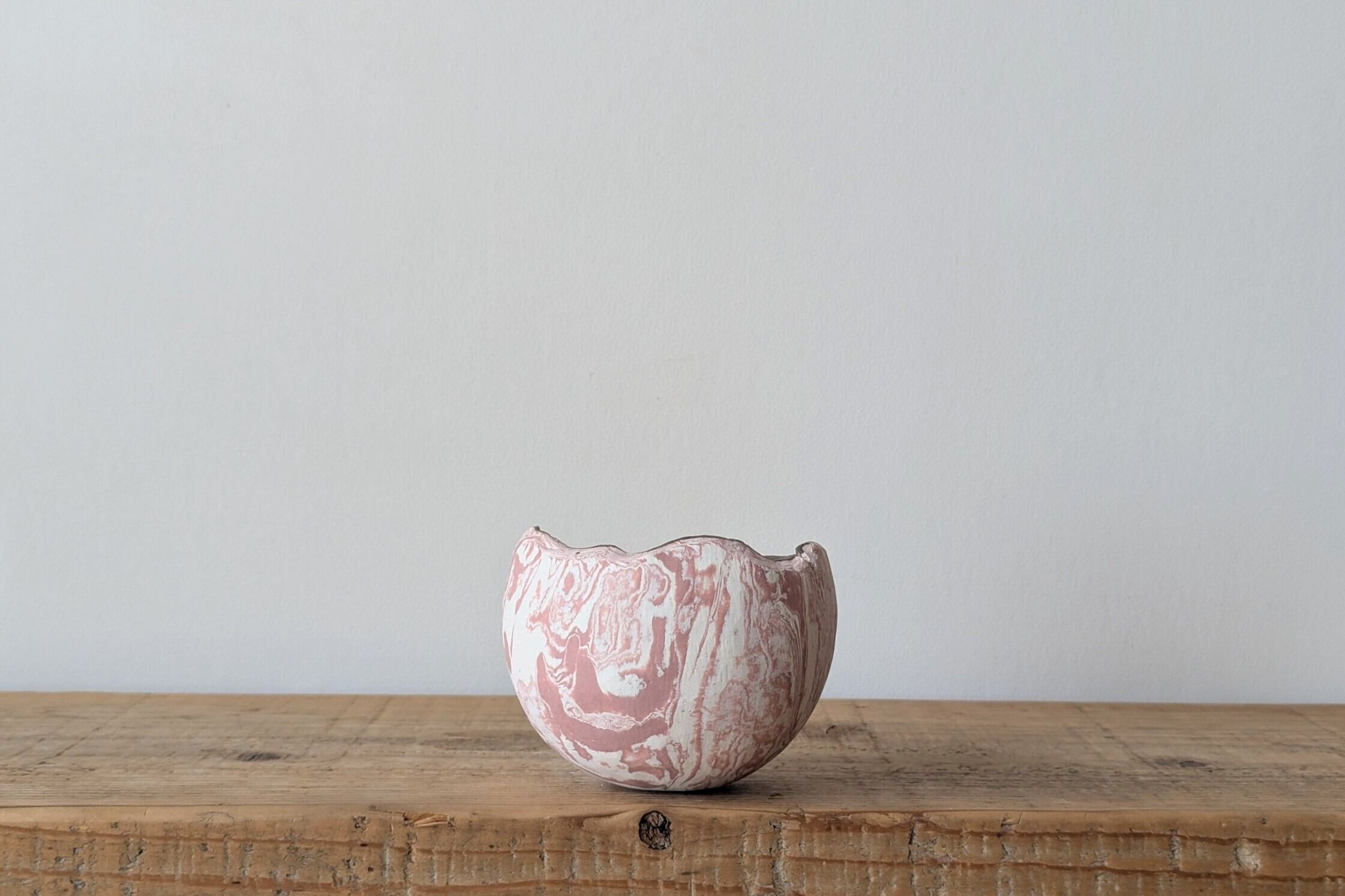練り込みした土で球型に成型した陶土の内側にアンティークゴールドを施しました。どこから見ても細かいマーブル模様が美しい仕上がりになっています。