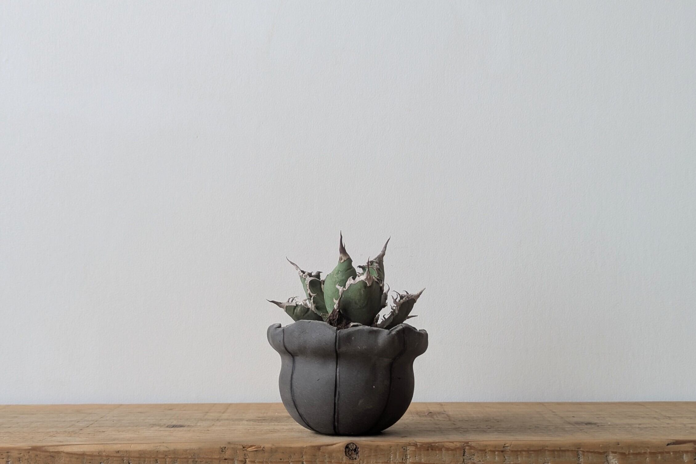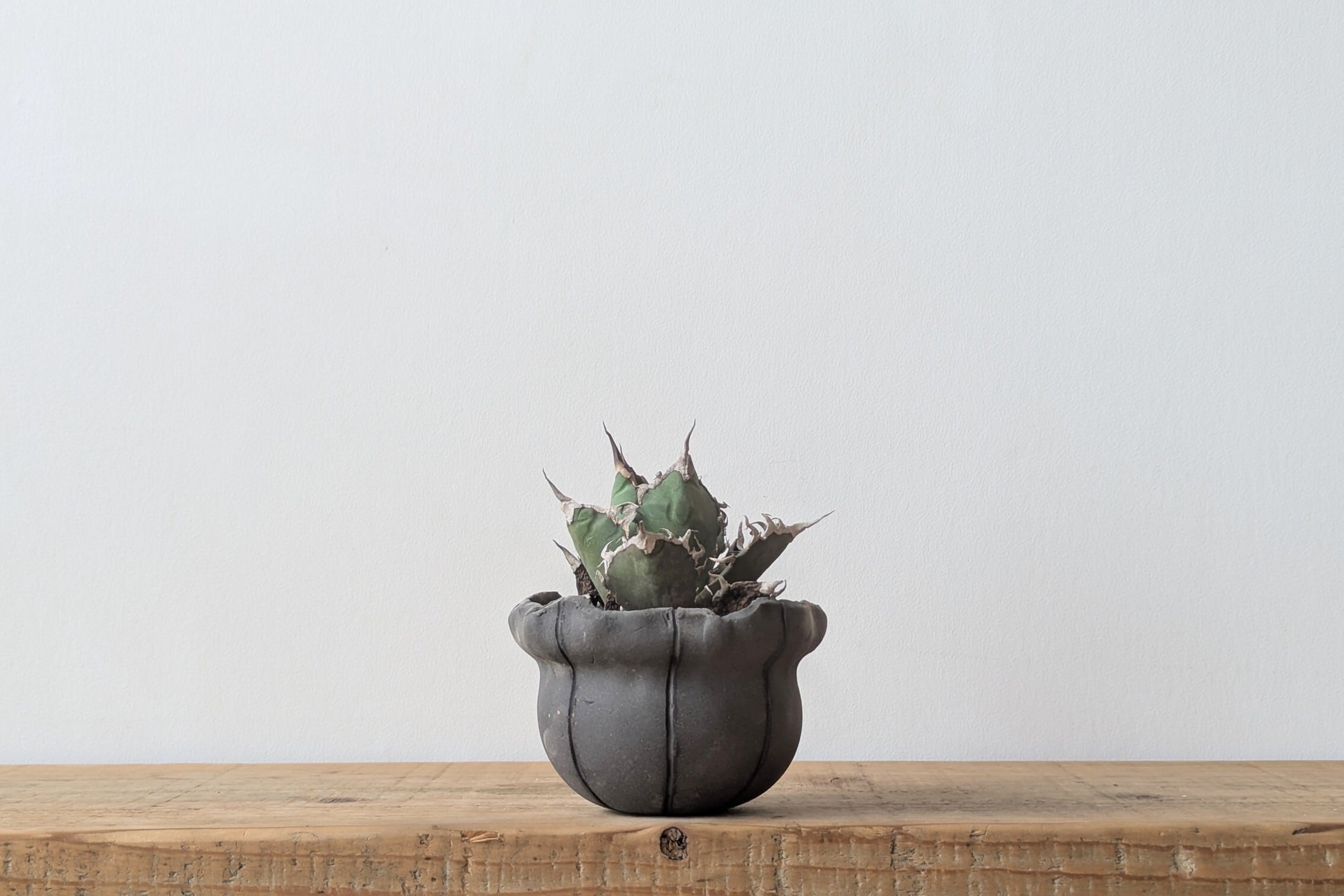 壷型に成型した陶土に規則的にラインを彫り、釉薬を注ぎました。ほとんど色がでなかったのでやや濃い目の黒いラインとなっています。とてもシンプルなデザインでどんな植物にも合わせやすい器です。