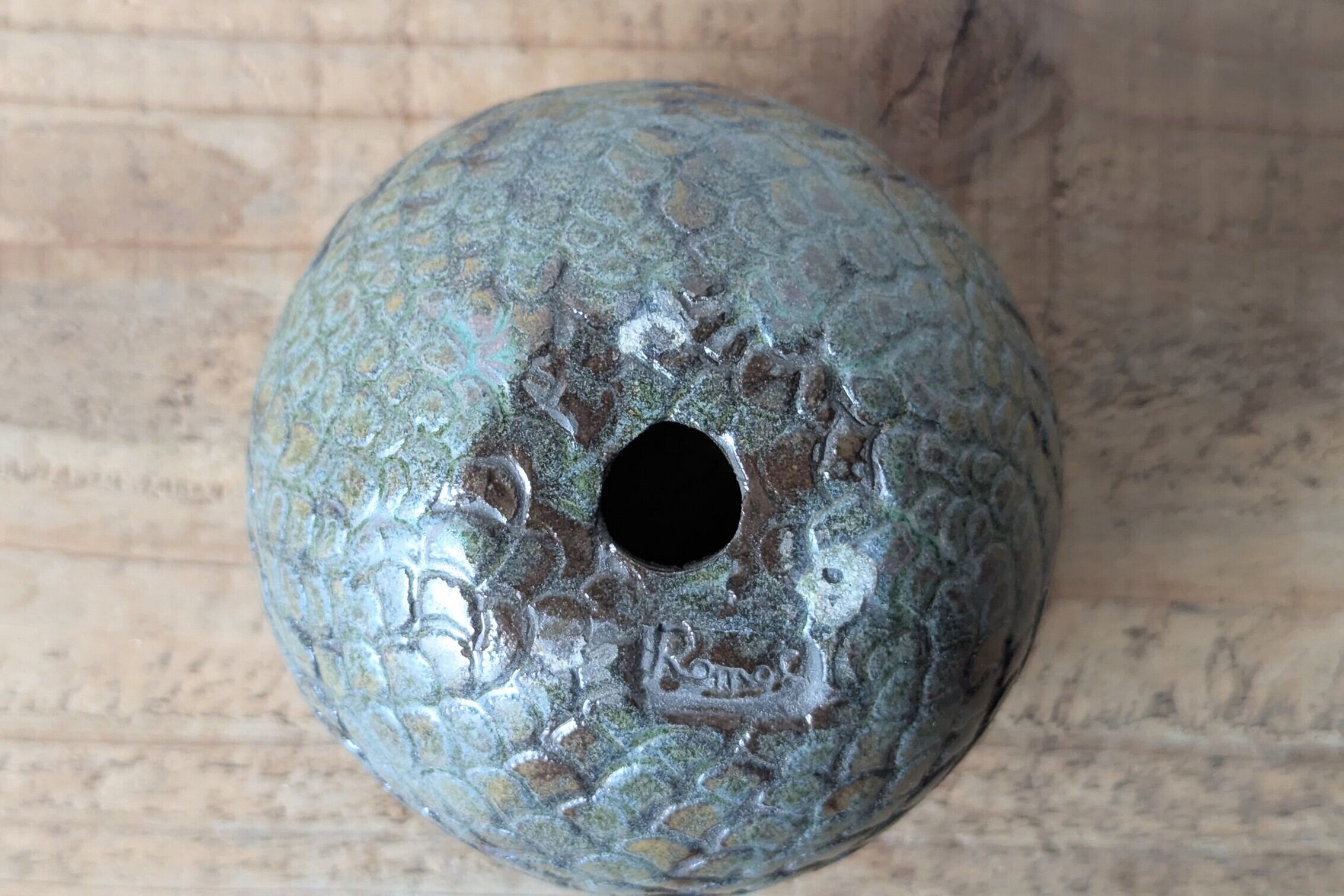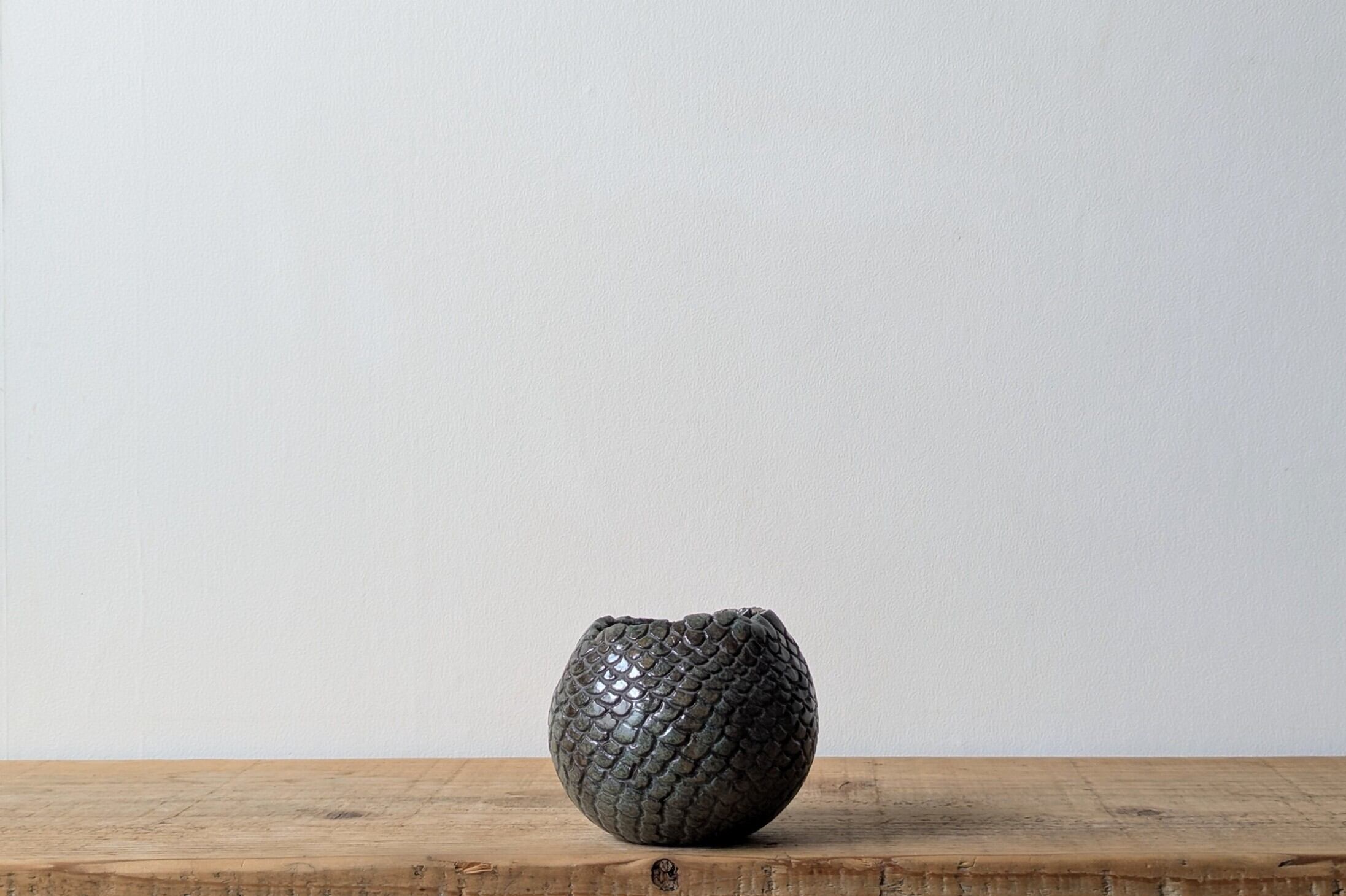 球型に成型した陶土に鱗状の細かい模様を
