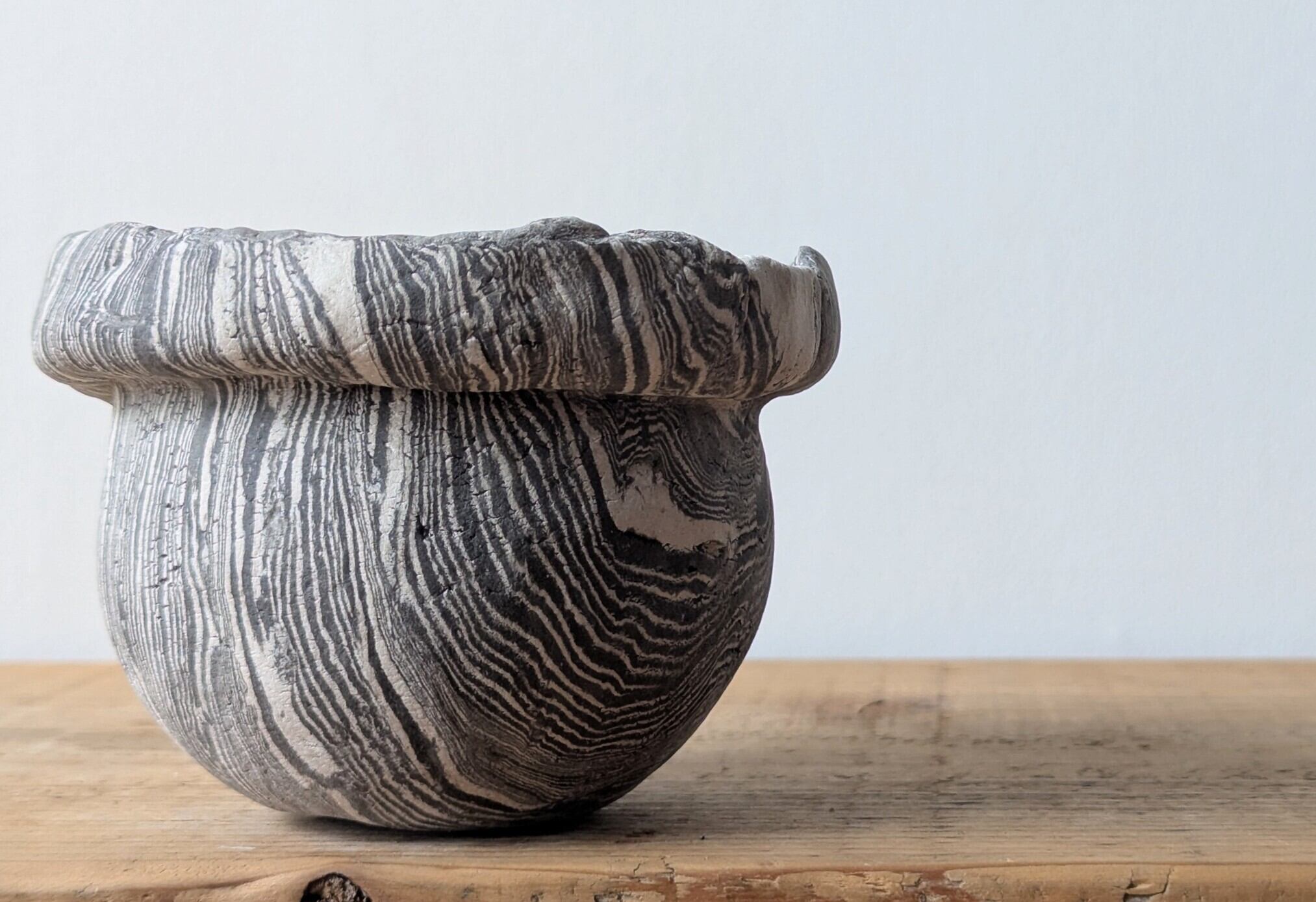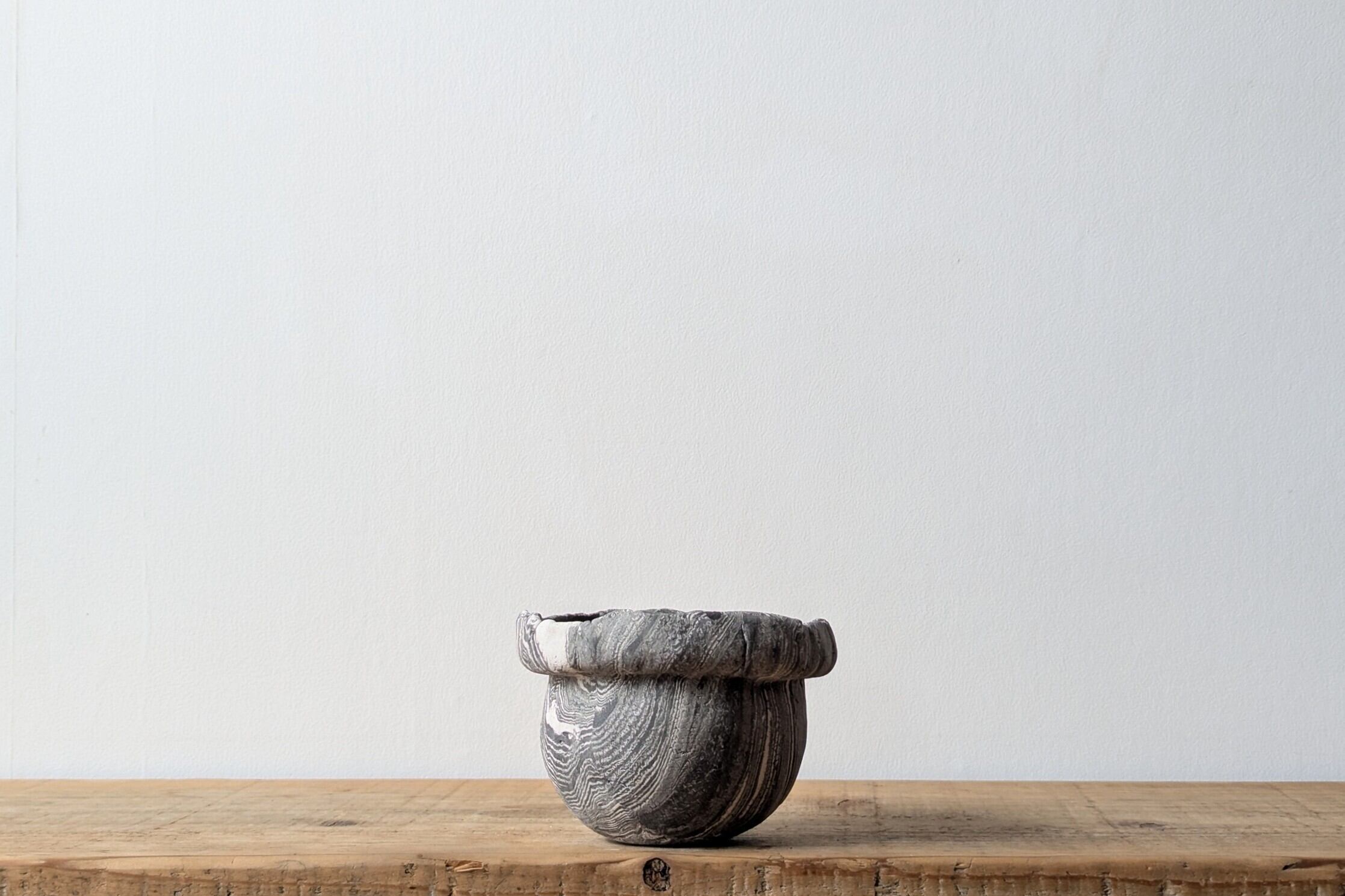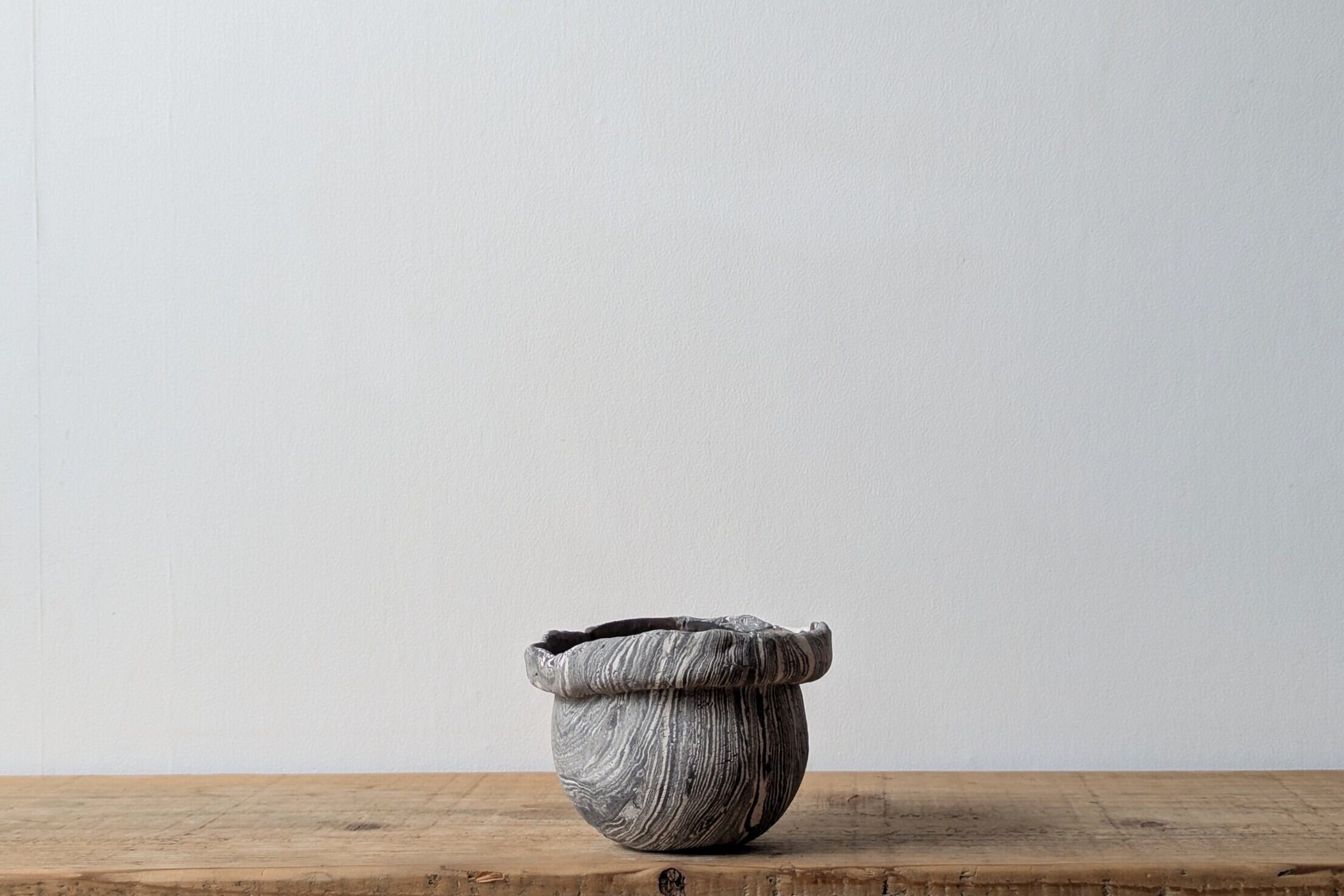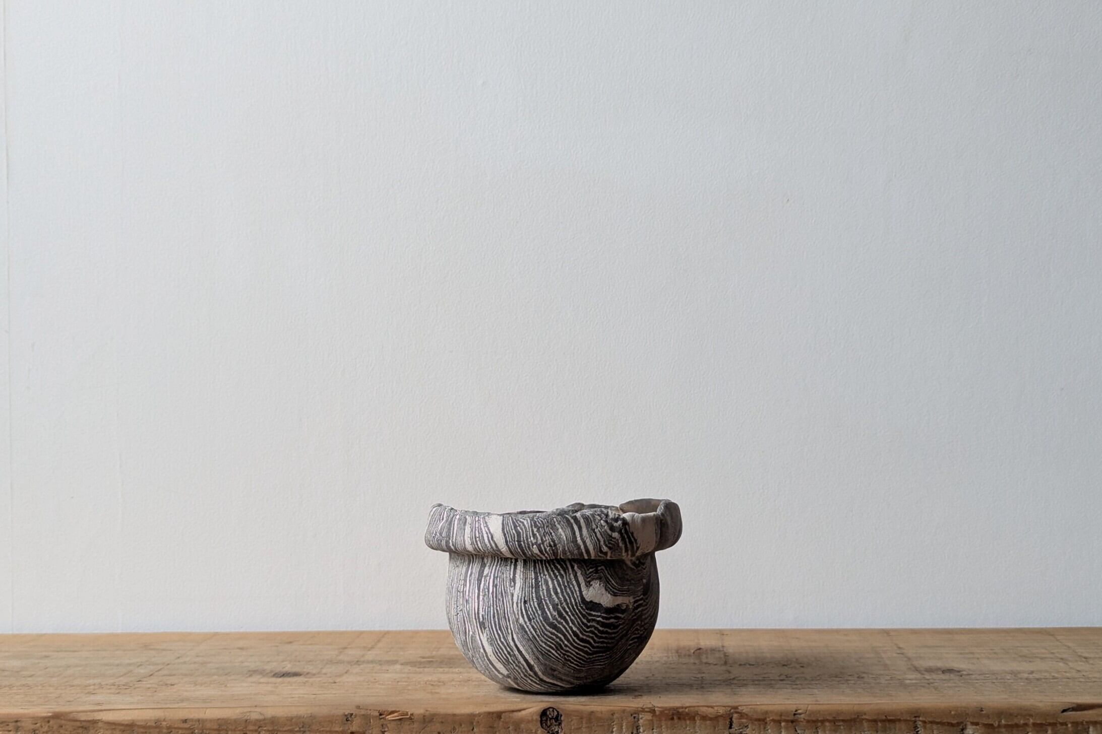 練り込んだ粘土を壷型に成型し、内側はアンティークゴールドの釉薬で仕上げました。白と黒の非常に細かい美しいマーブル模様のデザインです。植物の不思議な雰囲気を高めてくれる器です。