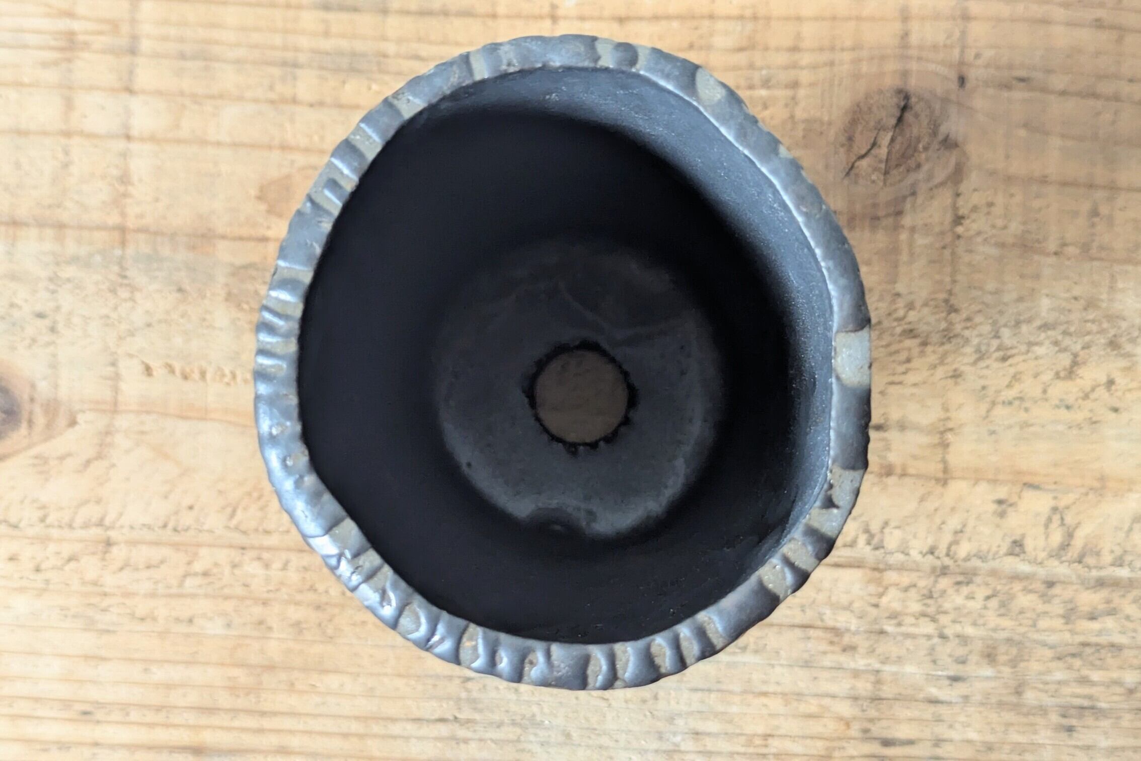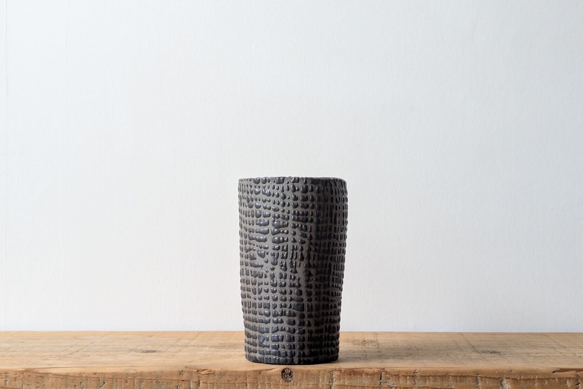 グレー土を筒状に成形し、格子状にマットブラックの釉薬を施しました。ボコボコした出っ張りが面白いデザインになっています。また、このサイズは中々無いサイズの陶器鉢です。とっておきの灌木や長めの塊根にぜひご利用ください。