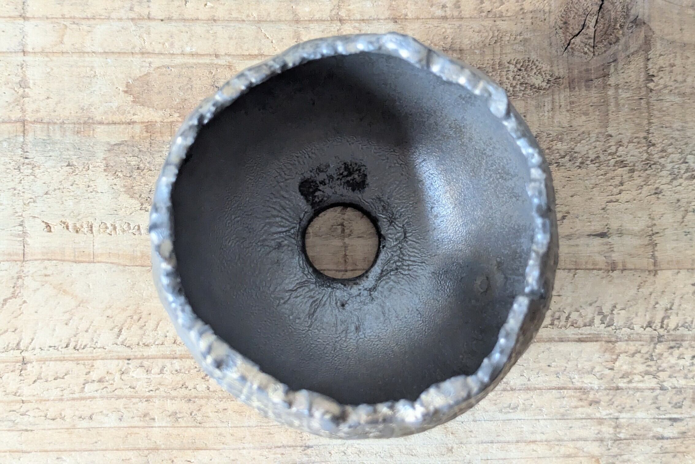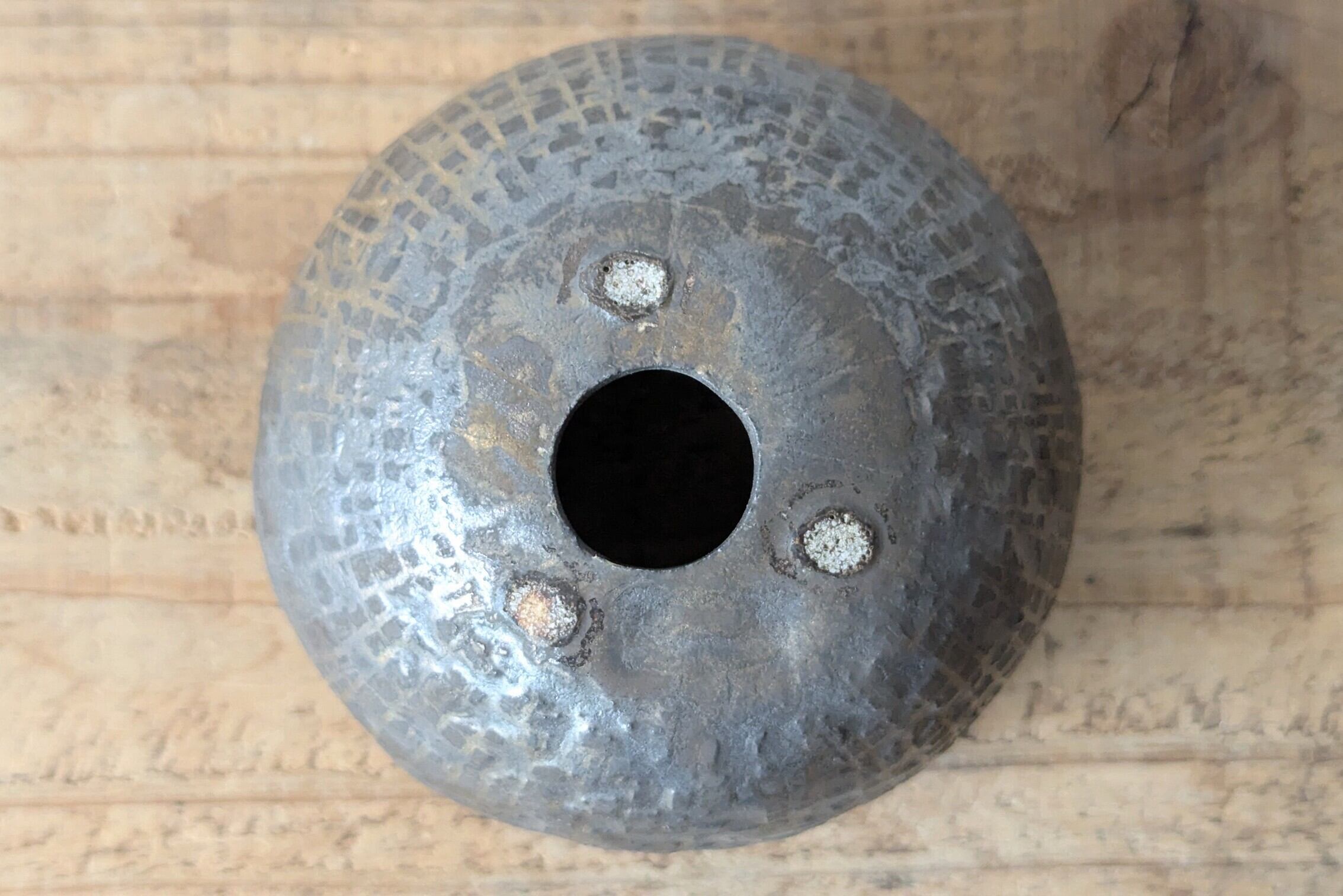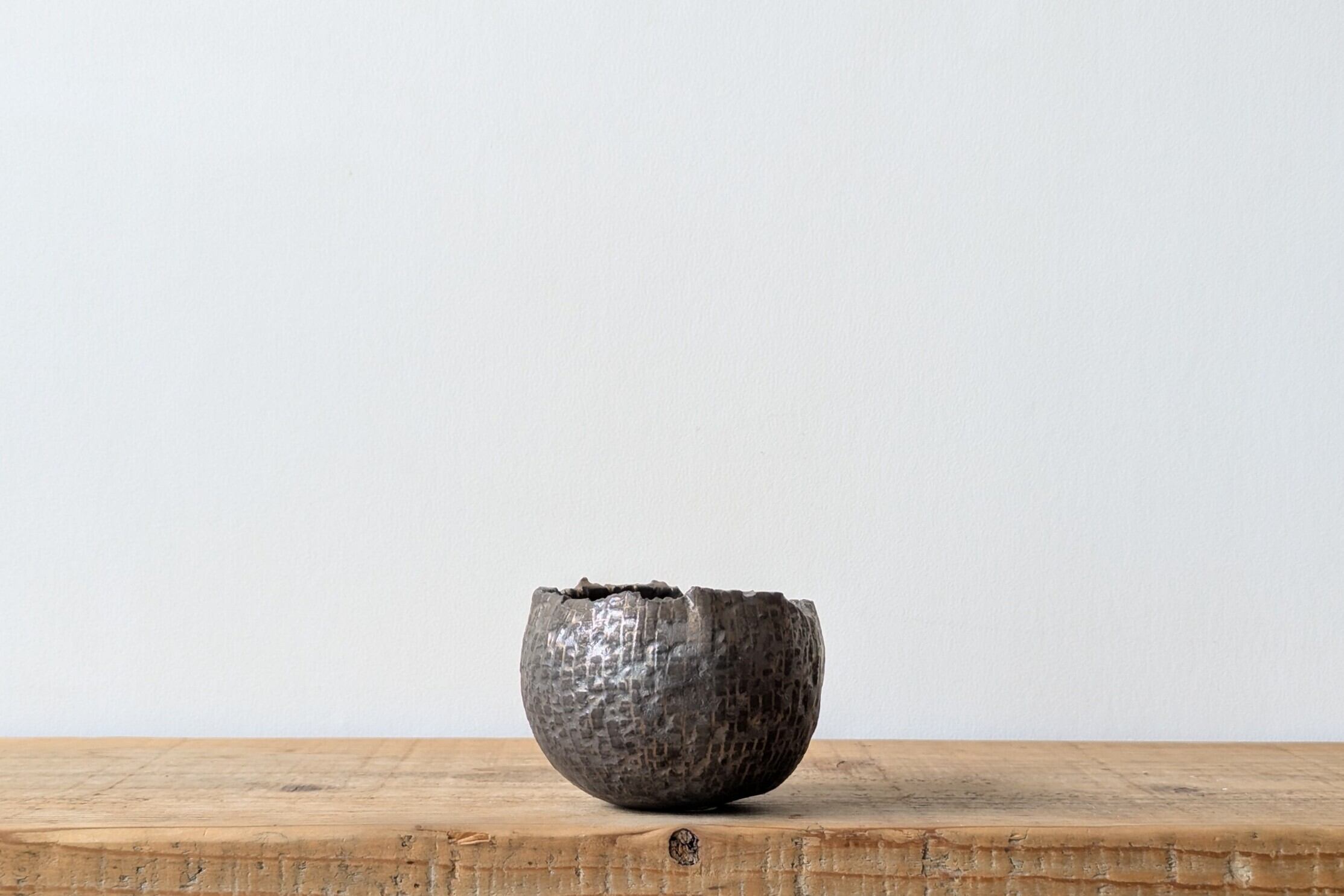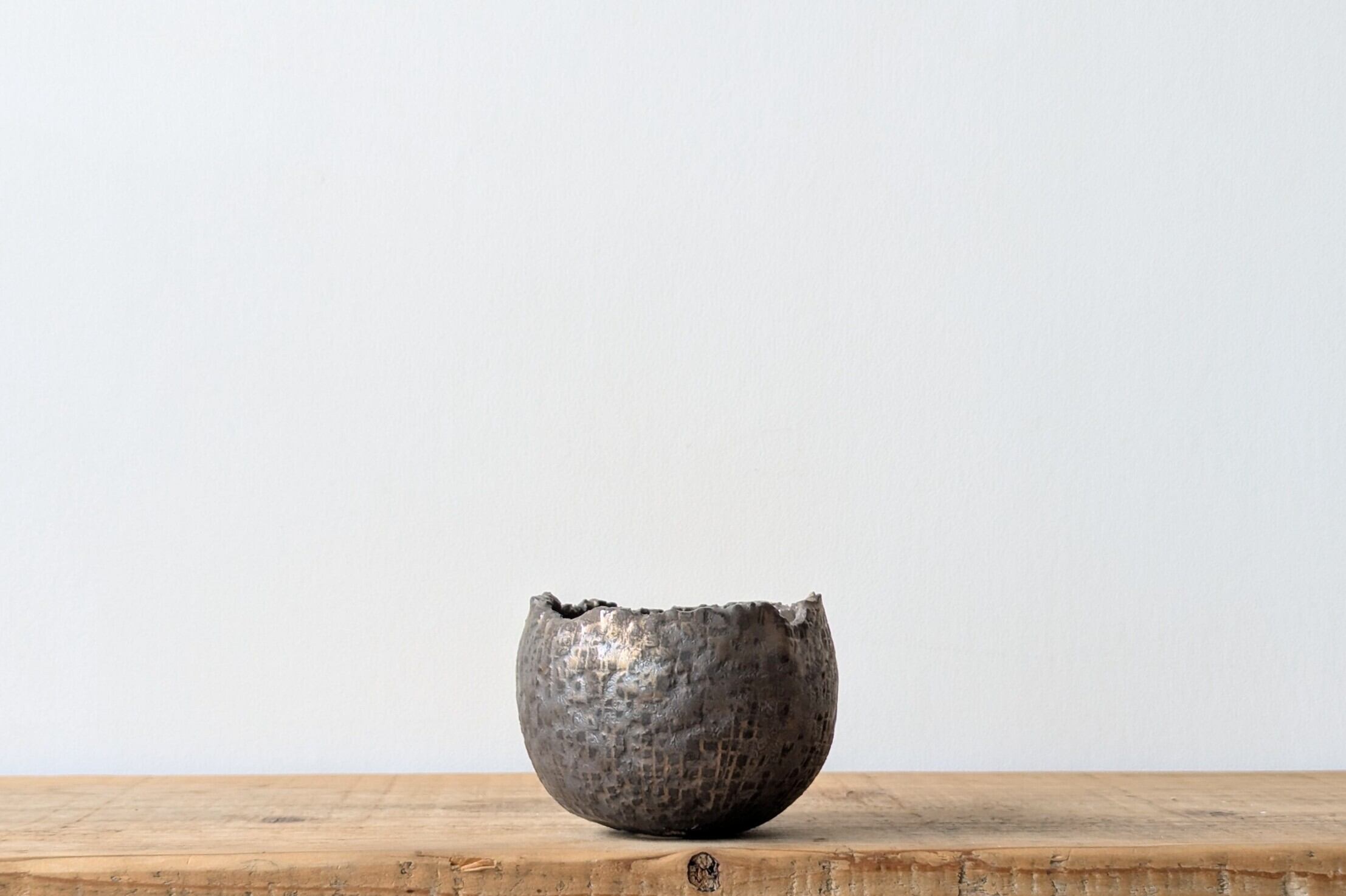球型に成型した陶土に中世の城を連想させる石壁の様な模様を作り、アンティークゴールドの釉薬で仕上げました。金色が控えめな発色となり、マッドブラックの様な色合いの器です。