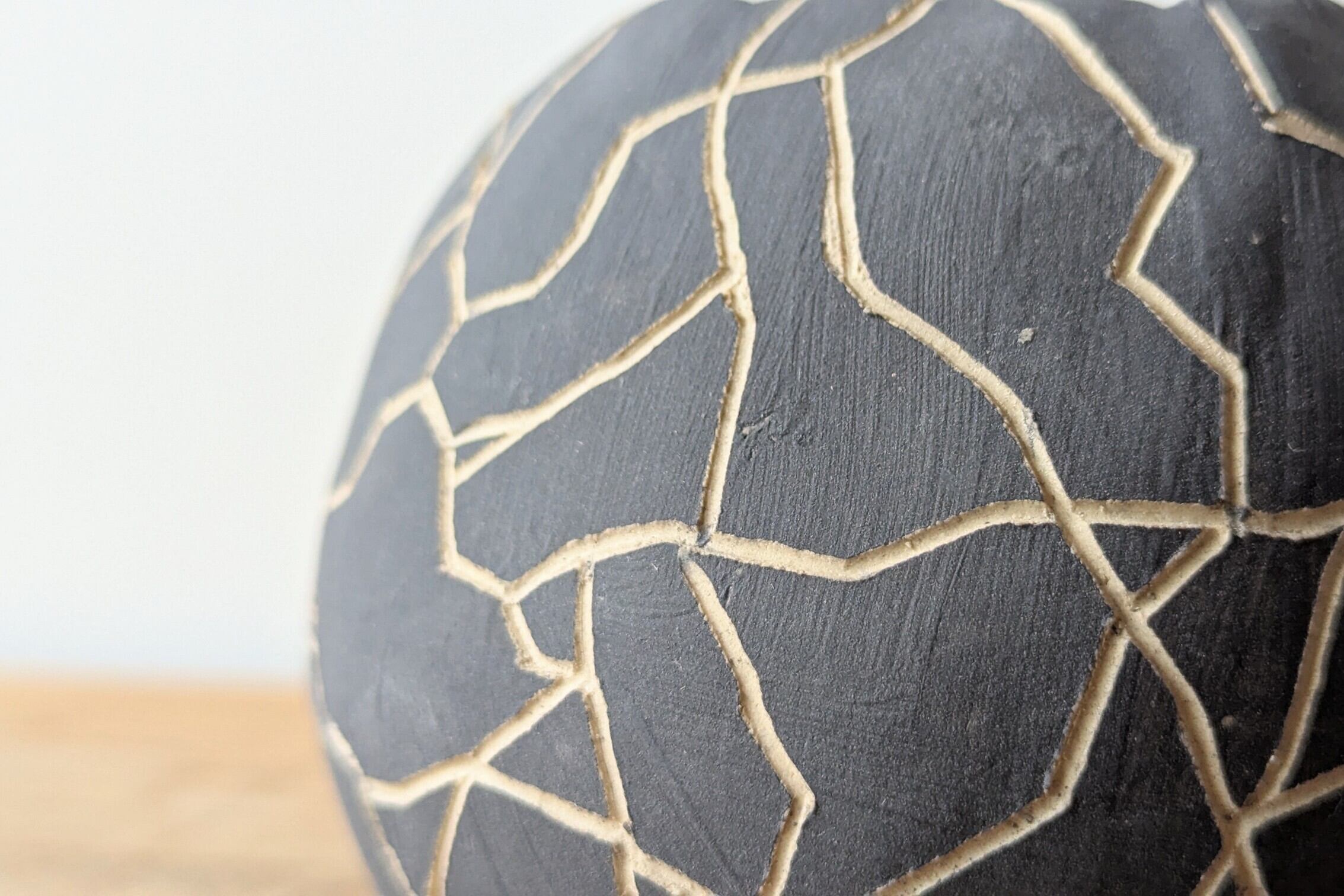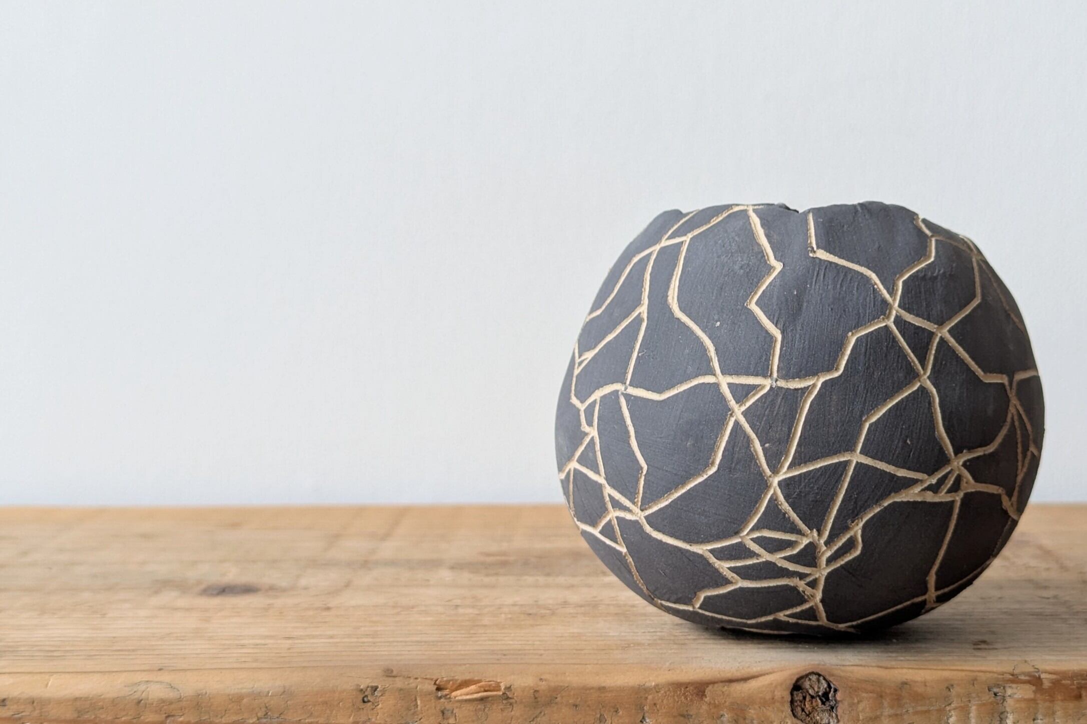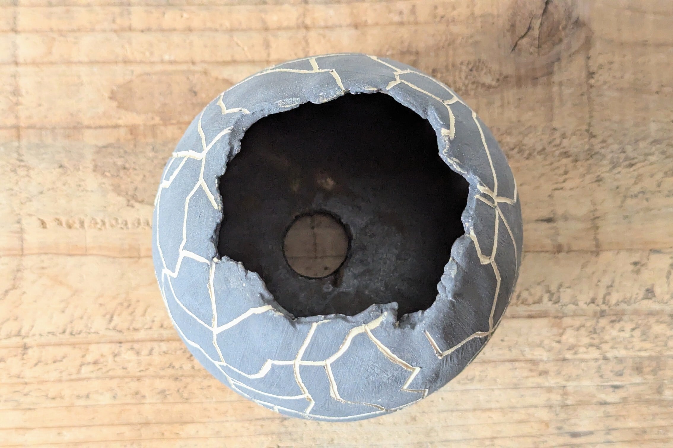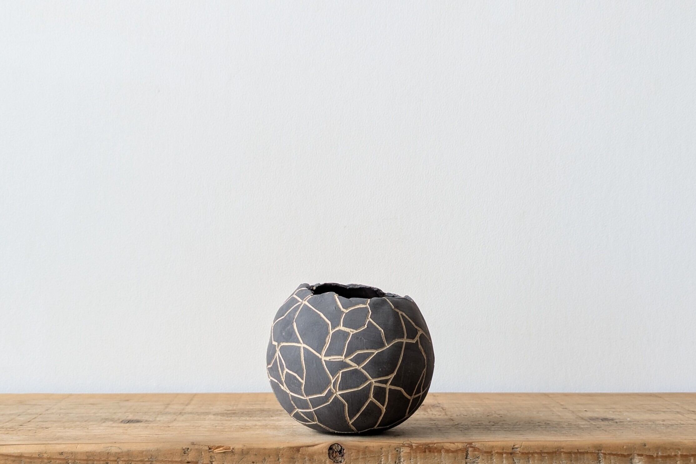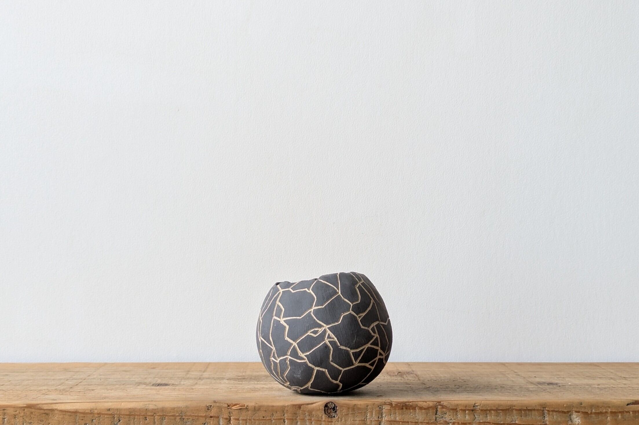 球型に成型した陶土を黒色に塗り激しいひび割れを作り内側はアンティークゴールドの釉薬を流し込みました。焼き上がりはダークグレーに変化しベージュのカラーひび割れが強調された細かい造形の器です。