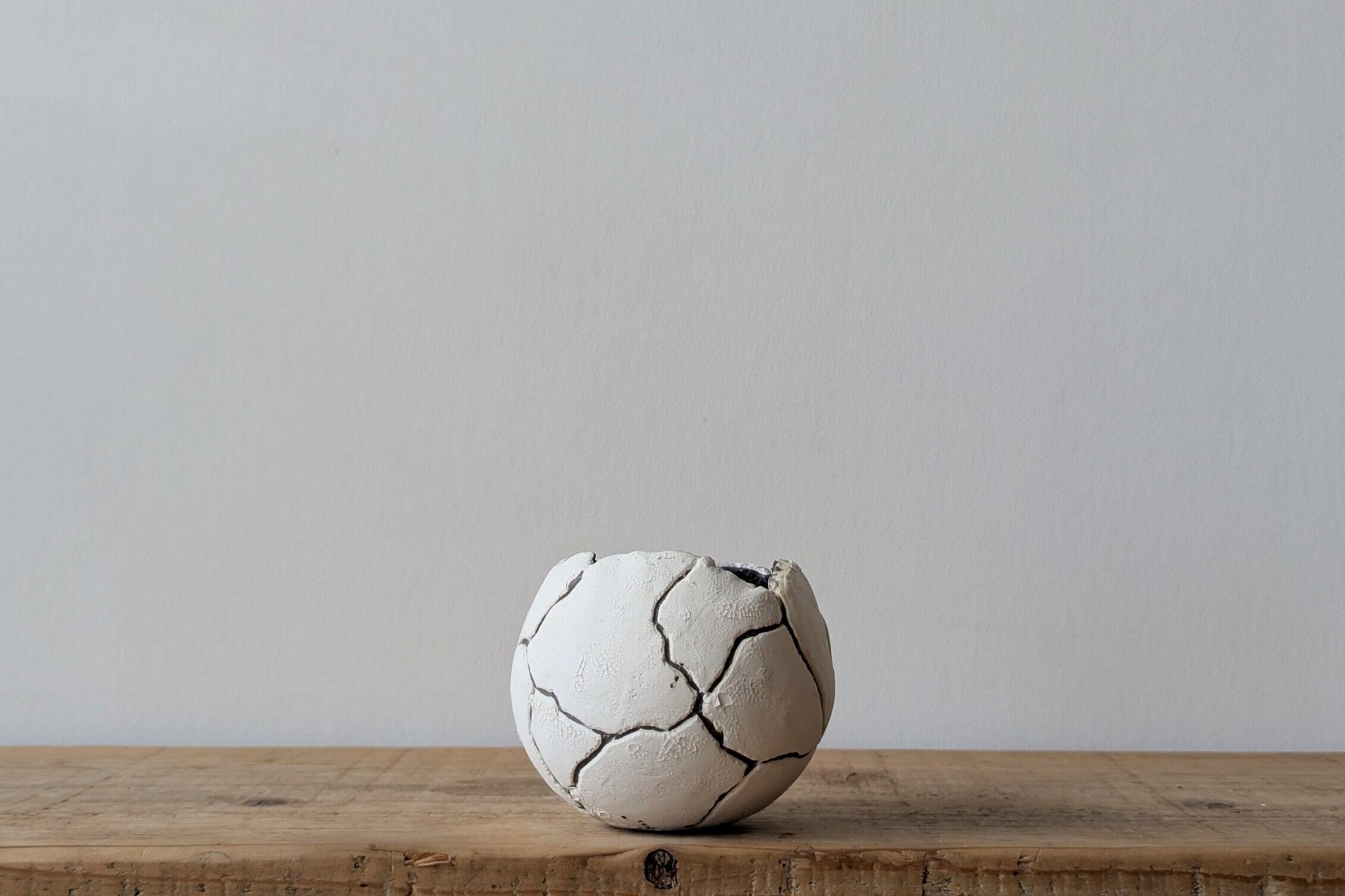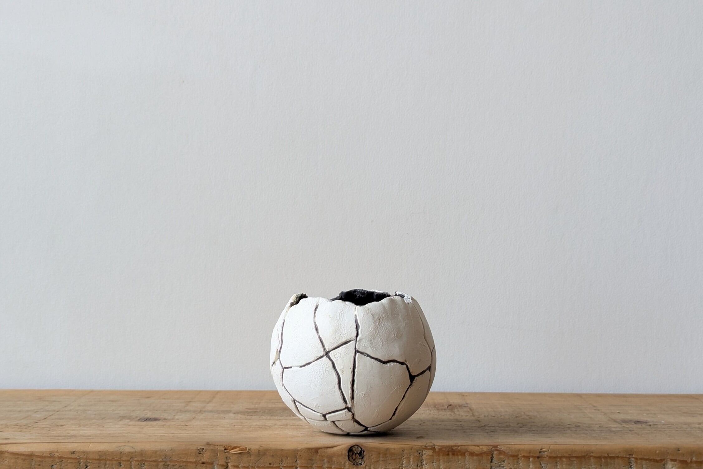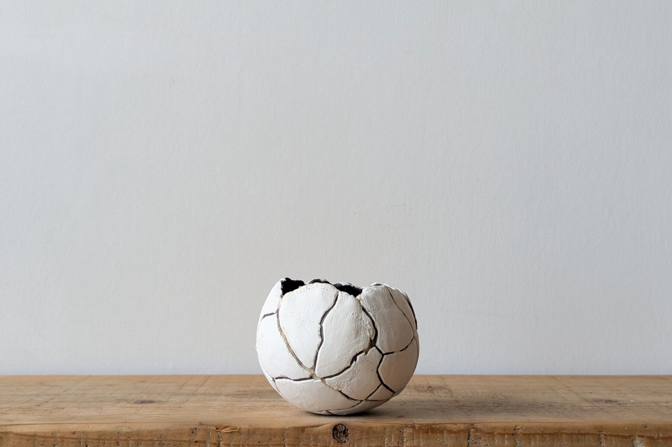 特別に練りこんだ陶土を球型に成型し、激しいひび割れを作り、微細なひび割れを更に施しました。そして内側はアンティークゴールドの釉薬を流し込みました。細かいひび割れがある真っ白なベースにダークグレーのひび割れが強調された細かい造形の器です。