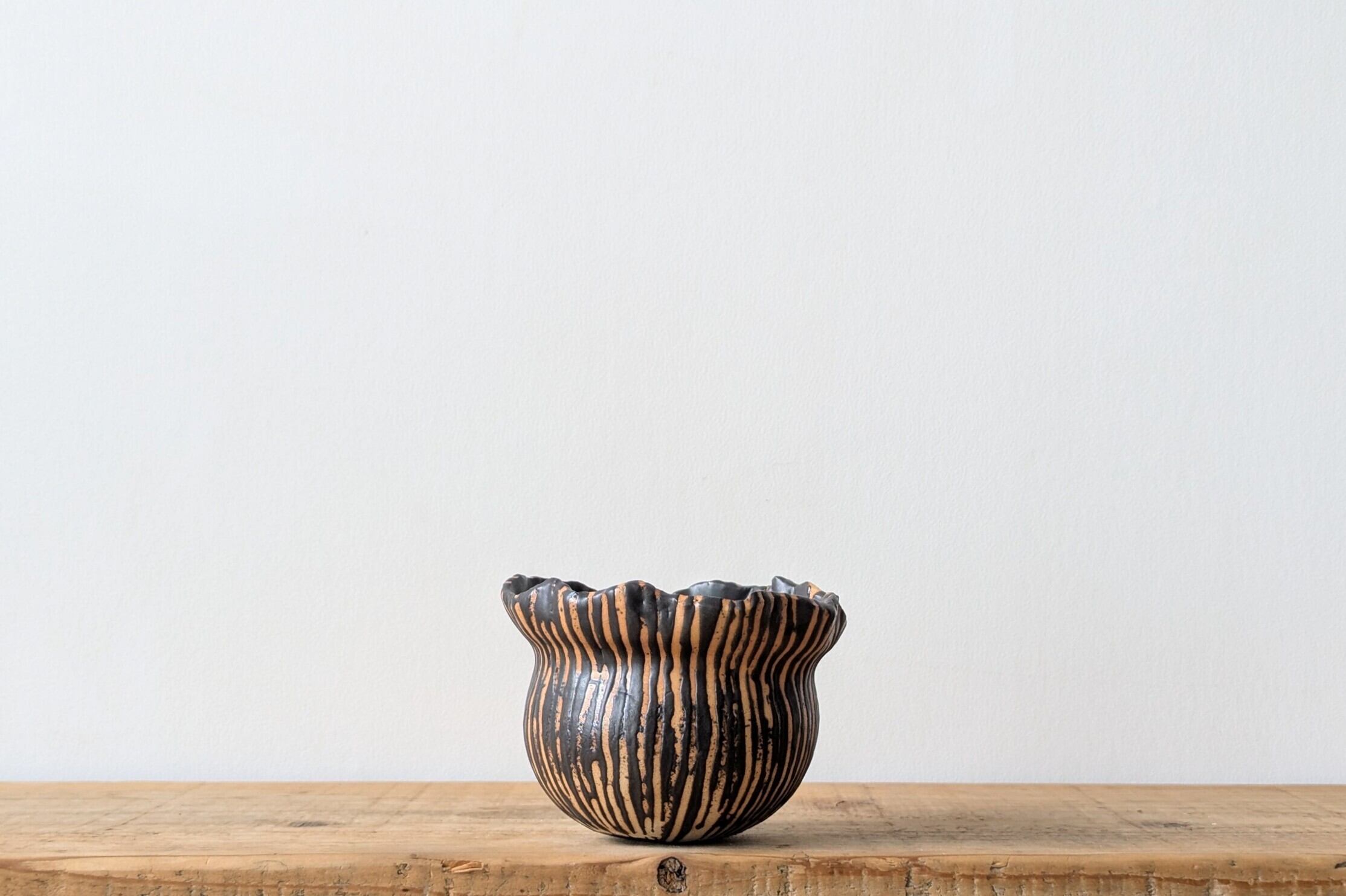 壷型に成型した陶土にマットな黒い釉薬をボーダー状に施しました。白と黒が絶妙なバランスで器の形に併せて美しい曲線の仕上がりとなっています。