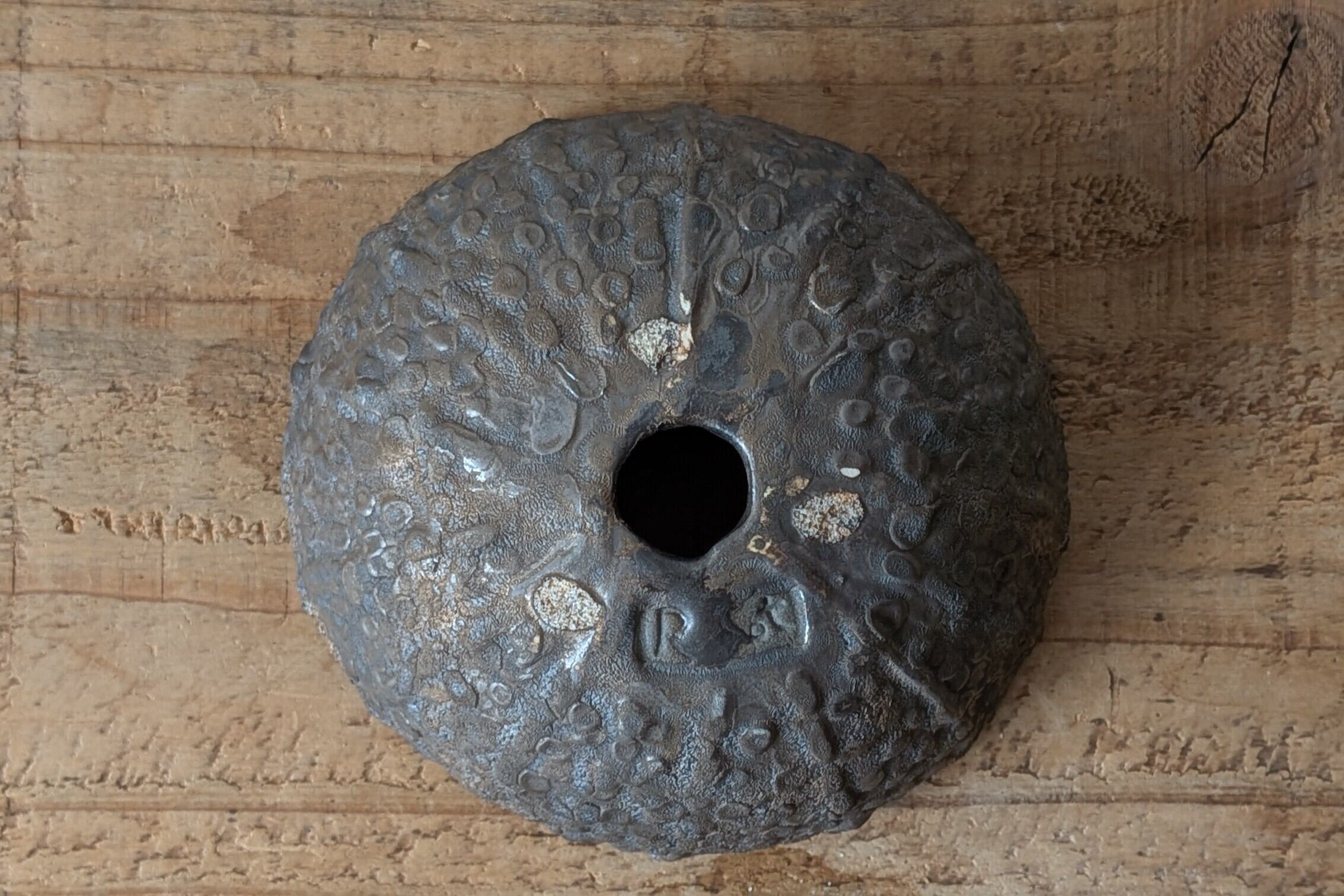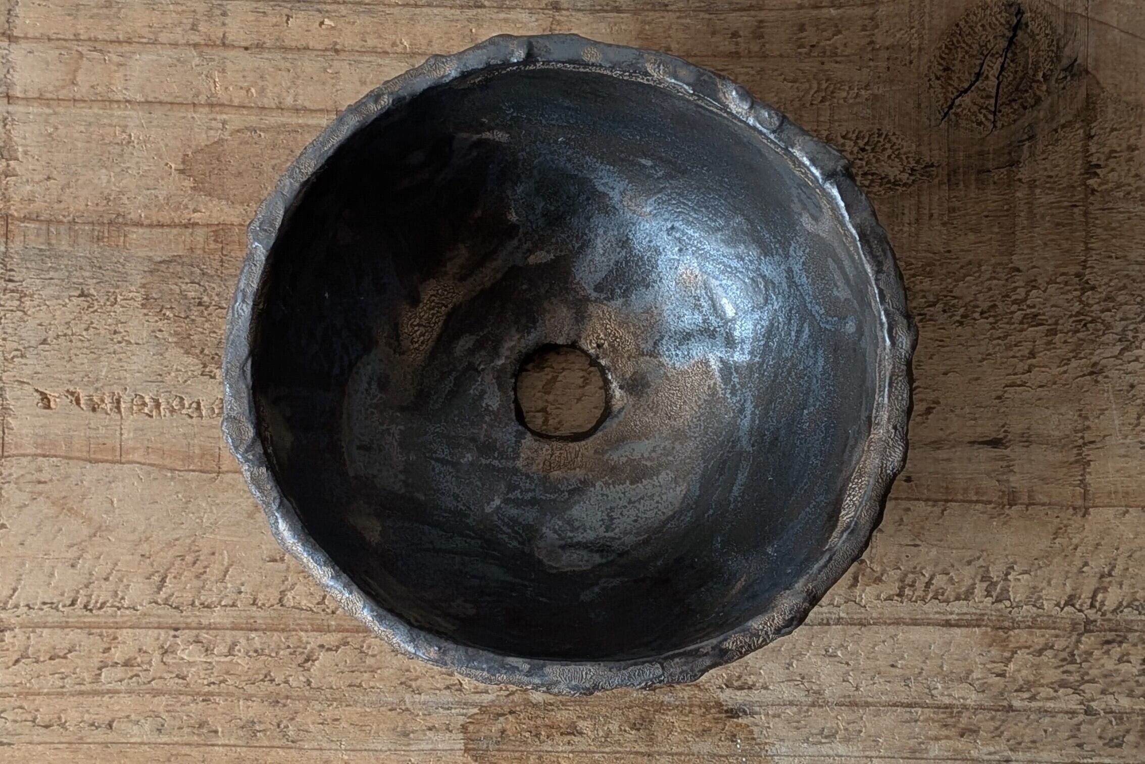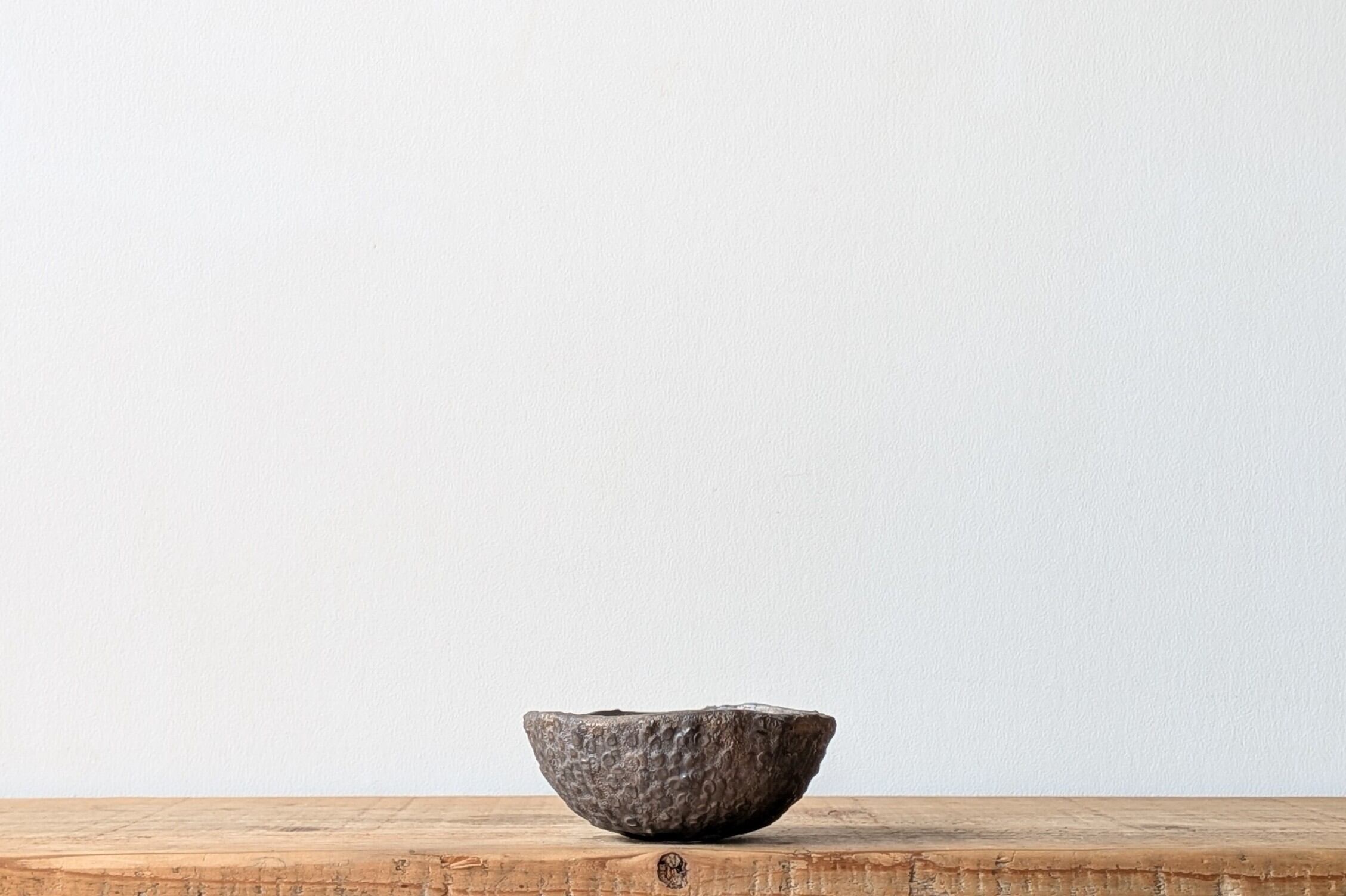 お椀型に成型した陶土に特殊な製法で模様を作り、アンティークゴールドの釉薬を施しました。歪なバランスのブツブツが独特な器です。