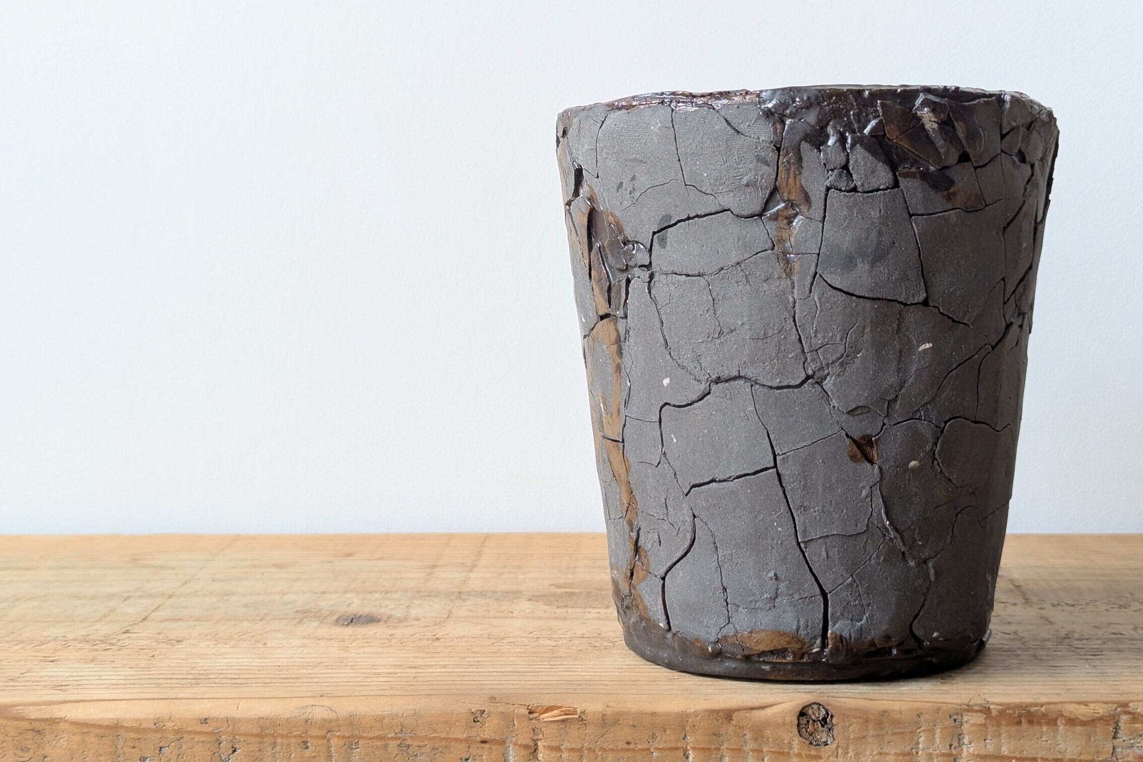 Ramat史上最大級サイズの器、黒色の土を土台に成形し、上から陶土を薄く塗ってひび割れを再現しました。