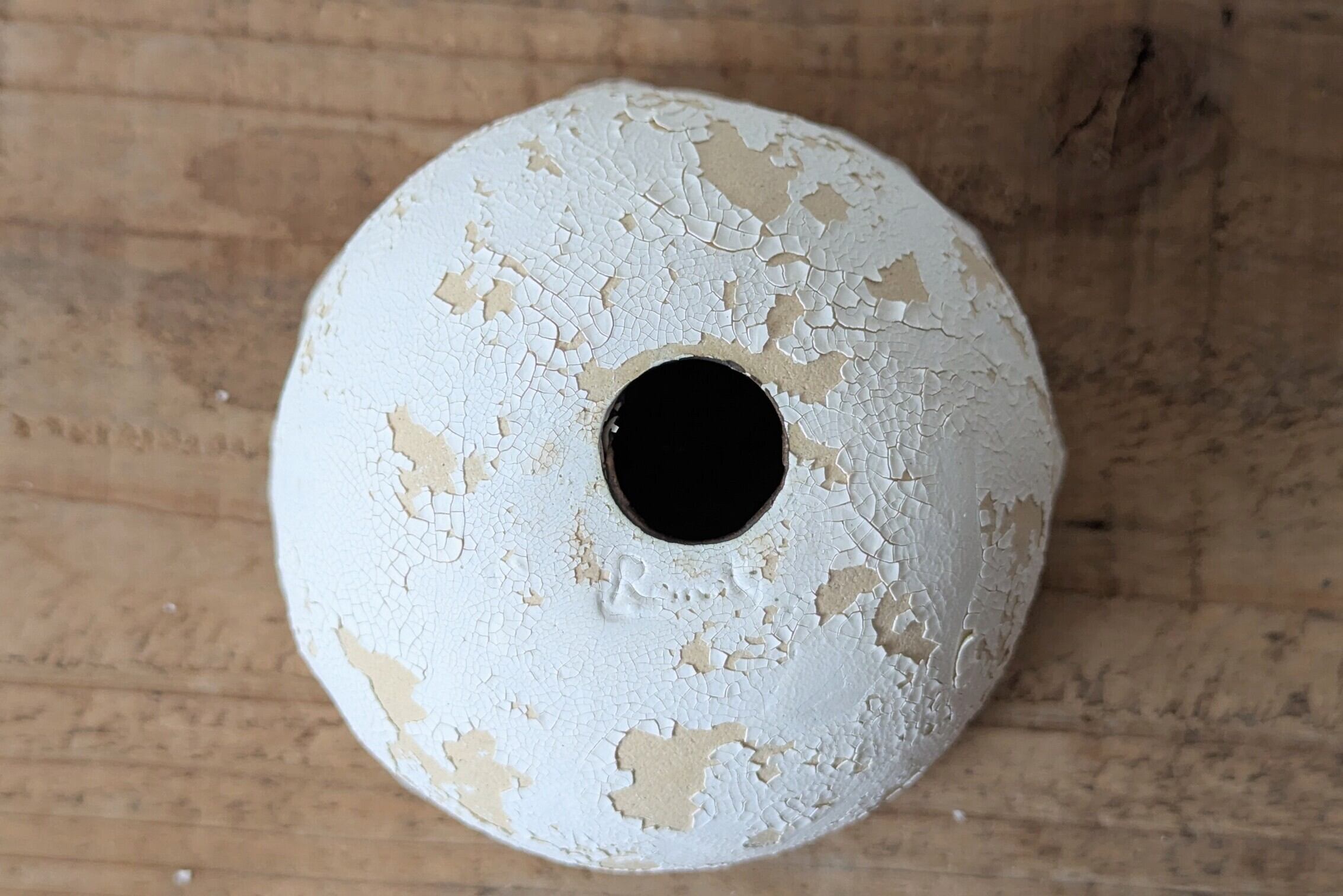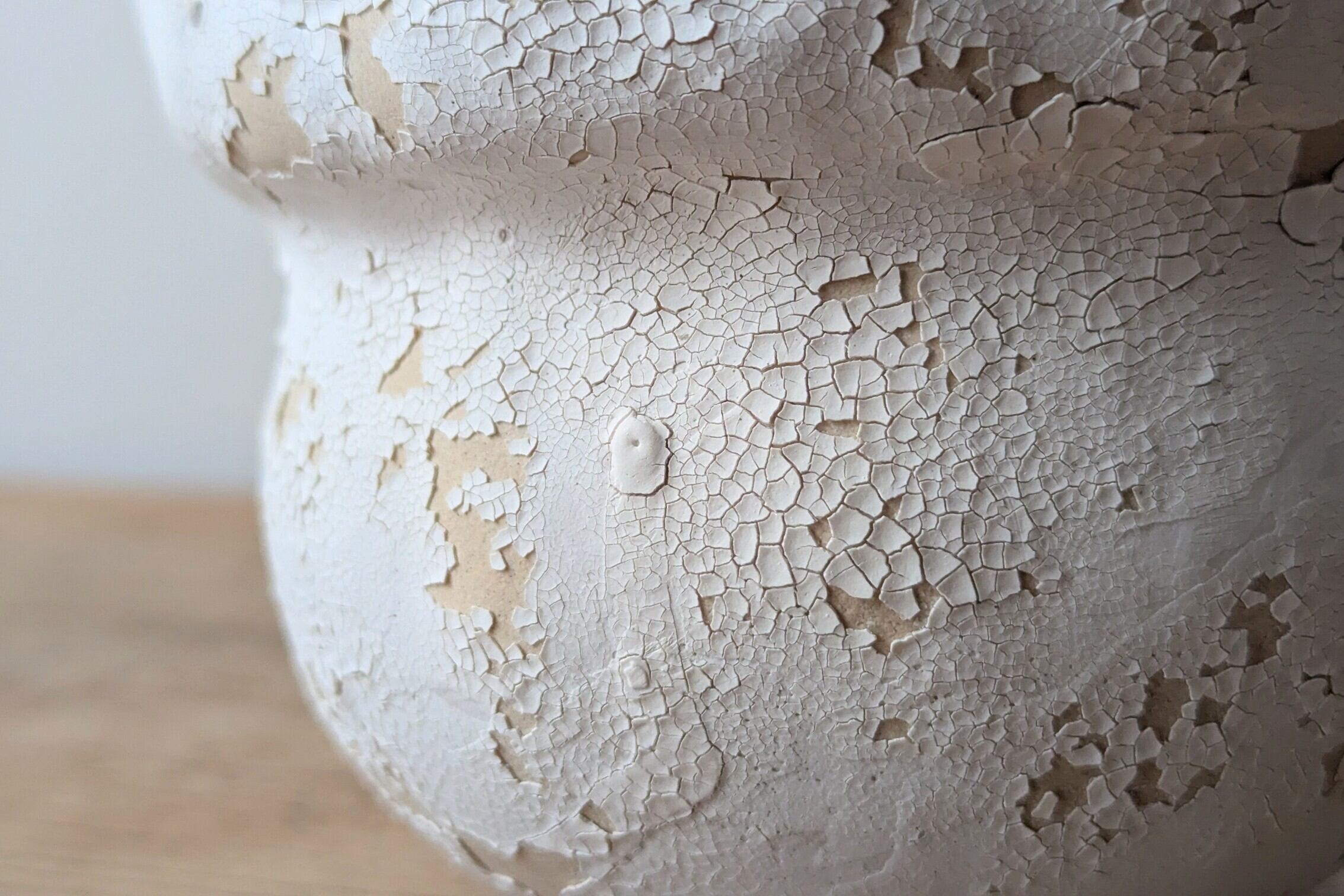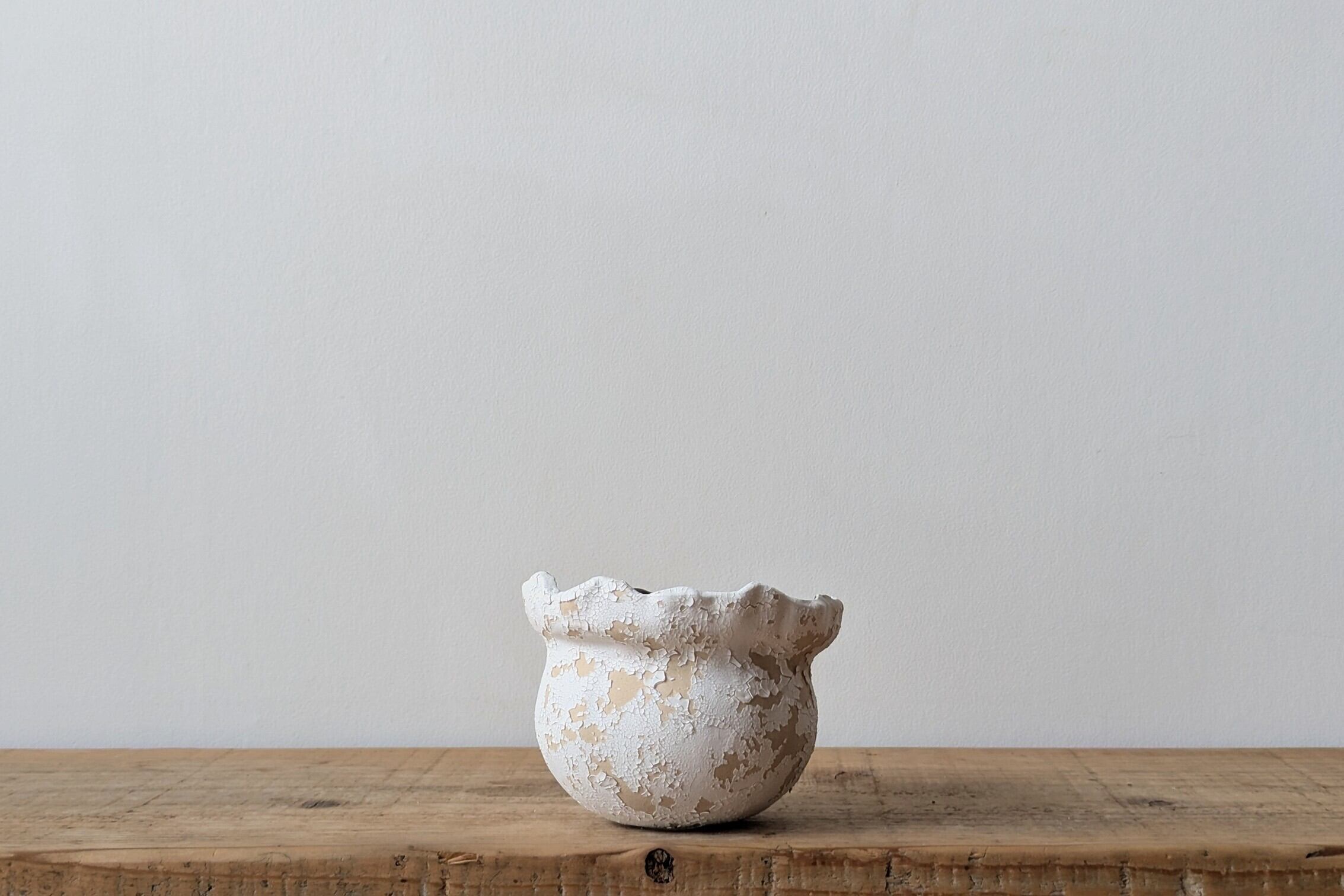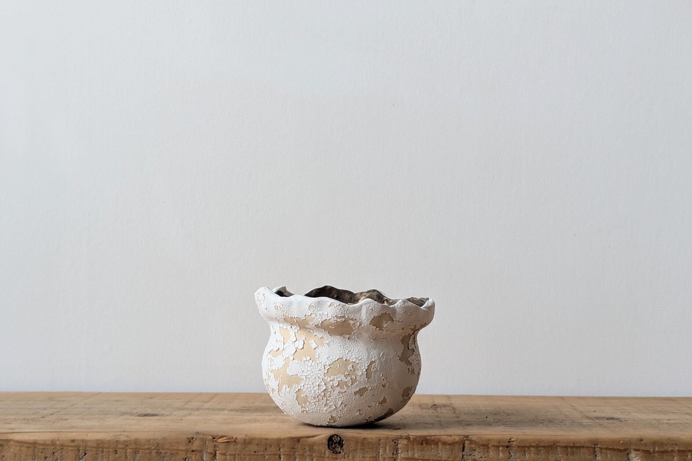 壷型に成型した陶土に特殊な製法で微細なひび割れをつくり、内側はアンティークゴールドの釉薬で仕上げました。あえて釉薬を表面に掛けない事でひび割れが剥がれていく表情を楽しむ事ができます。壷型の器は深すぎず浅すぎずでとても使い勝手がよく灌木やアガベ、低重心のサボテン等様々な植物に合わせる事が可能です。