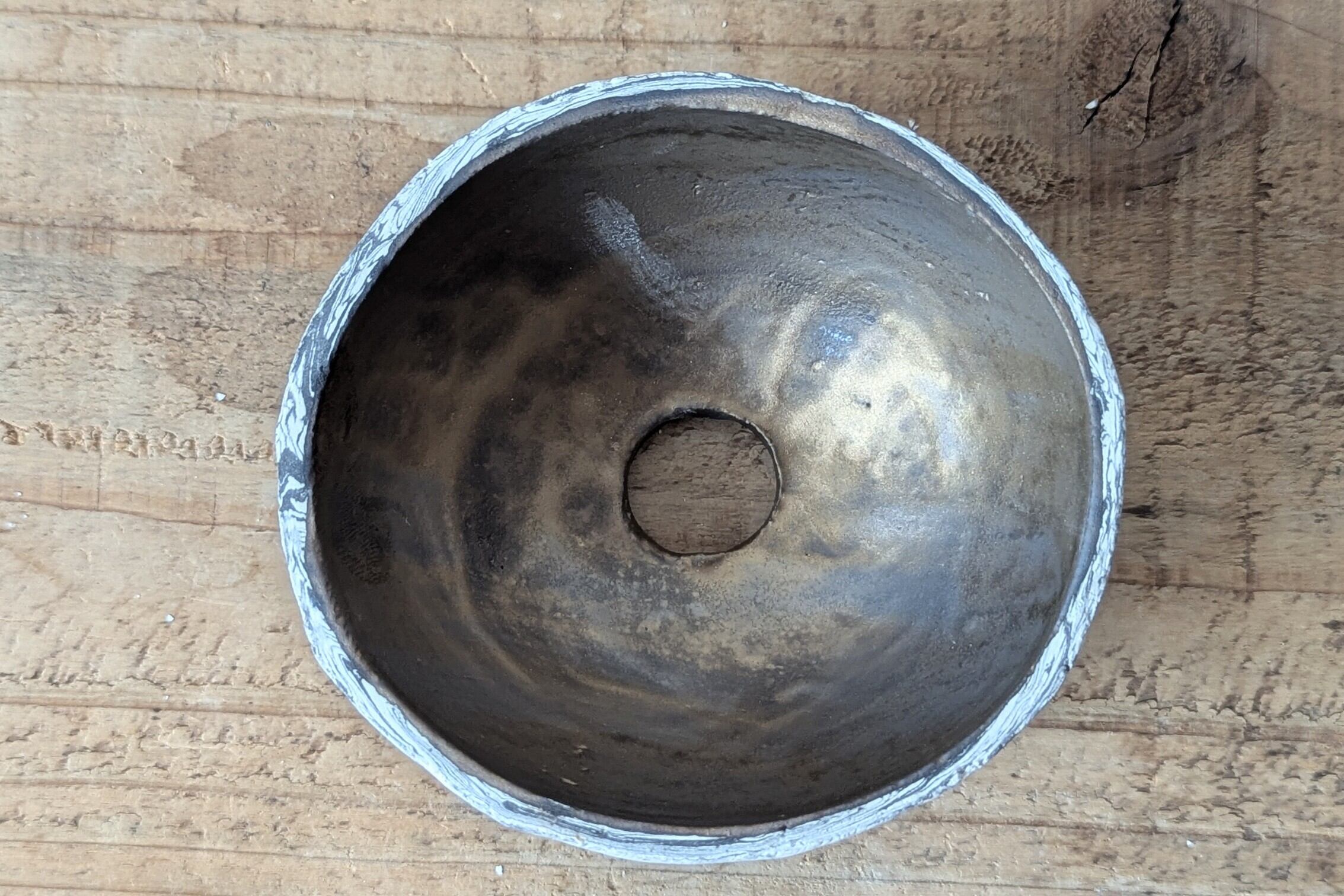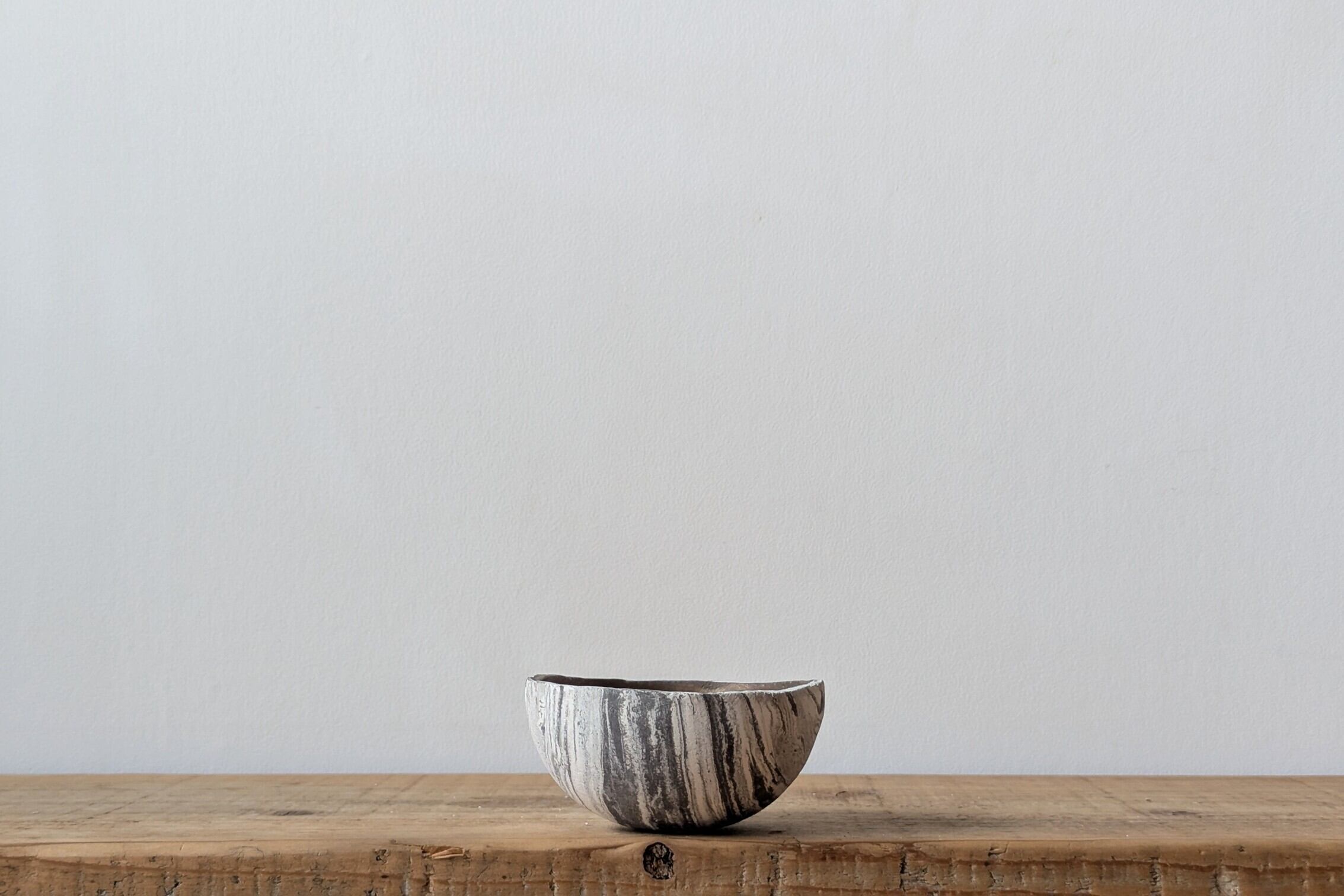 お椀型に成型した陶土に特殊な製法で練り込み、白と黒色が入り交わった模様のデザインを表現しました。薄めのブラックと白色のコントラストが落ち着いた表情の器です。