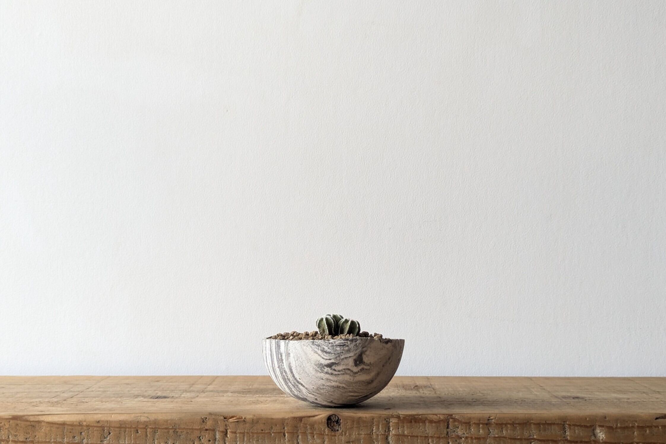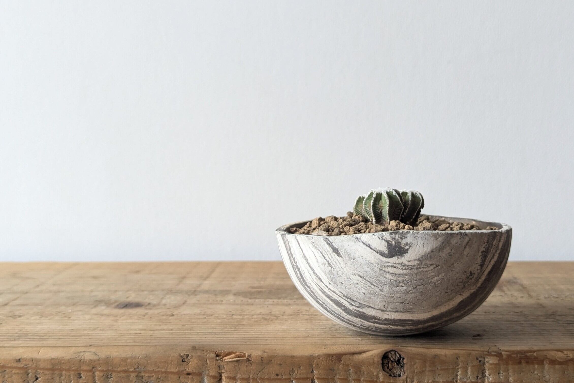 お椀型の器はとても浅い器のため、基本的には低重心のサボテンやチレコドンなどが合わせやすいですが、アガベの収まりもよく、コンパクトに育てる植物にぴったりの器です。