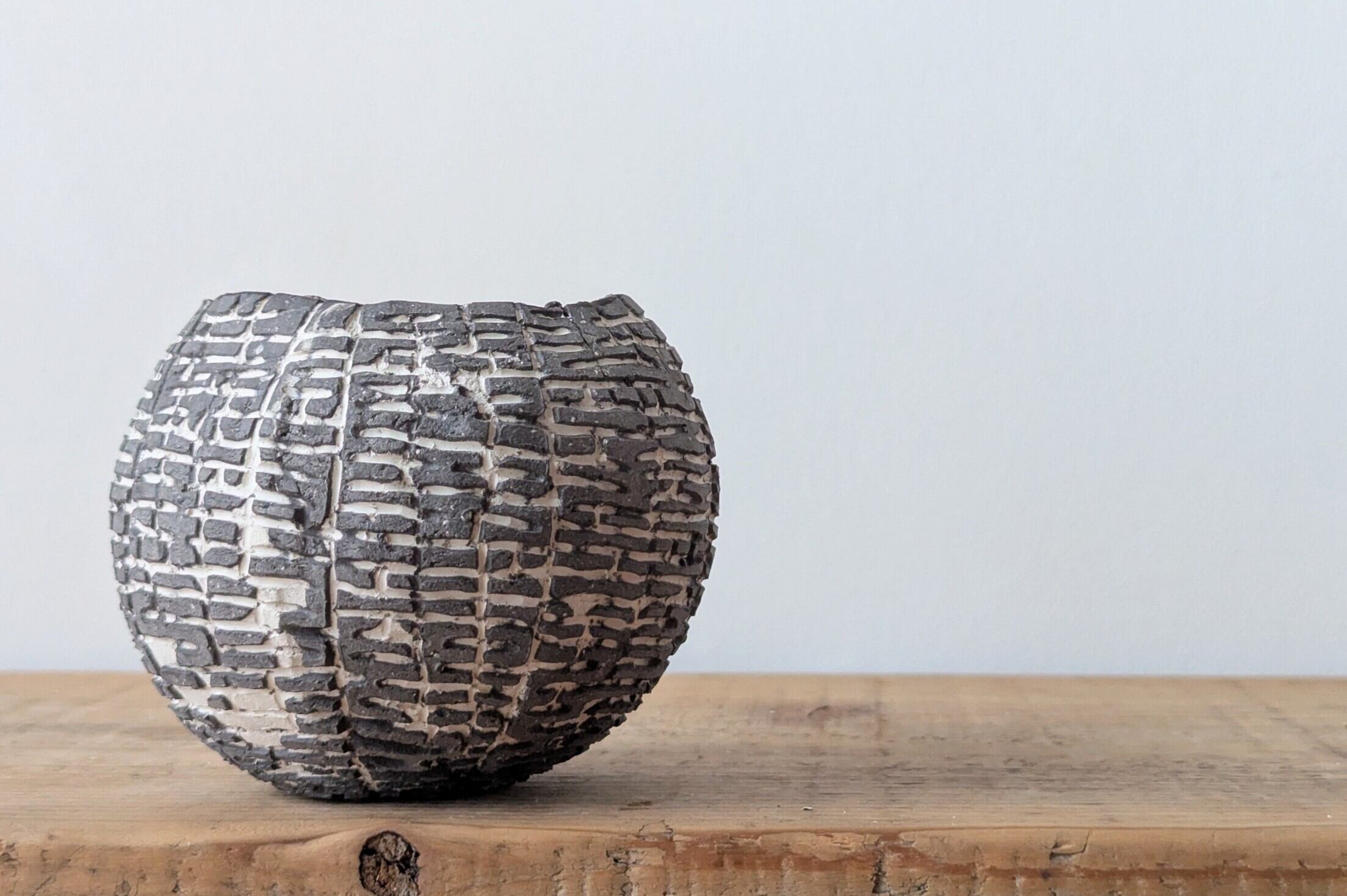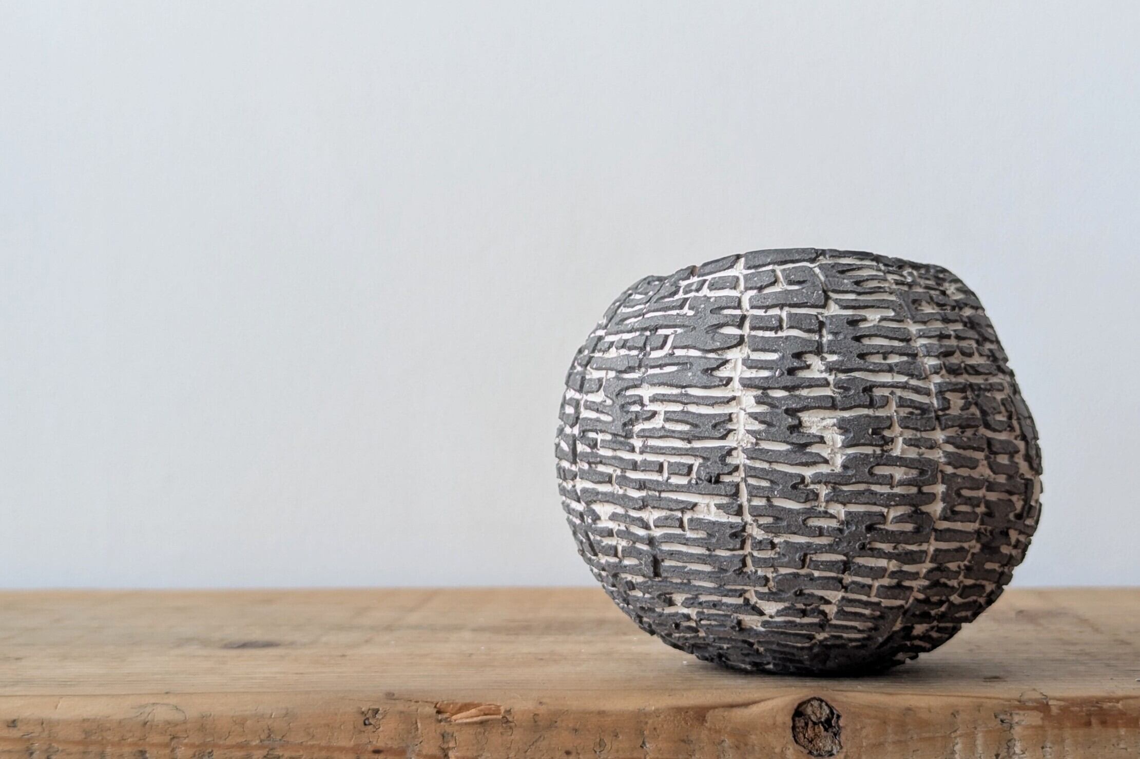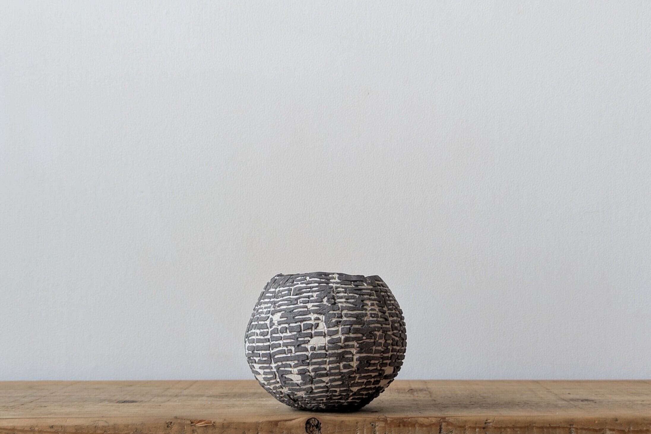 球型に成型した陶土に特殊な製法で薄めのブラックの細かな模様を施しました。何とも不思議な模様が見る角度で違った表情を楽しめます。