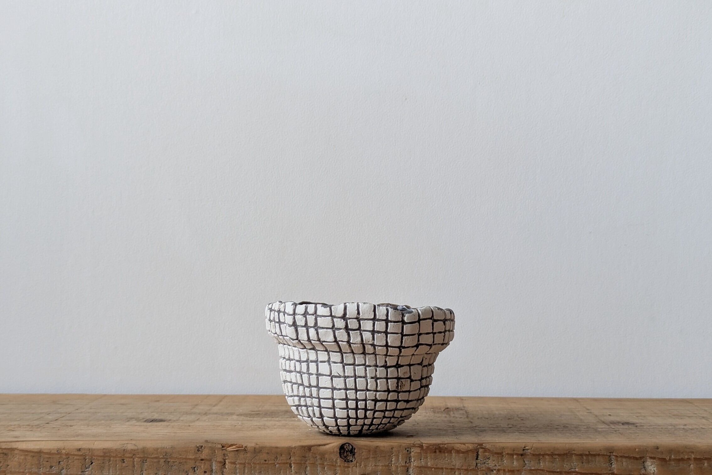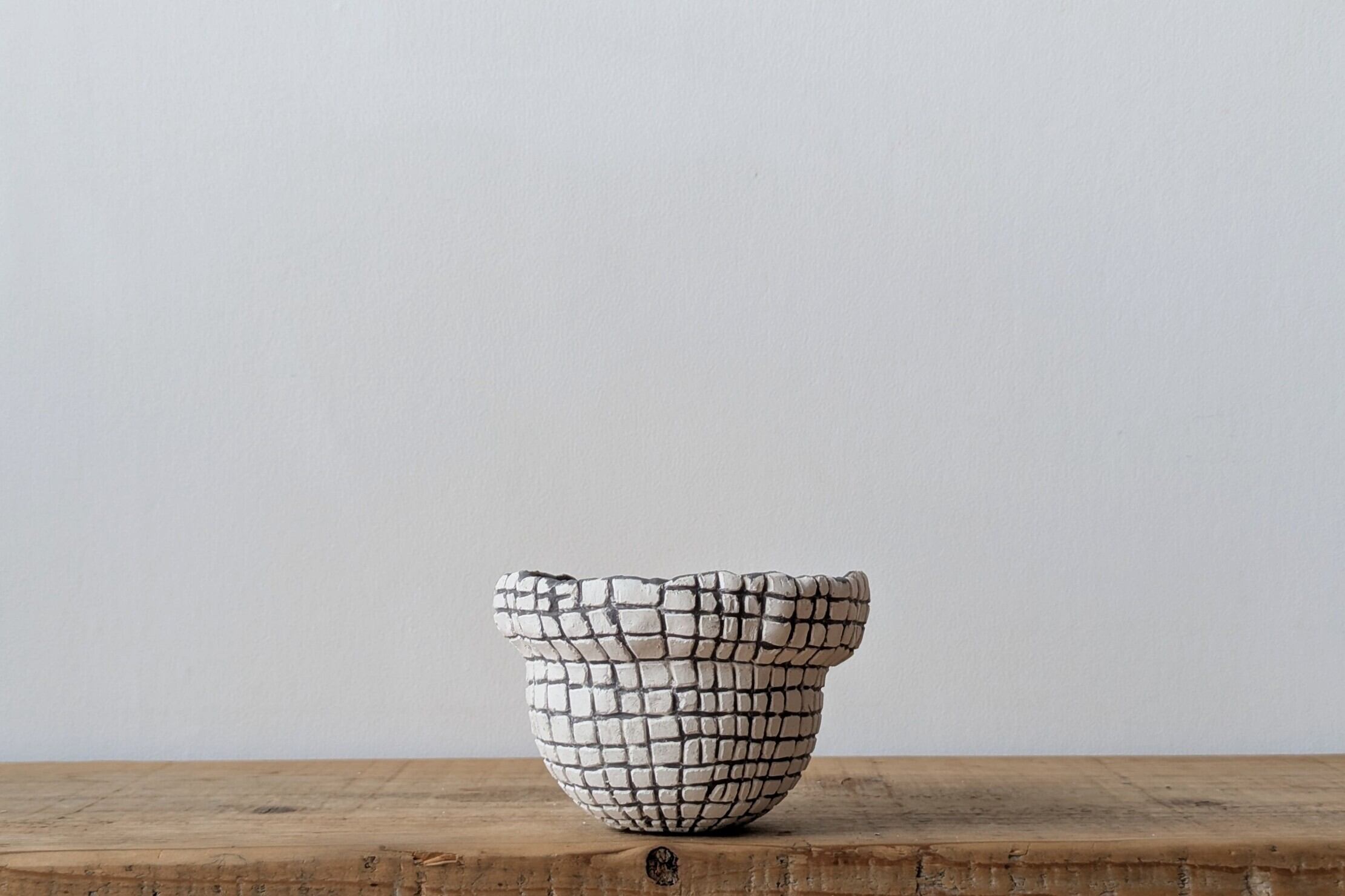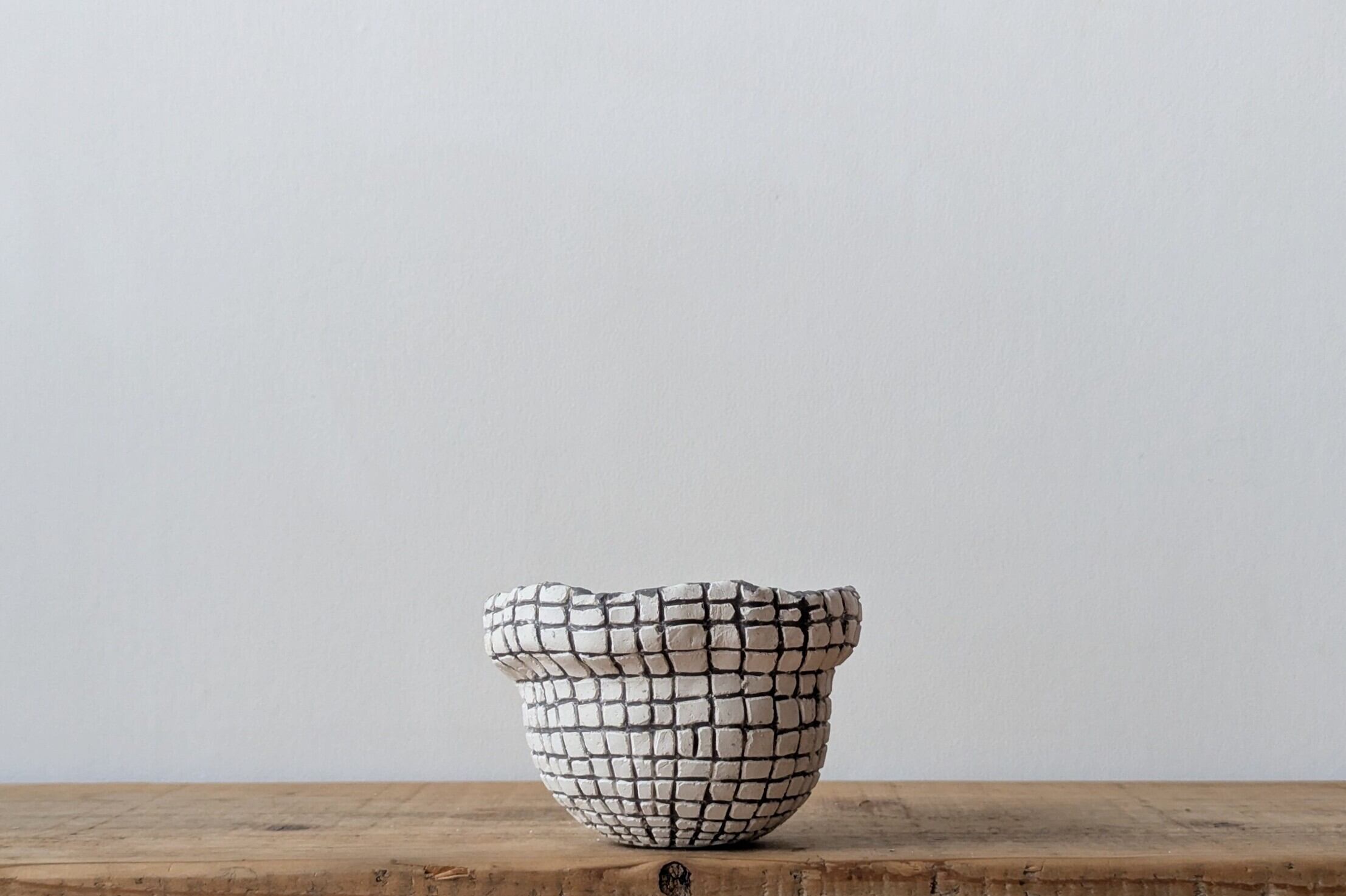 壷型に成型した陶土に特殊な製法で白色が引き立つ様アッシュブラックの格子状の線を彫りました。