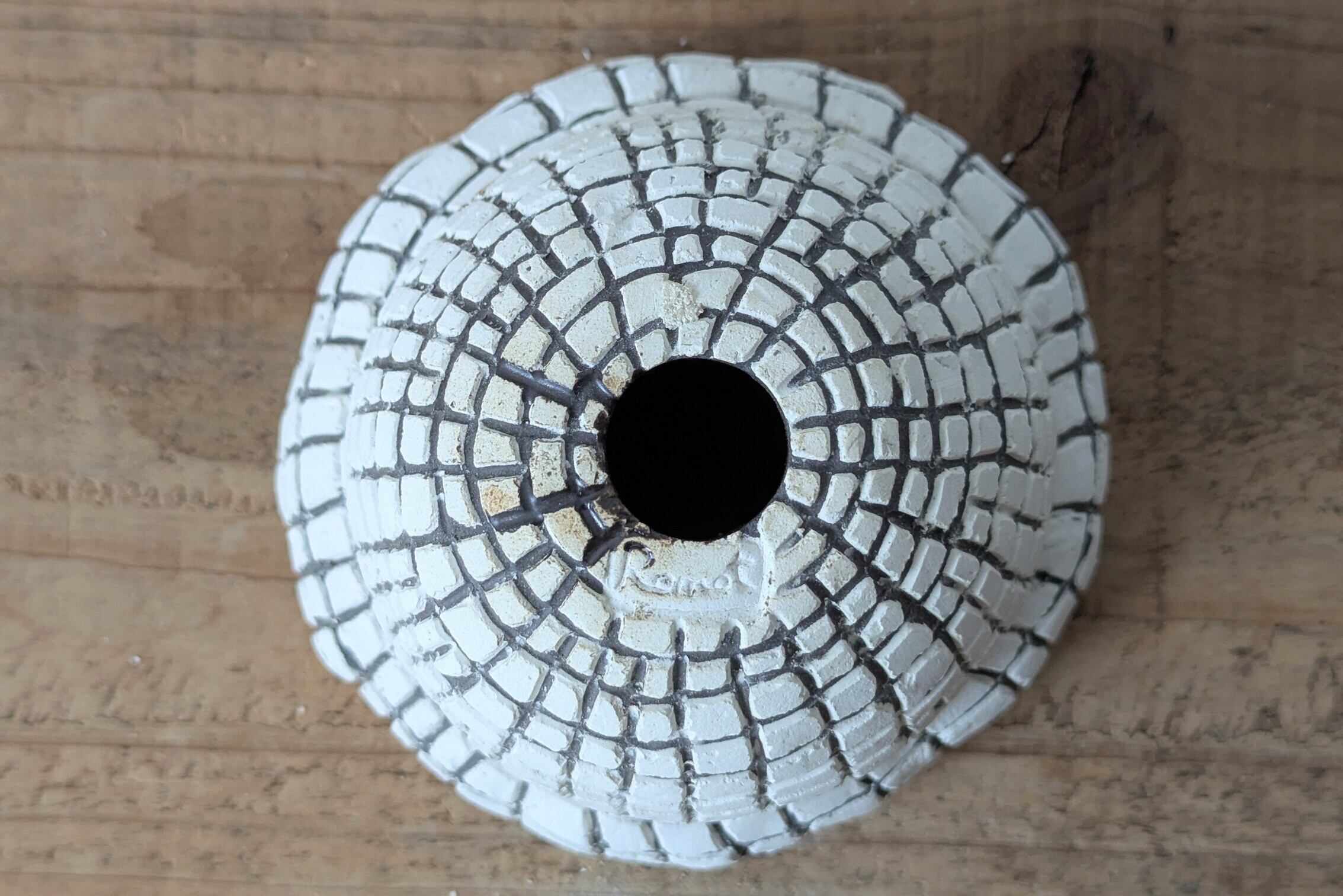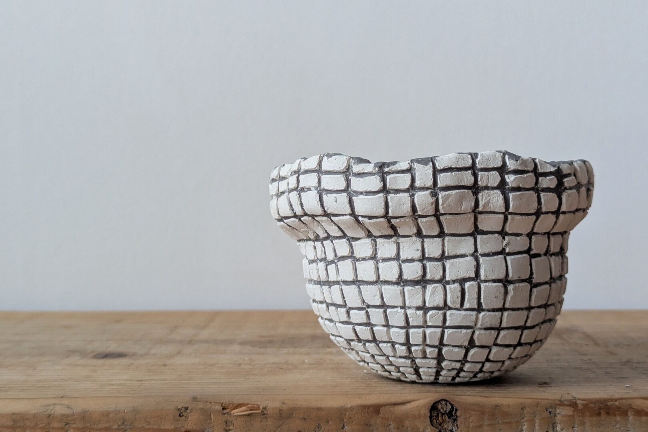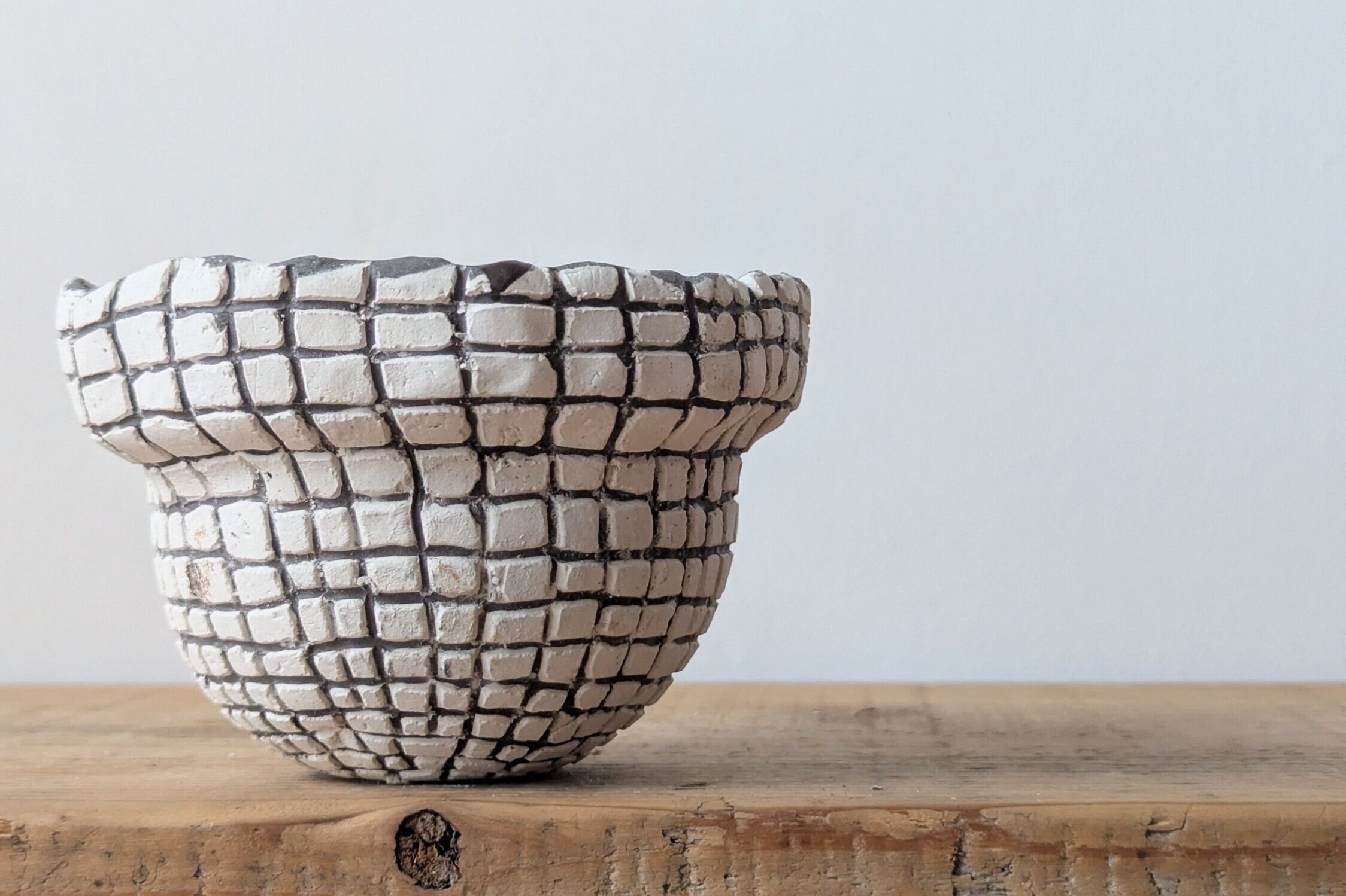 壷型に成型した陶土に特殊な製法で白色が引き立つ様アッシュブラックの格子状の線を彫りました。