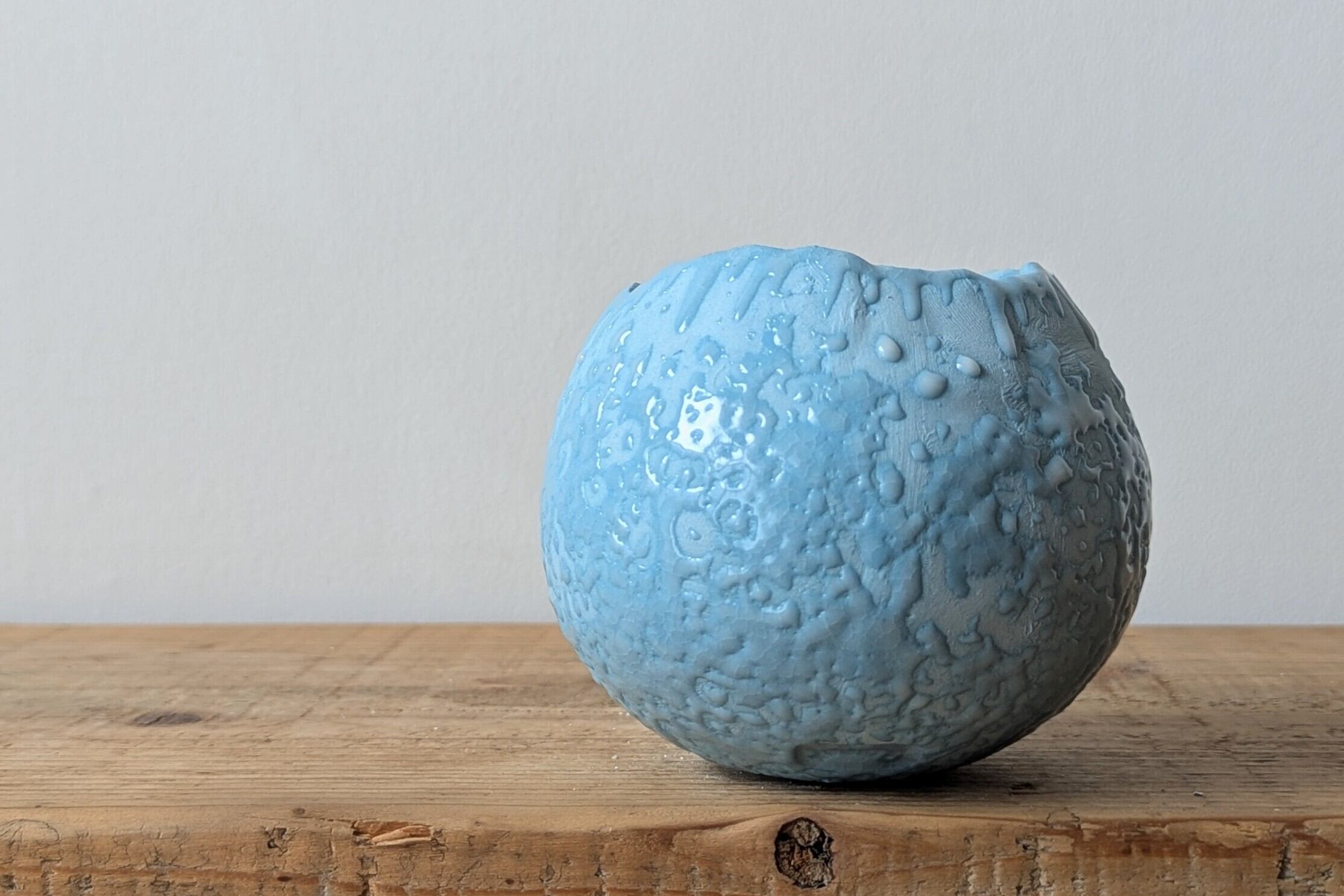 球型に成型した陶土に特殊な製法で透明な釉薬を水滴や器からこぼれるような表現をデザインしました。