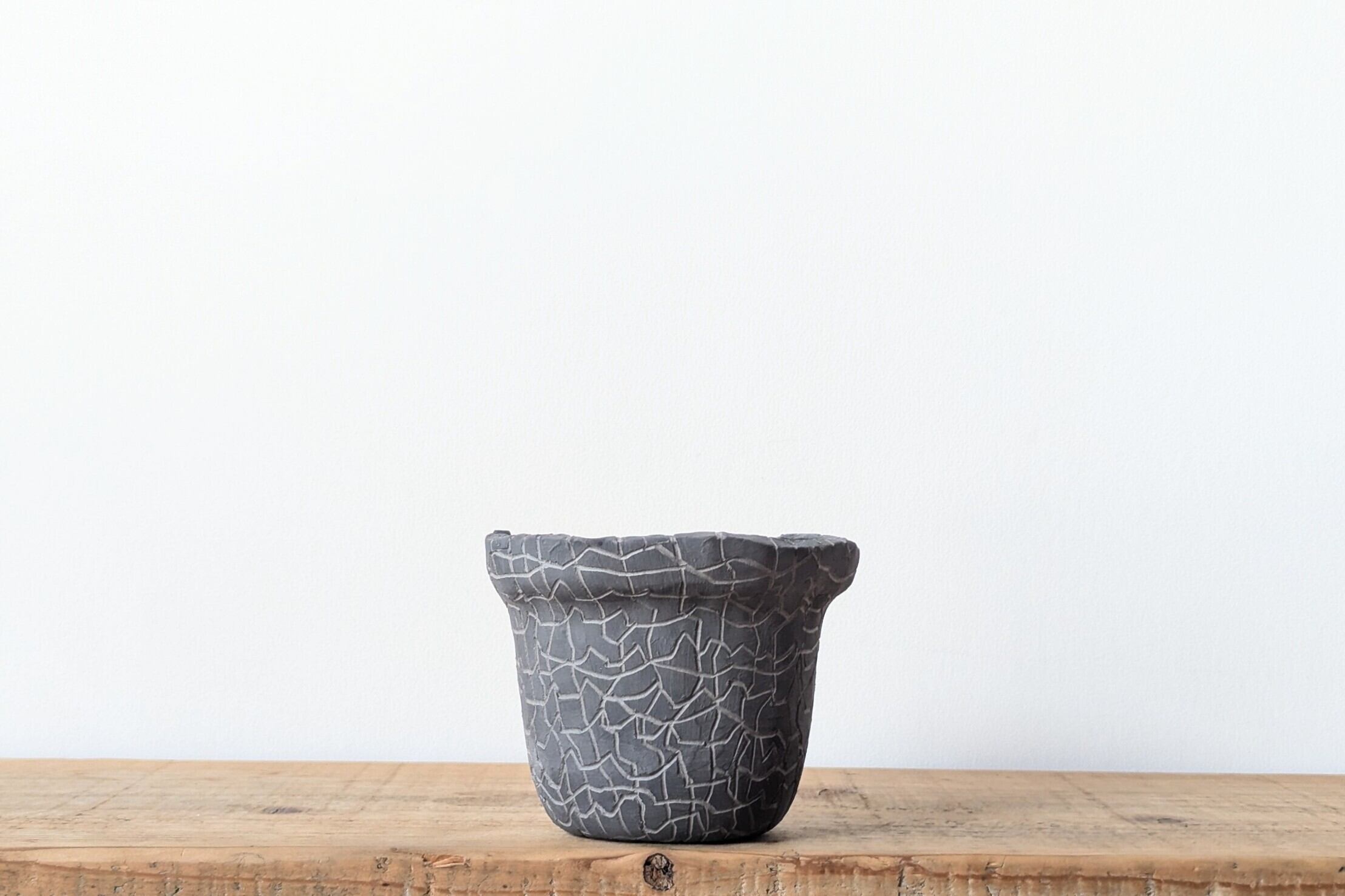 特別に練り込みした陶土を花瓶型に成型し、ジオメトリックな模様を施し、内側はアンティークゴールドの釉薬で仕上げました。ダークグレーとグレーのコントラストが美しい仕上がりになっています。