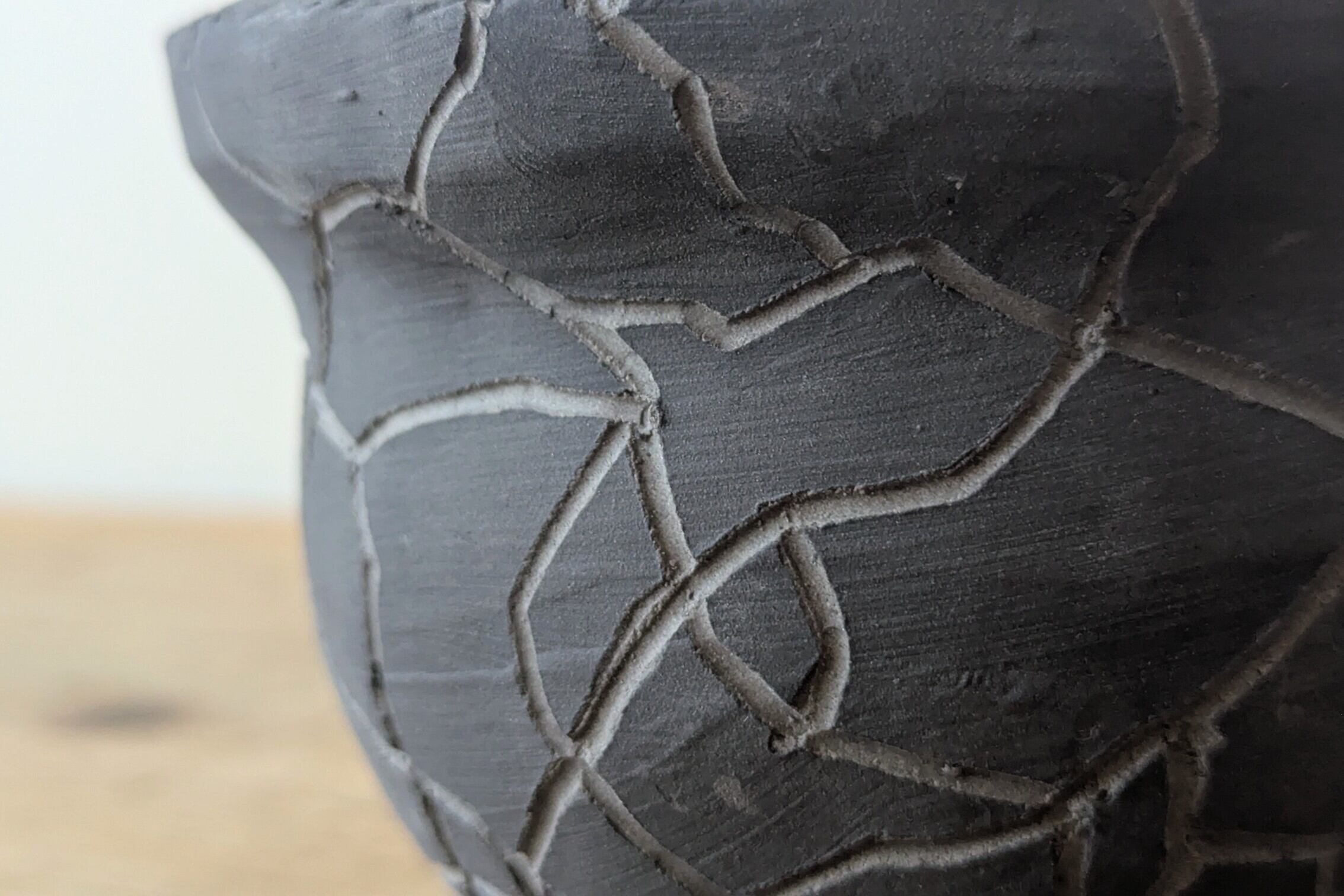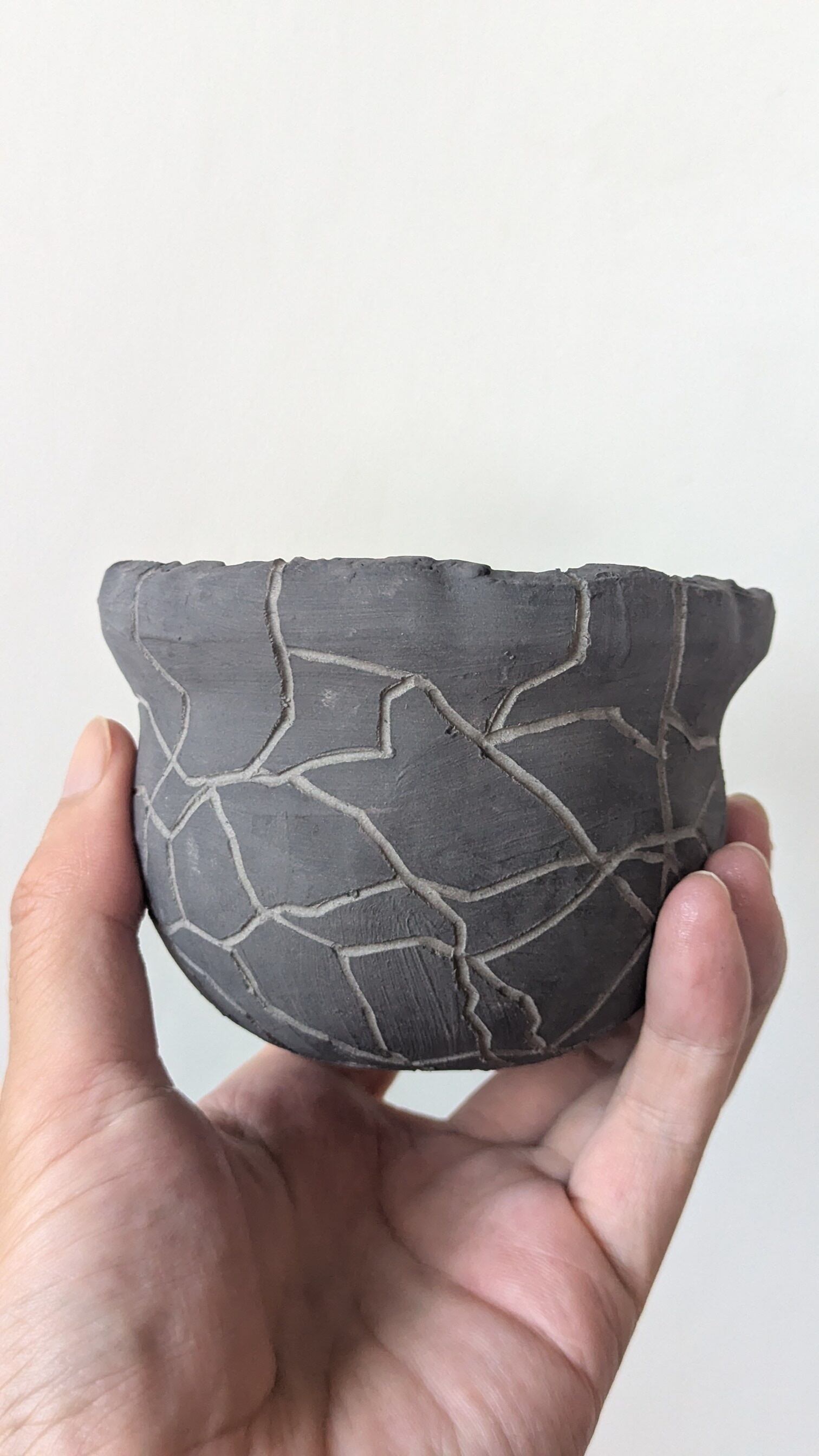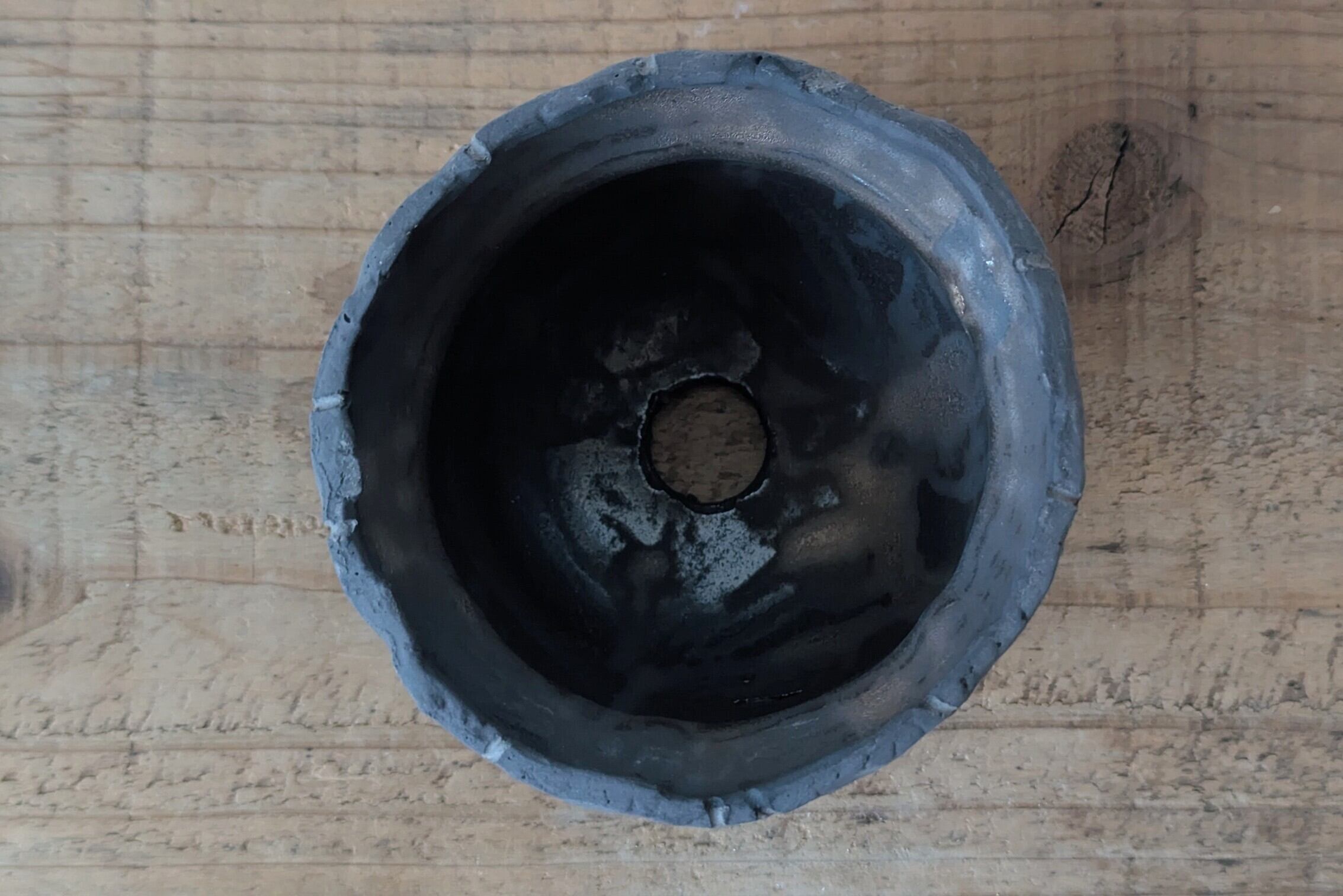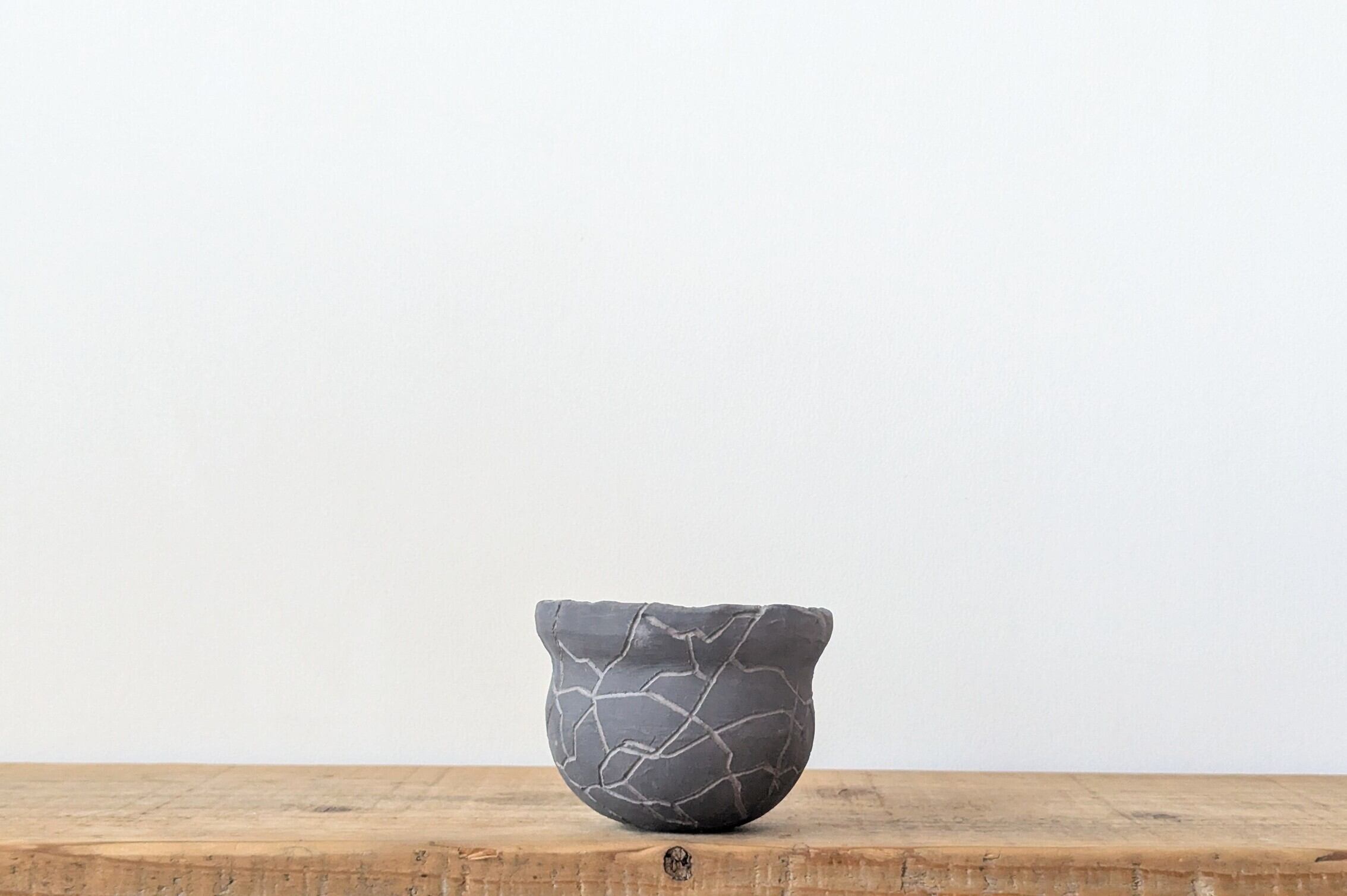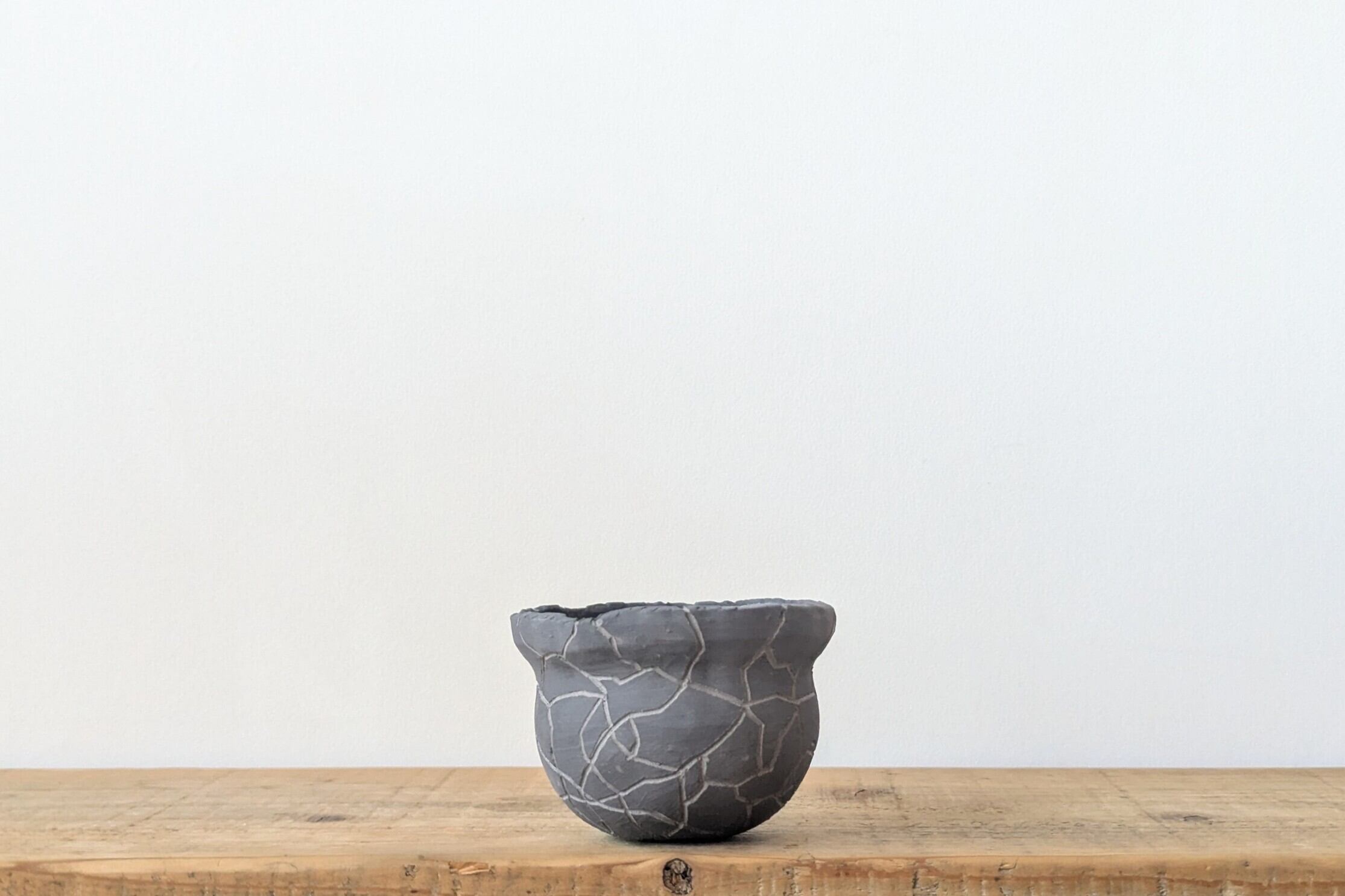 特別に練り込みした陶土を金魚鉢型に成型し、ひび割れ模様を施し、内側はアンティークゴールドの釉薬で仕上げました。ダークグレーとグレーのコントラストが美しい仕上がりになっています。