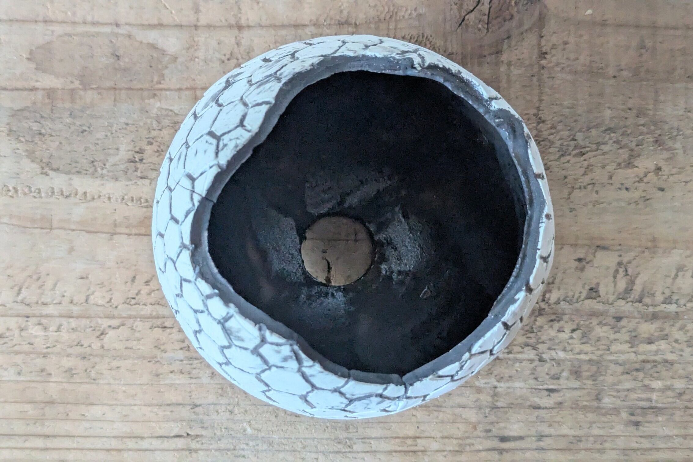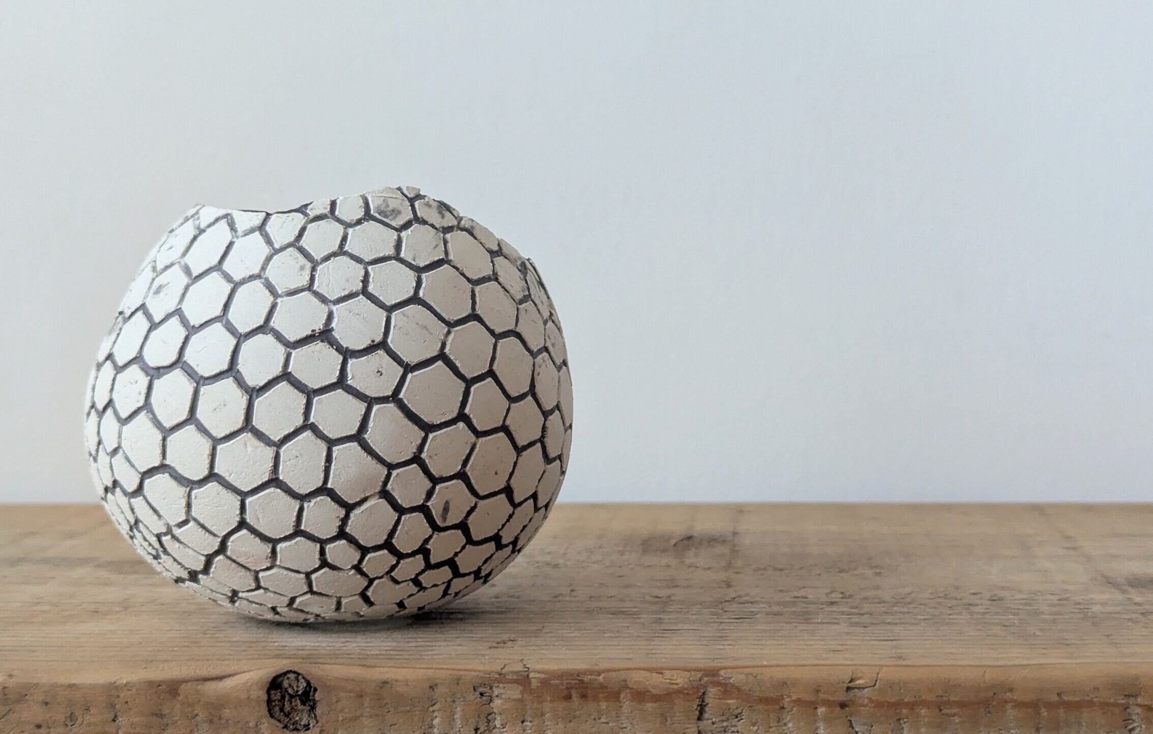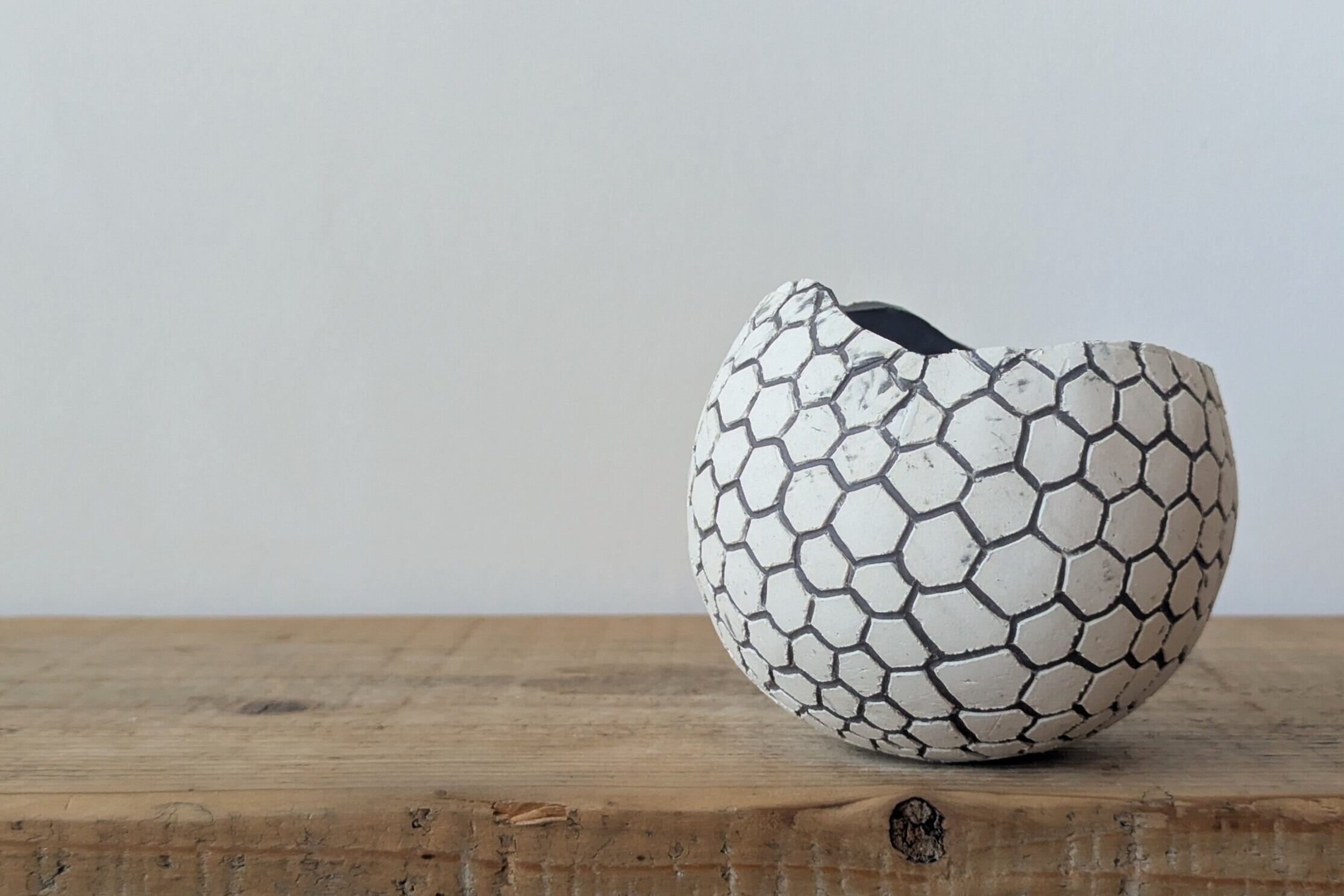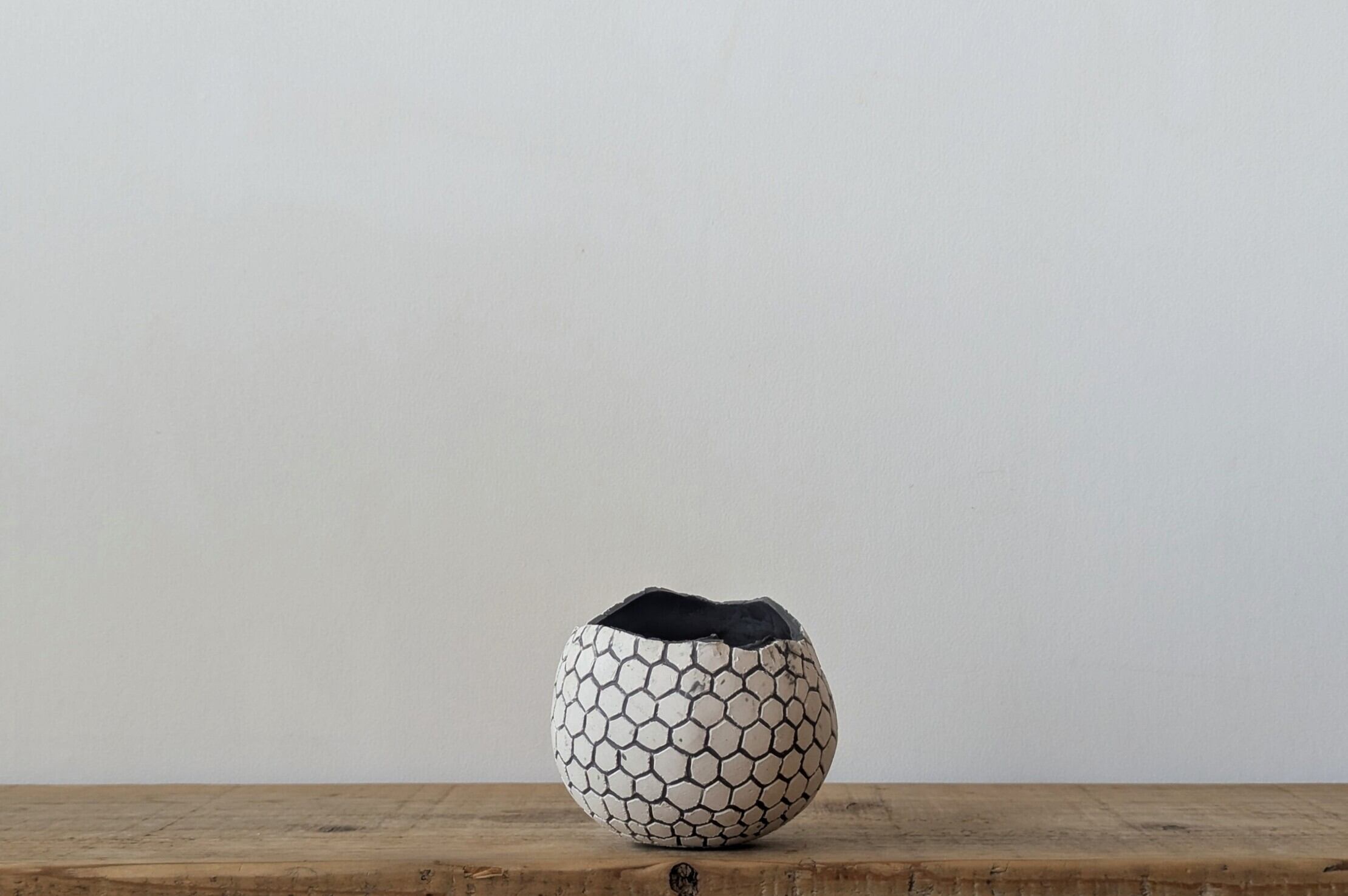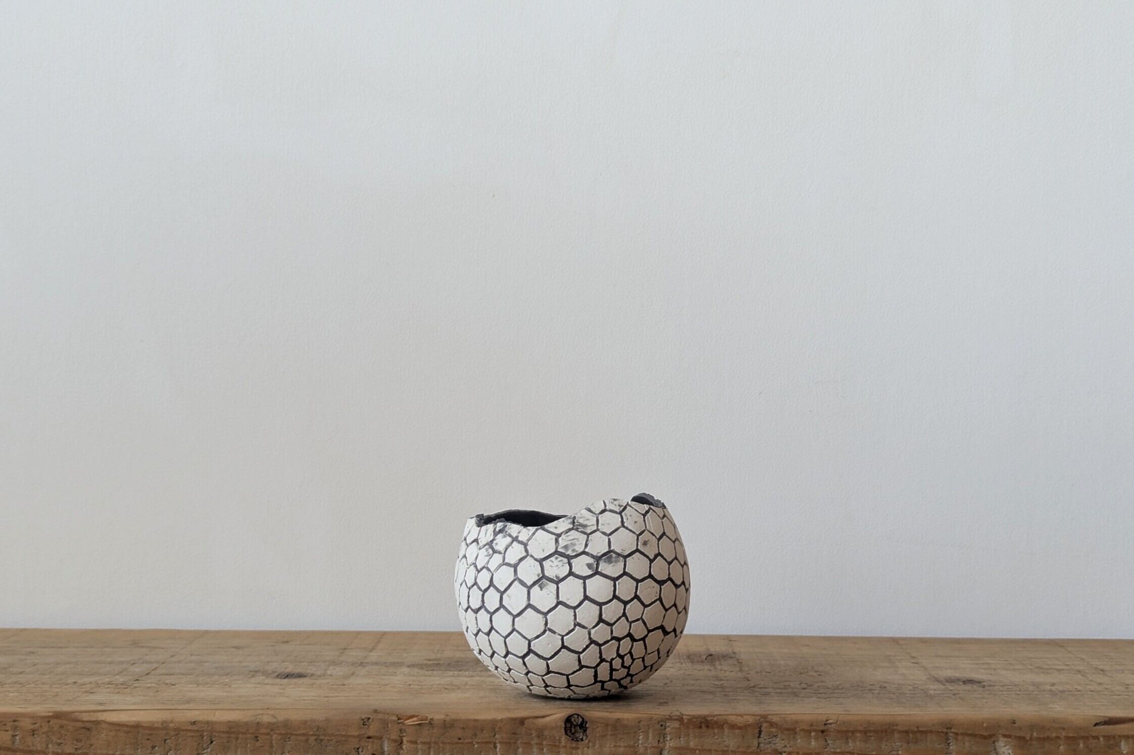 球型に成型した陶土に特殊な製法で薄めのブラックの細かな模様を施しました。龍の鱗の様な不思議な模様が見る角度で違った表情を楽しめます。