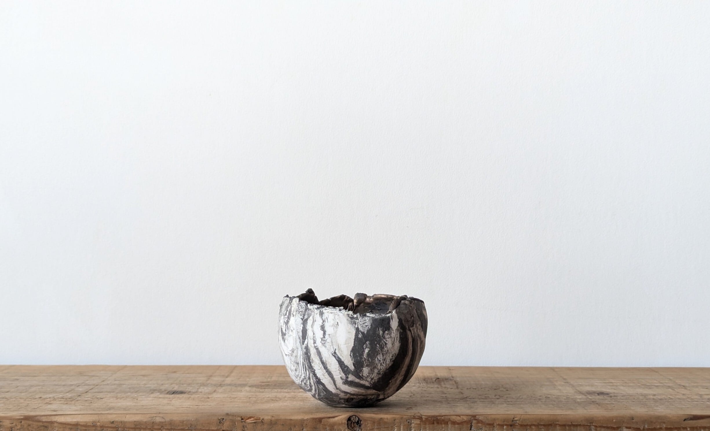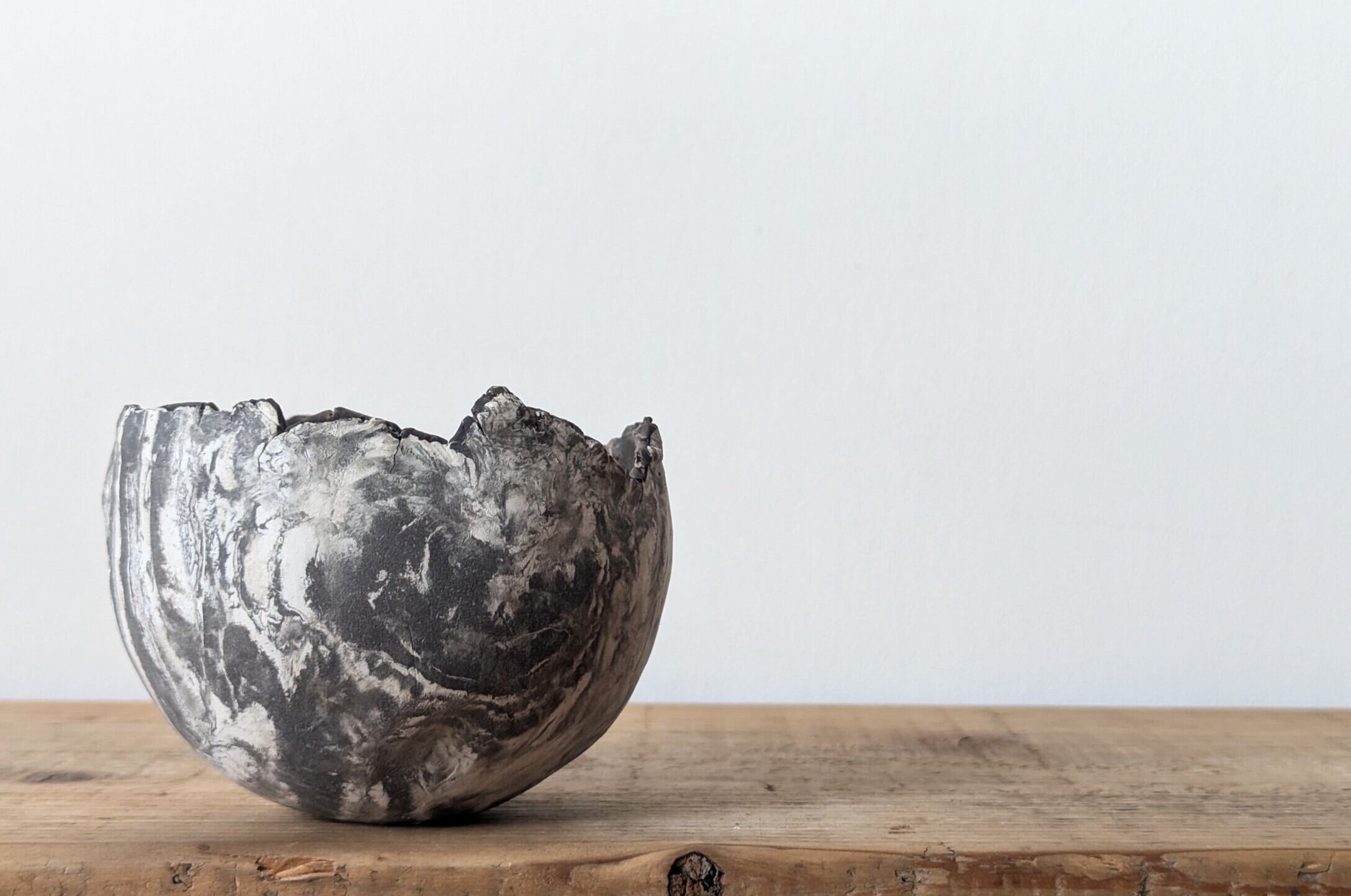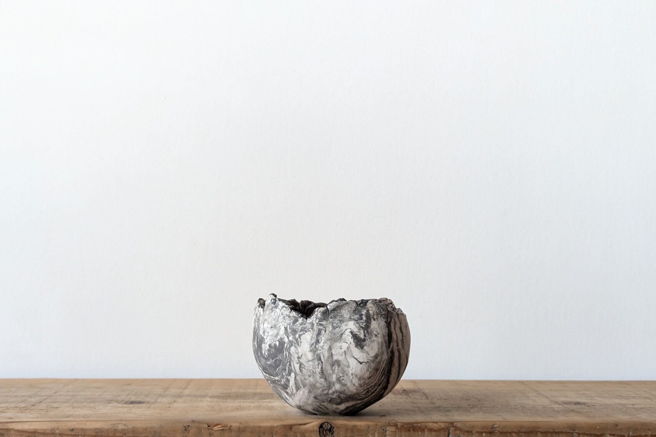 陶土を練り込み、球型に成形し、白と黒色が入り交わったマーブル模様のデザインを表現しました。薄めのブラックと白色のコントラストが美しく見る角度で違った表情を楽しめる器です。