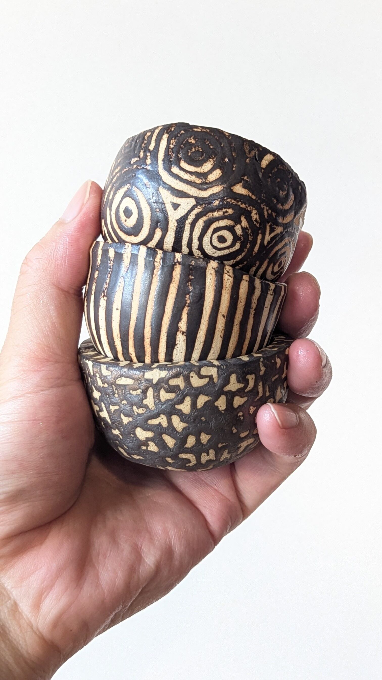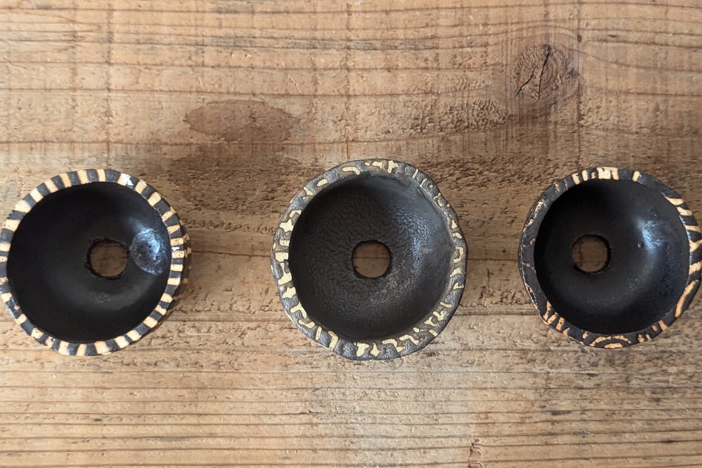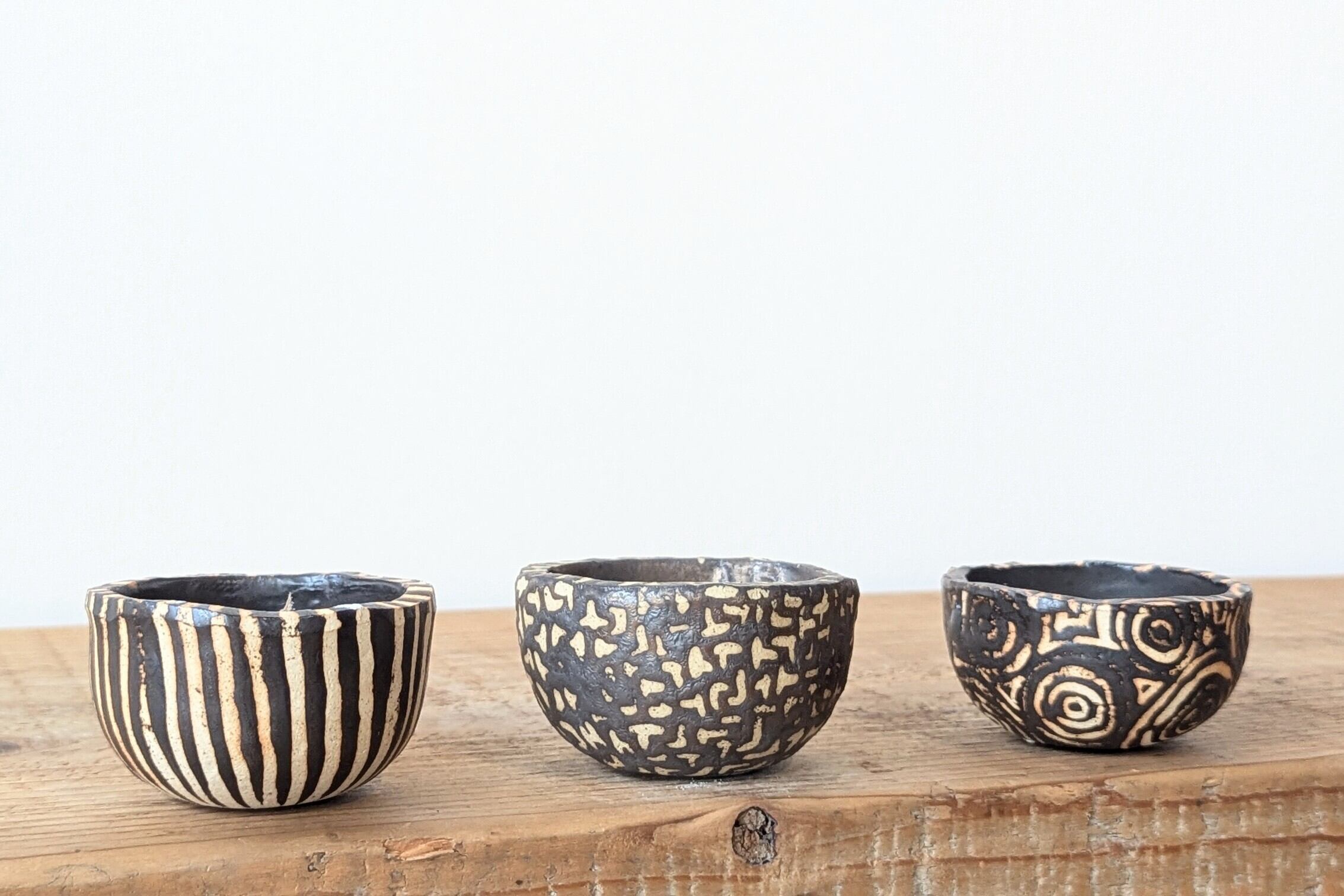 信楽土をおちょこ状に成形し、特殊な技法でアンティークゴールドの釉薬を塗り不思議な模様を浮き立たせましたどこか異国の民族が使っていそうな雰囲気の器です。