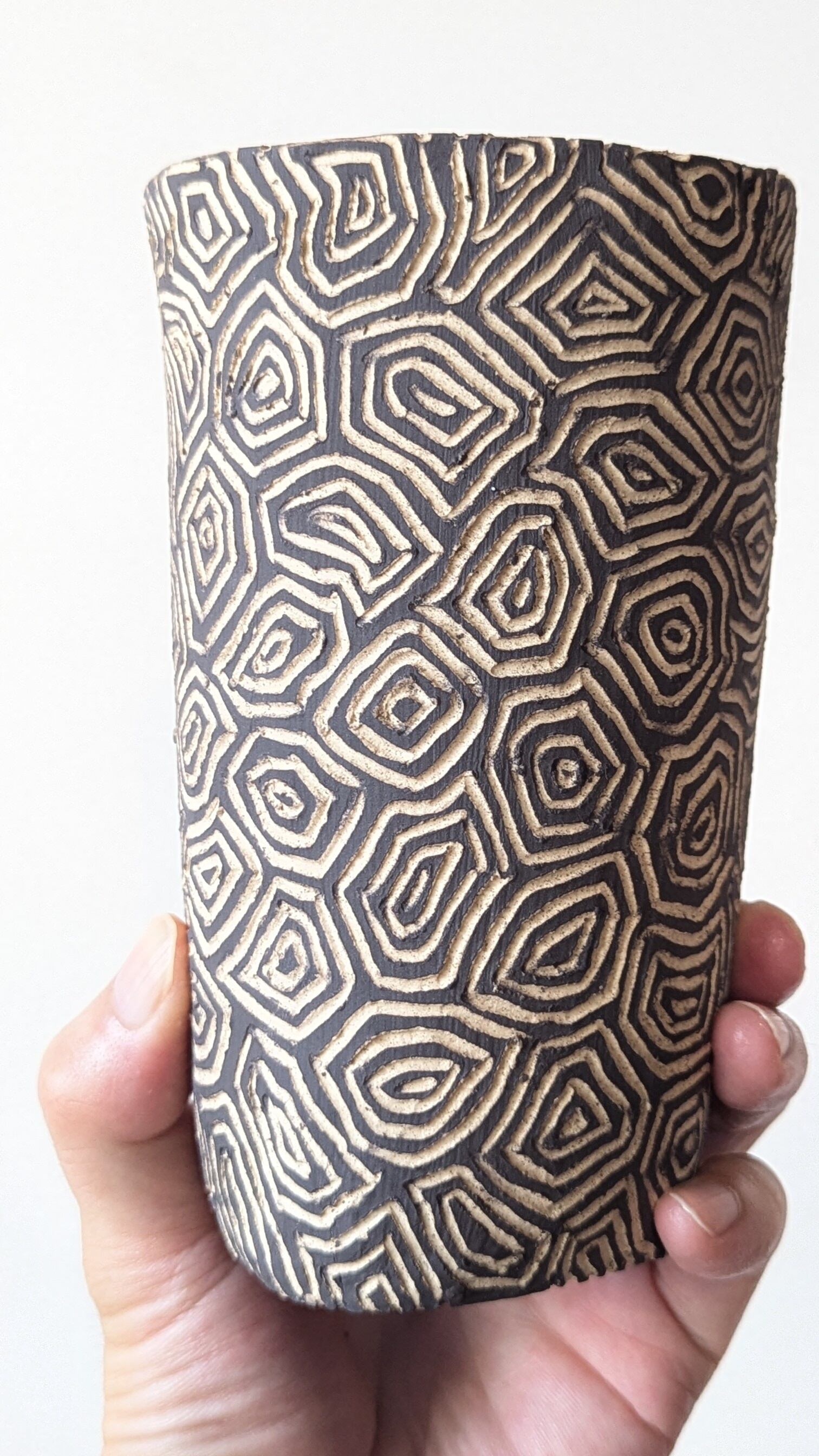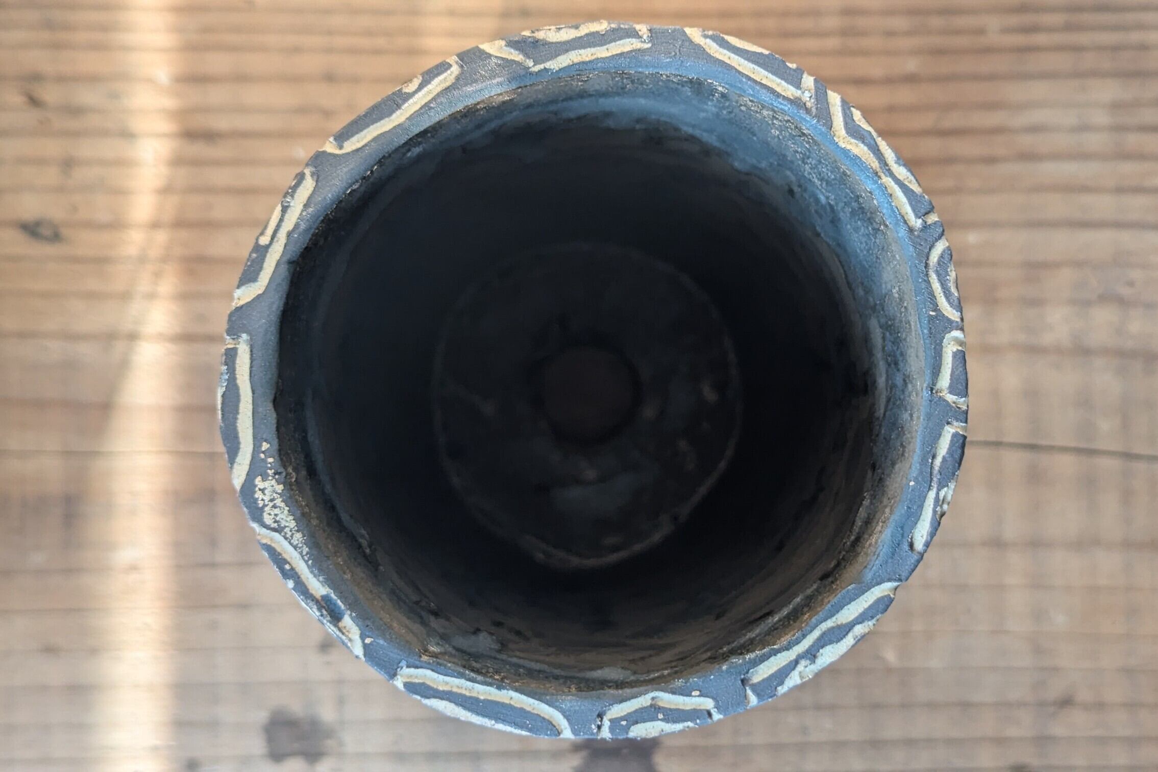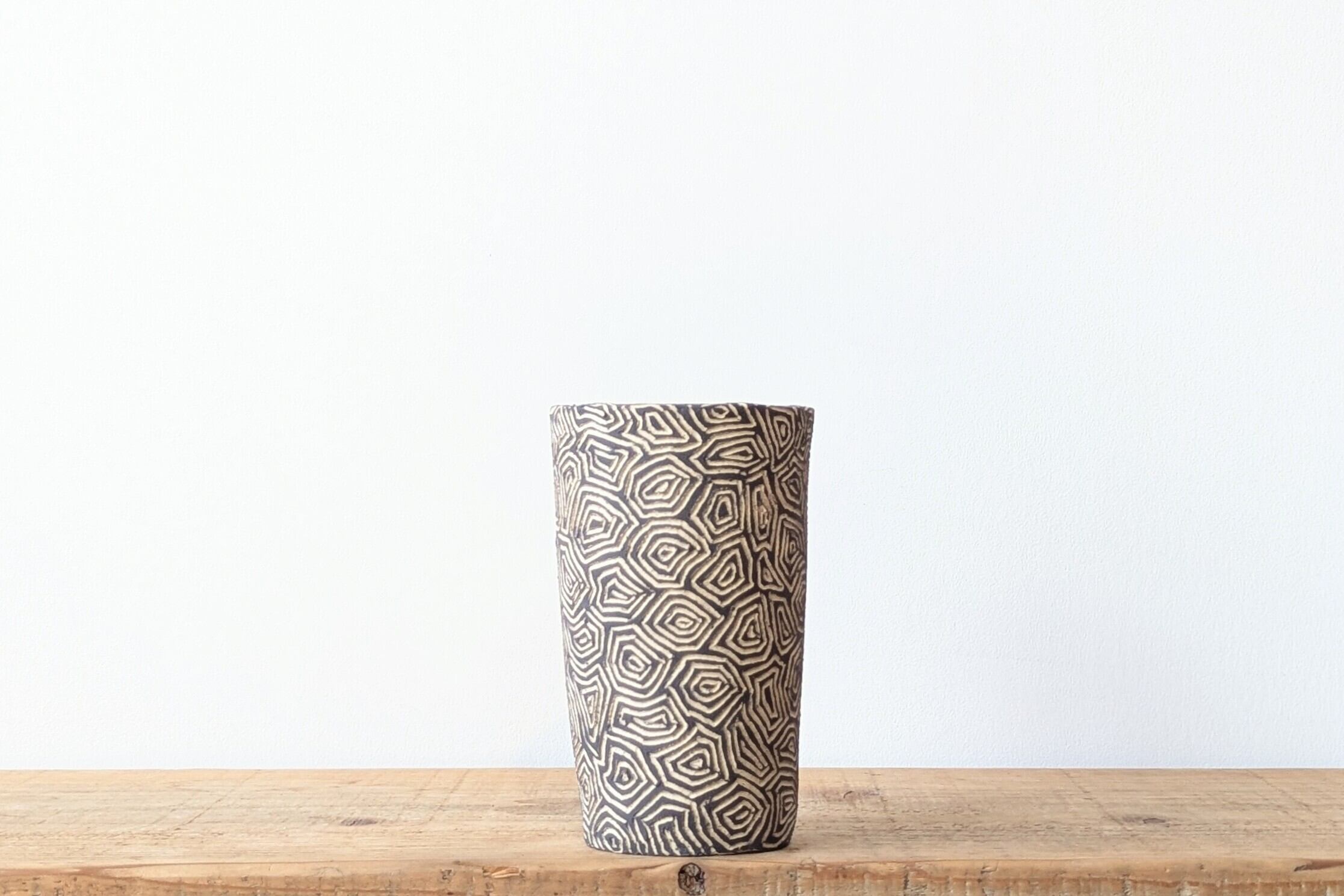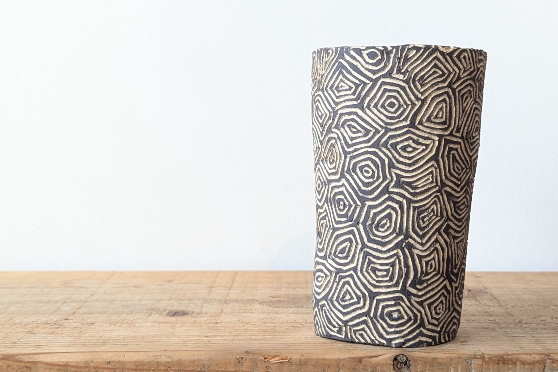 信楽土を筒型に成型し、ジオメトリックな模様を施し、内側はアンティークゴールドの釉薬で仕上げました。ダークグレーとベージュのコントラストが美しい仕上がりになっています。