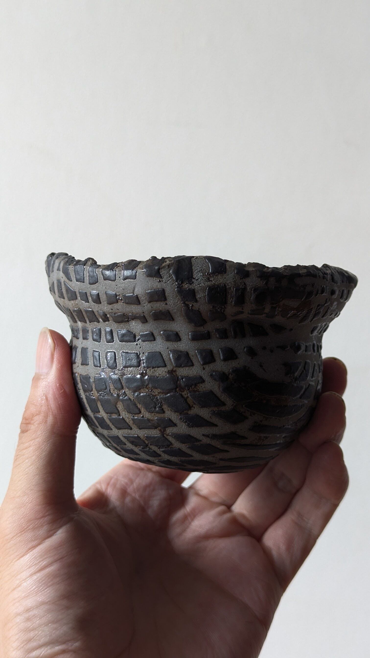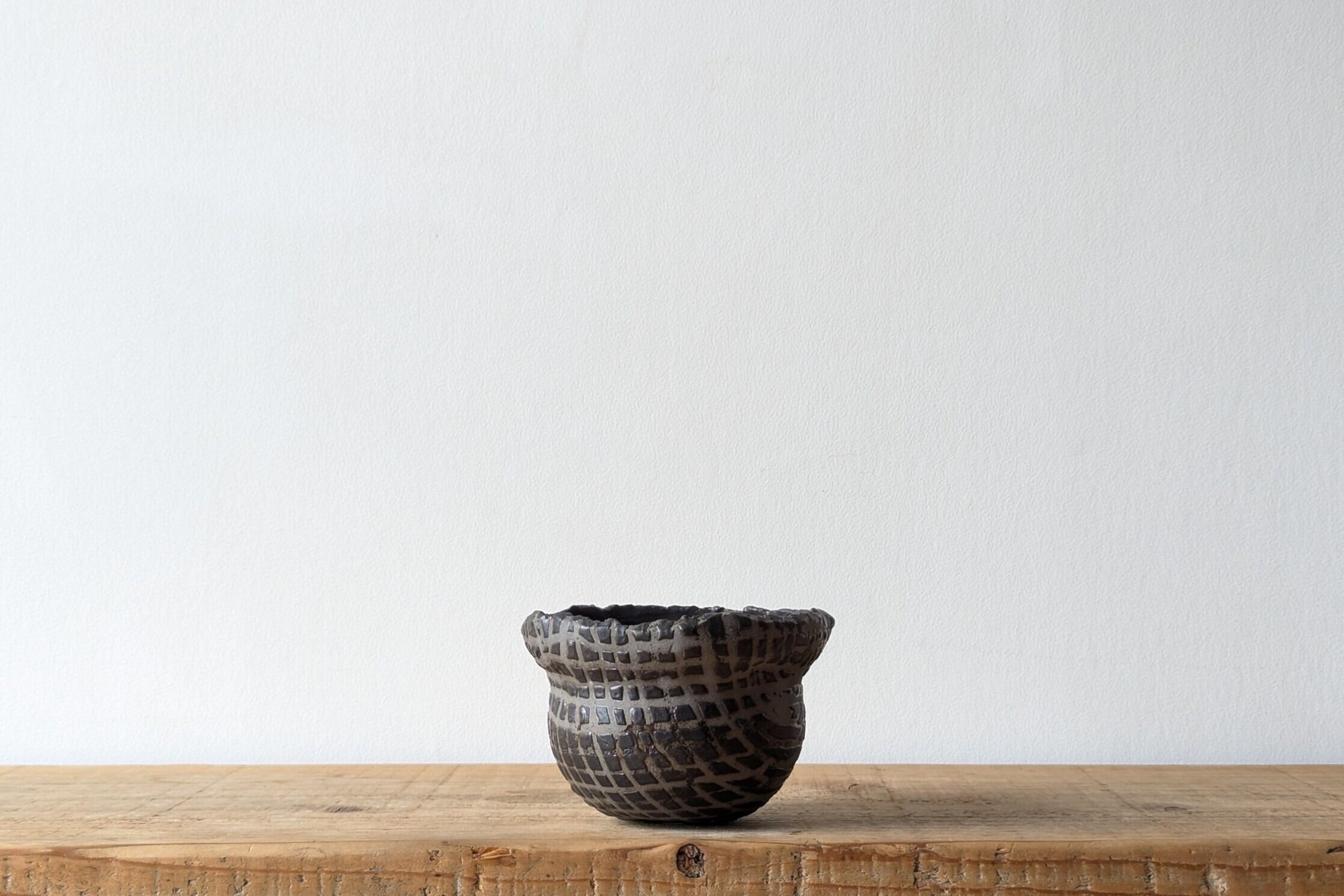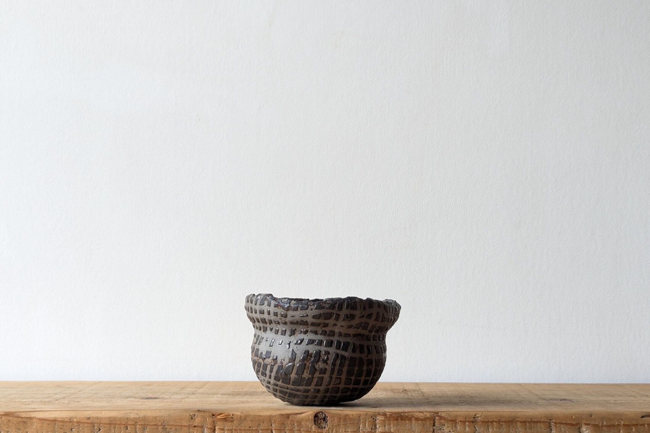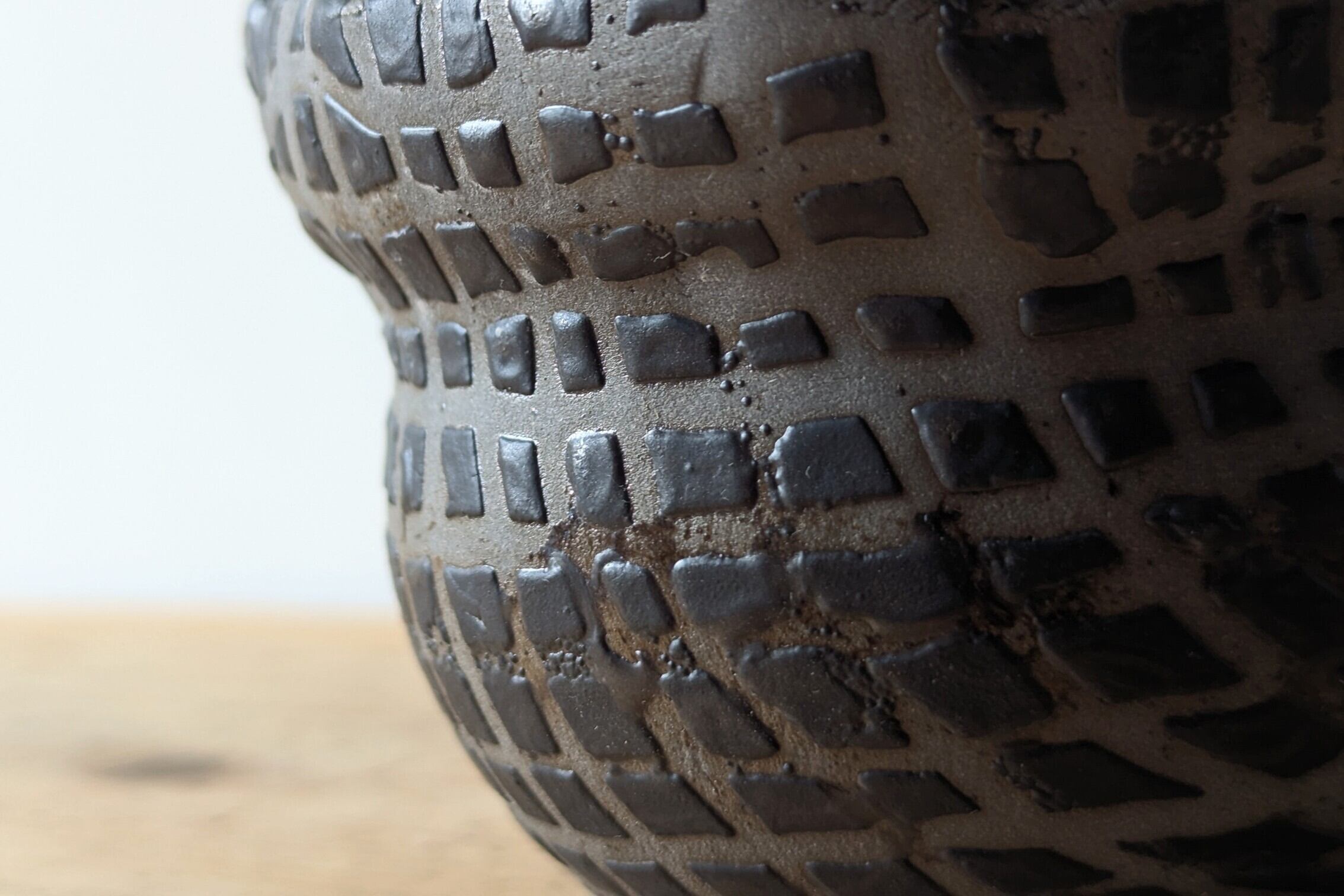 壷型に成型した陶土に特殊な製法でマットブラックの釉薬で規則性のある凹凸模様を施しました。何とも不思議な模様が見る角度で違った表情を楽しめます。