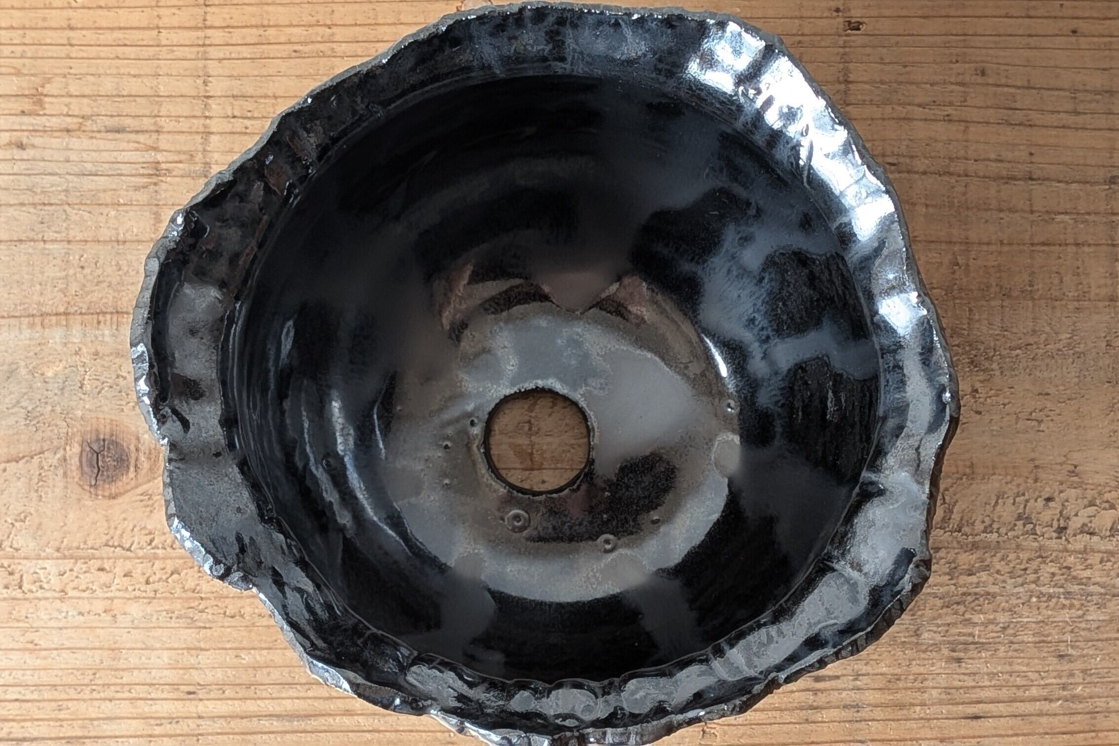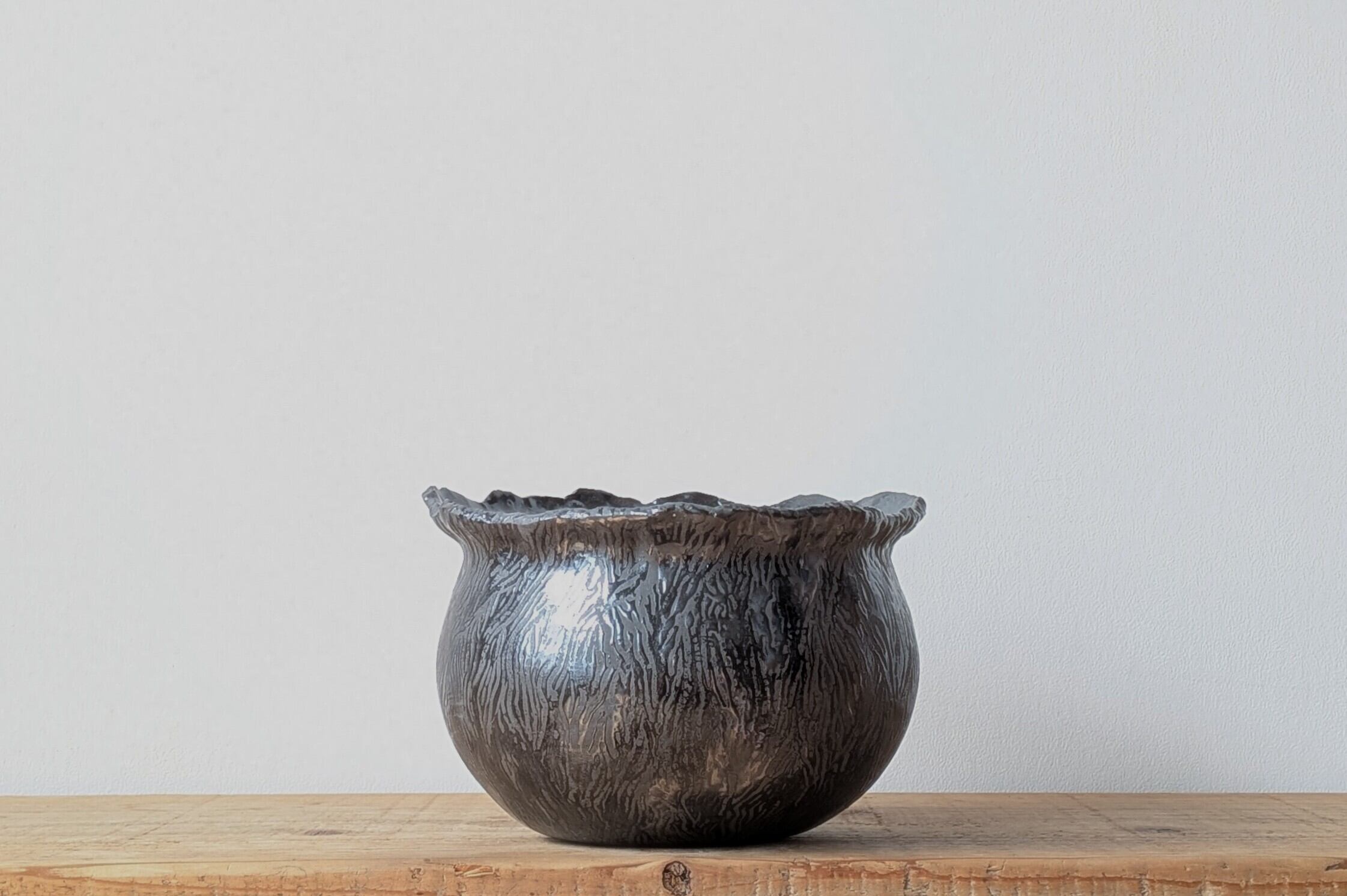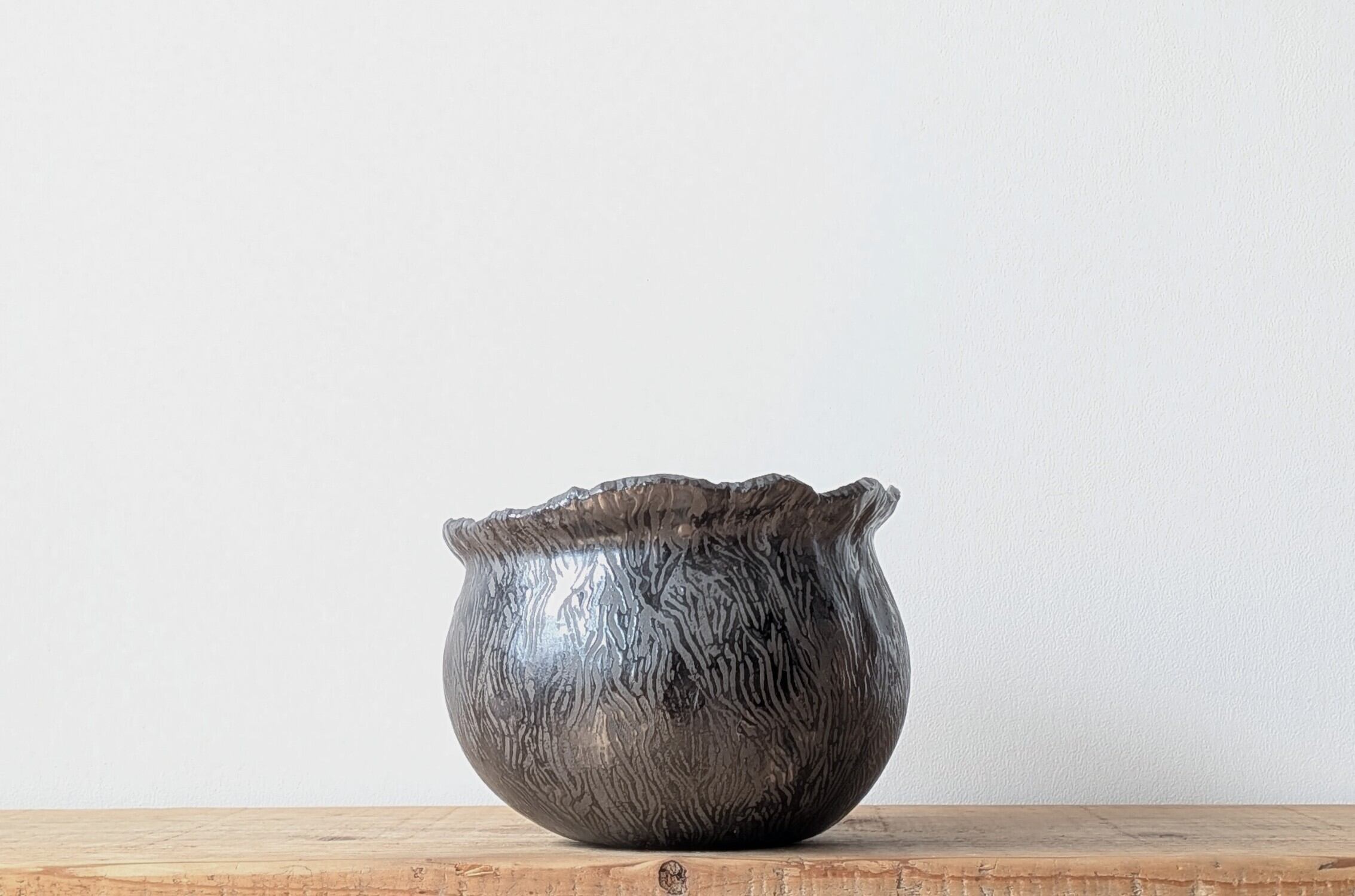 Ramat史上最大サイズの器、黒土に特殊な製法で細い模様になるように釉薬を施し、木の表面の様な、葉っぱの葉脈のような不思議なデザインです。通常の金魚鉢型の2倍サイズとなりますが見た目は4倍くらいあります。市場にも中々無いサイズ感の器なので様々な塊根植物の大物サイズが収まるイメージです。