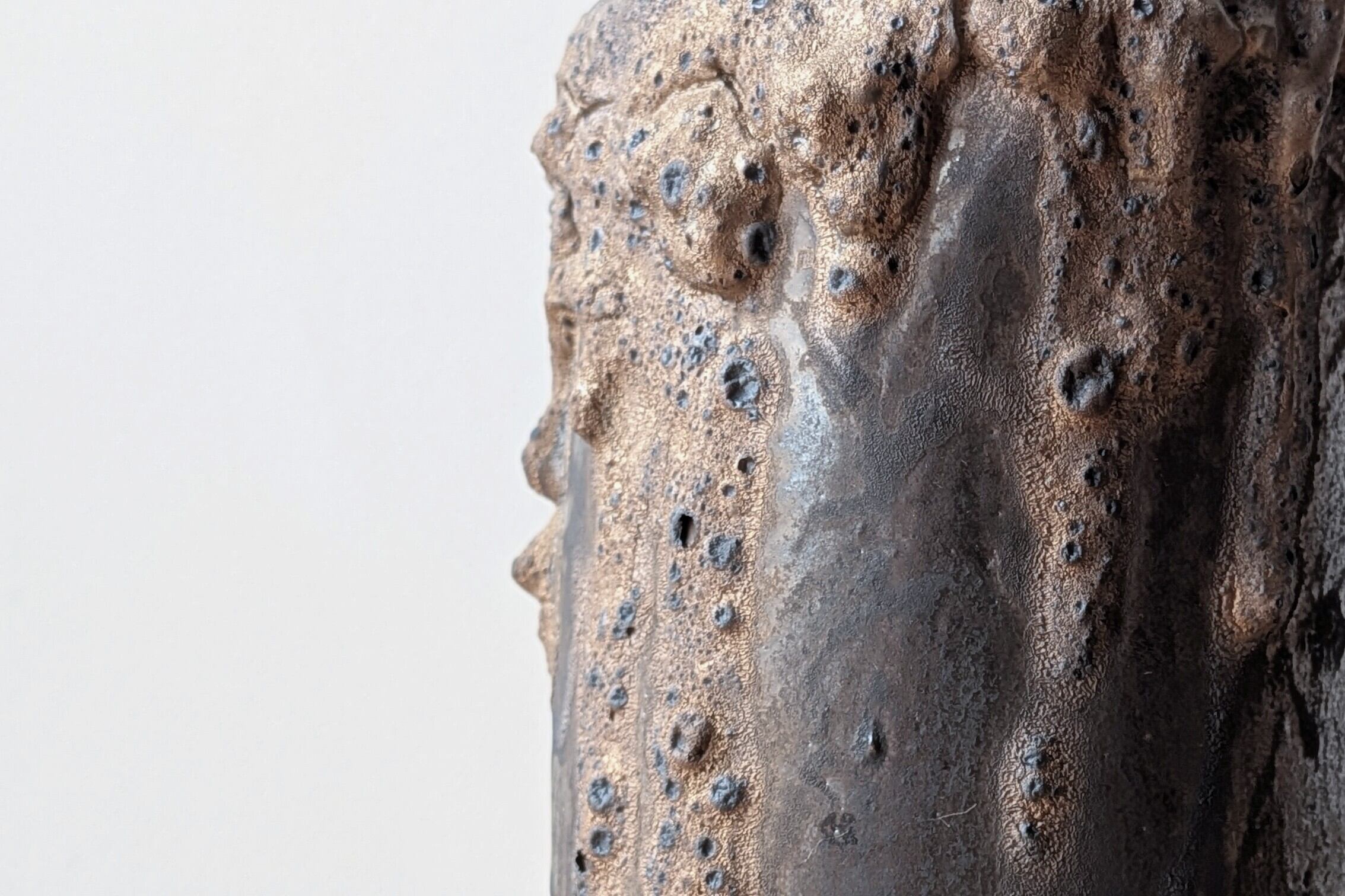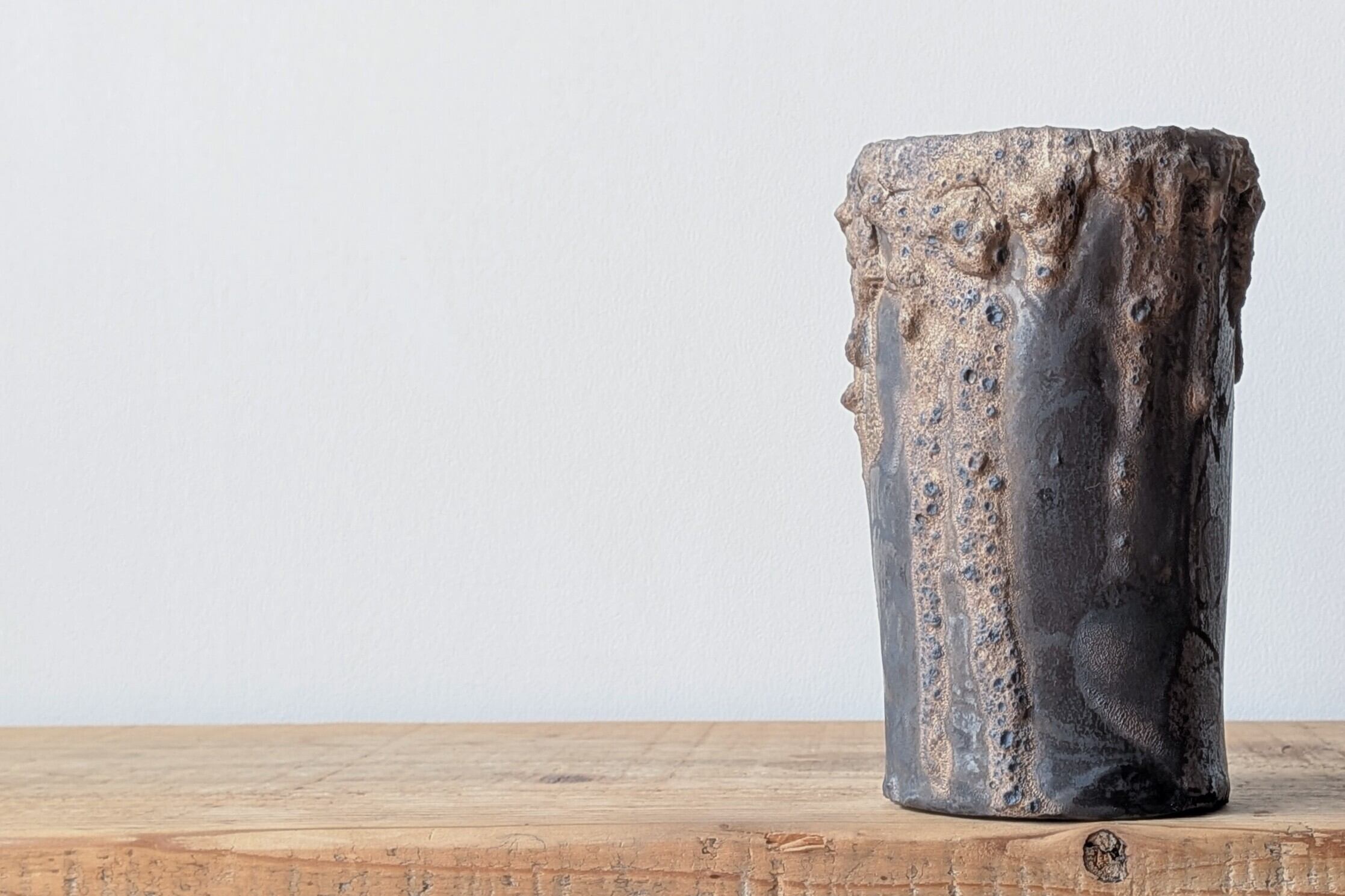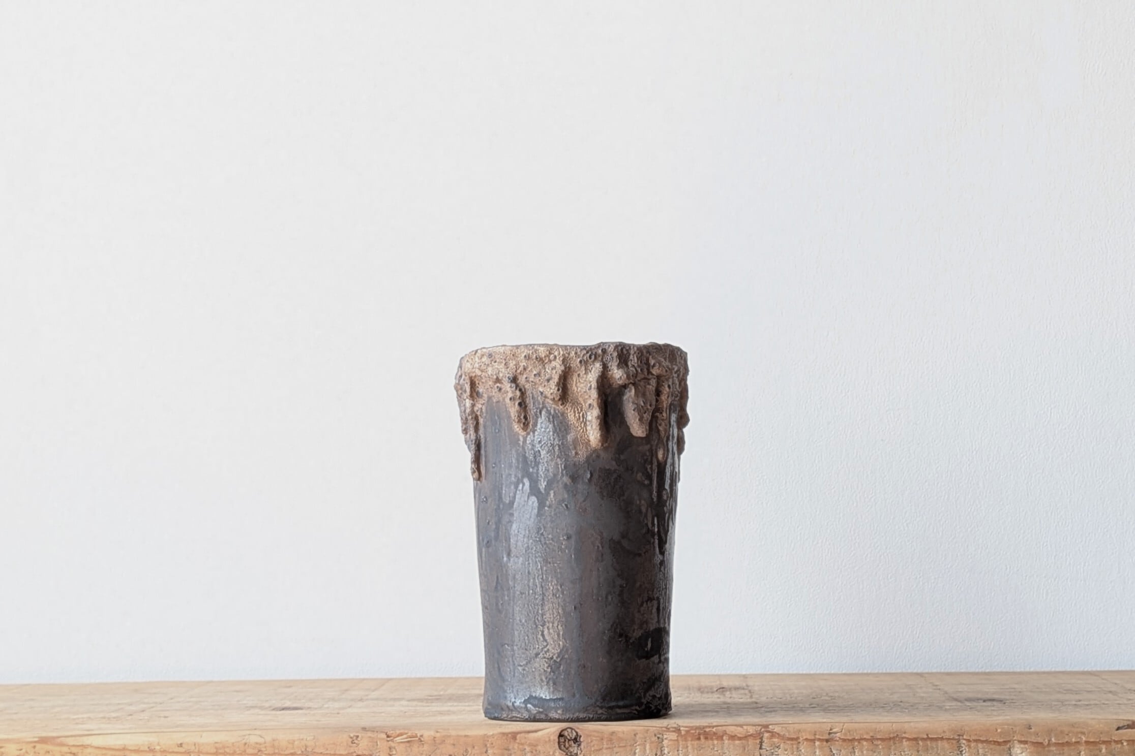 黒土を筒状に成型した陶土に陶土を垂らし、アンティークゴールド釉薬でコーティングし仕上げました。