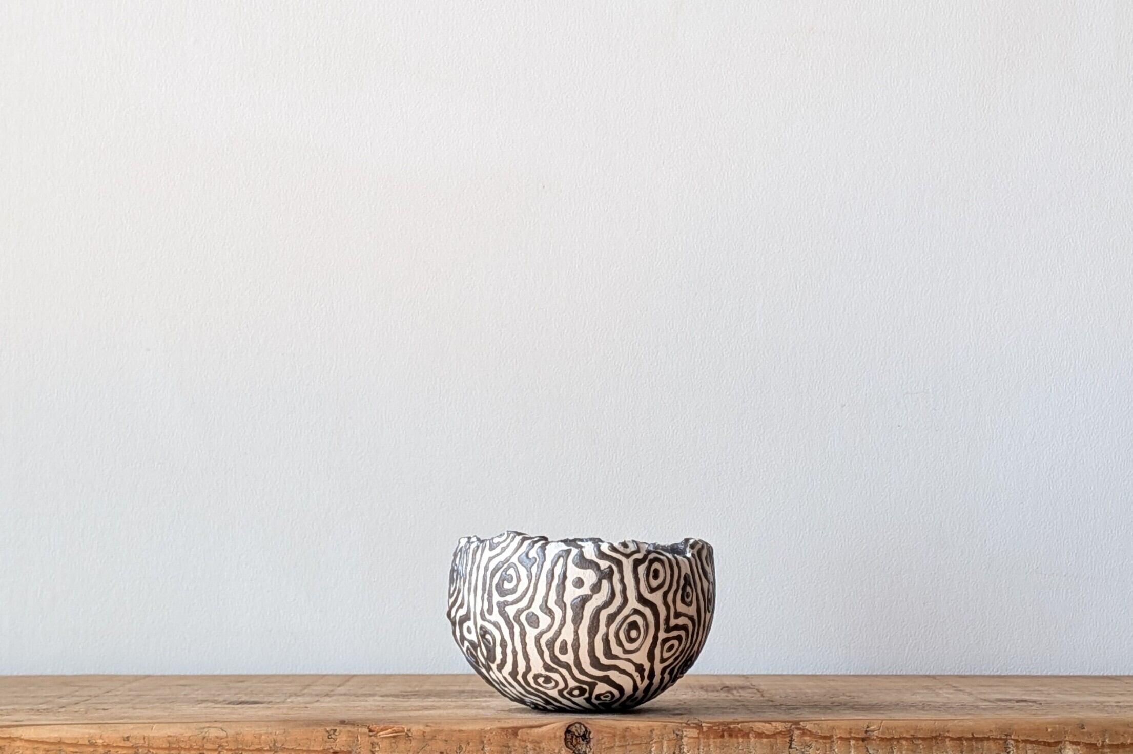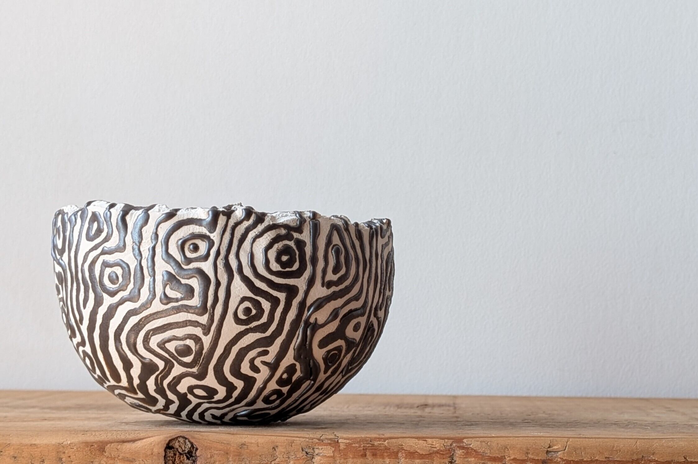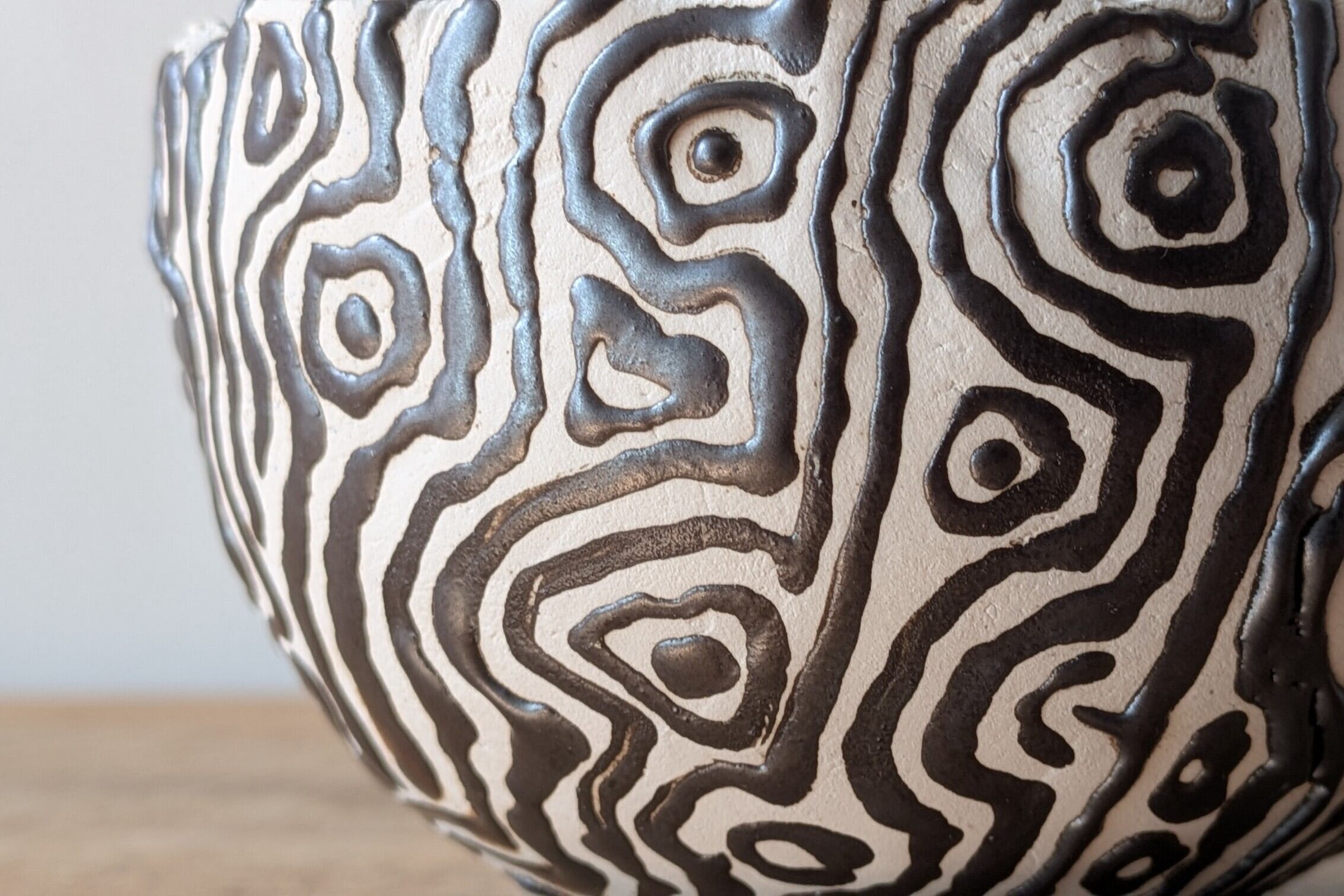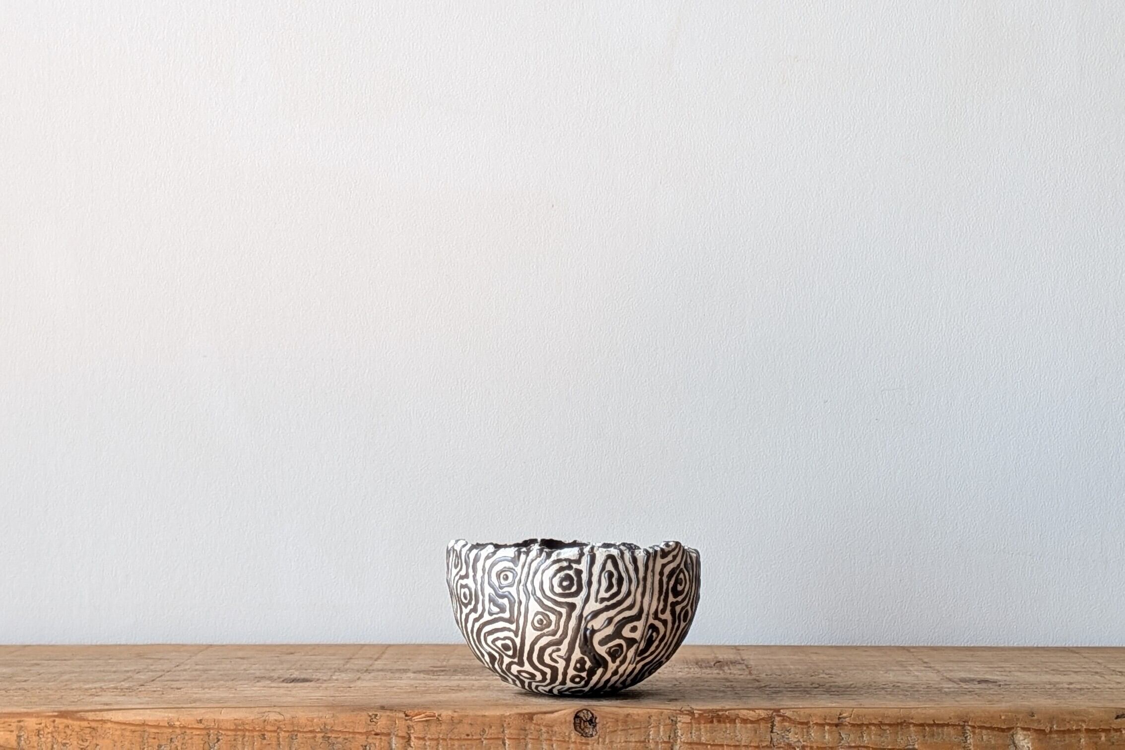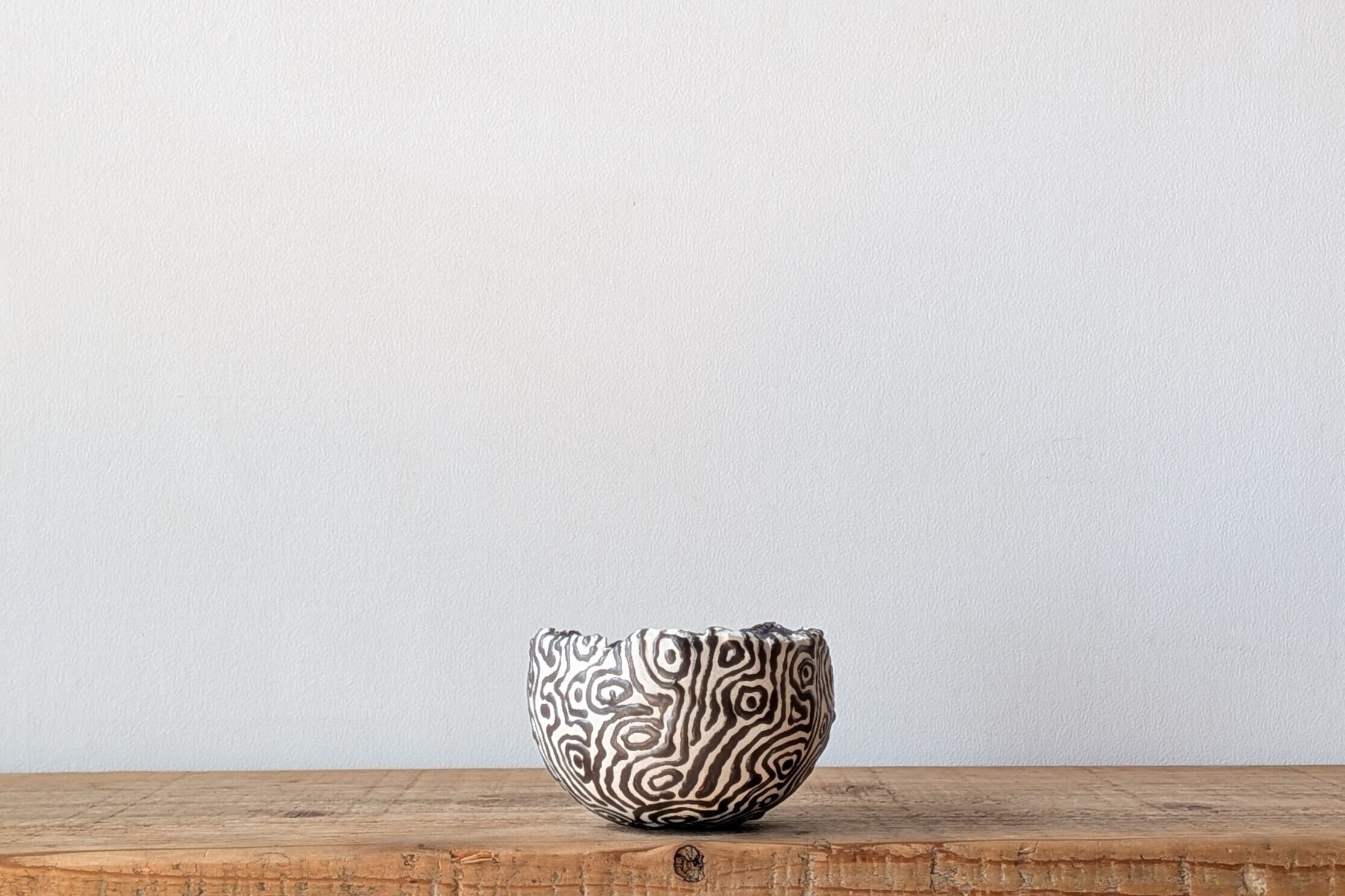 お椀型に成型した陶土に特殊な製法で規則性のある模様を施しました。どこか異国の民族の工芸品の様なデザインが、植物の雰囲気をより高めてくれます。