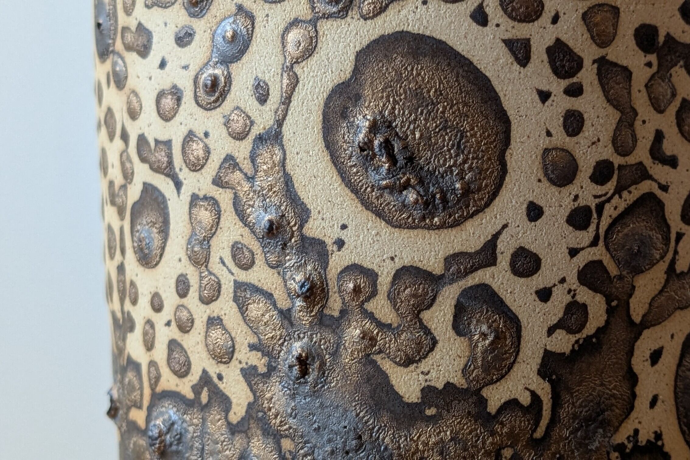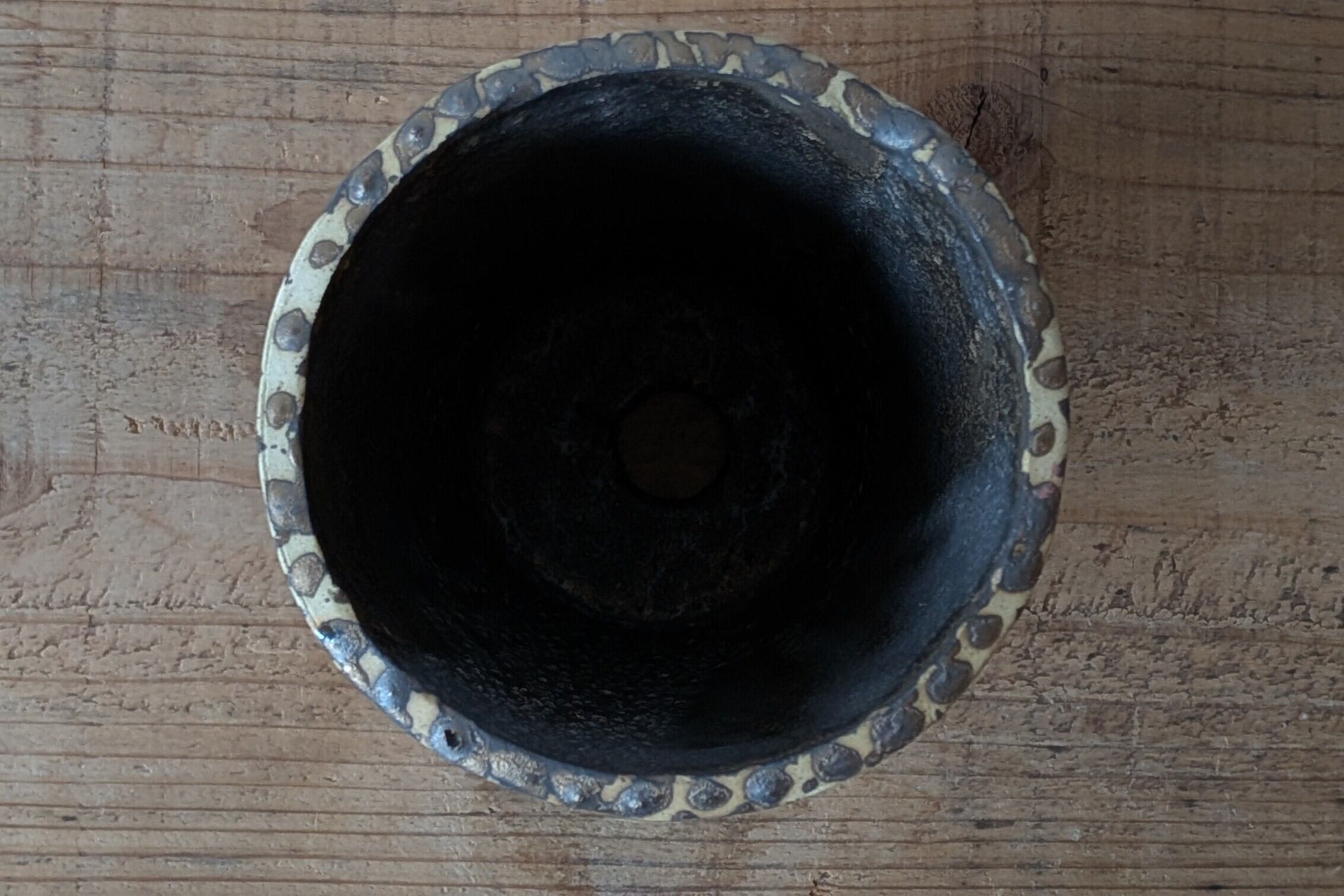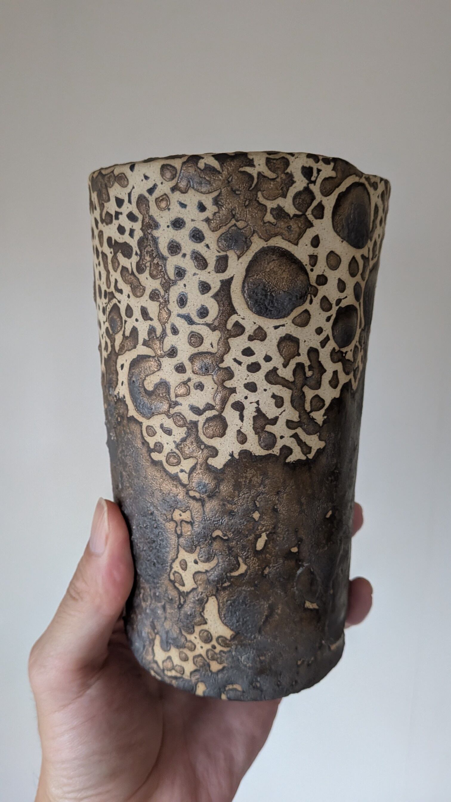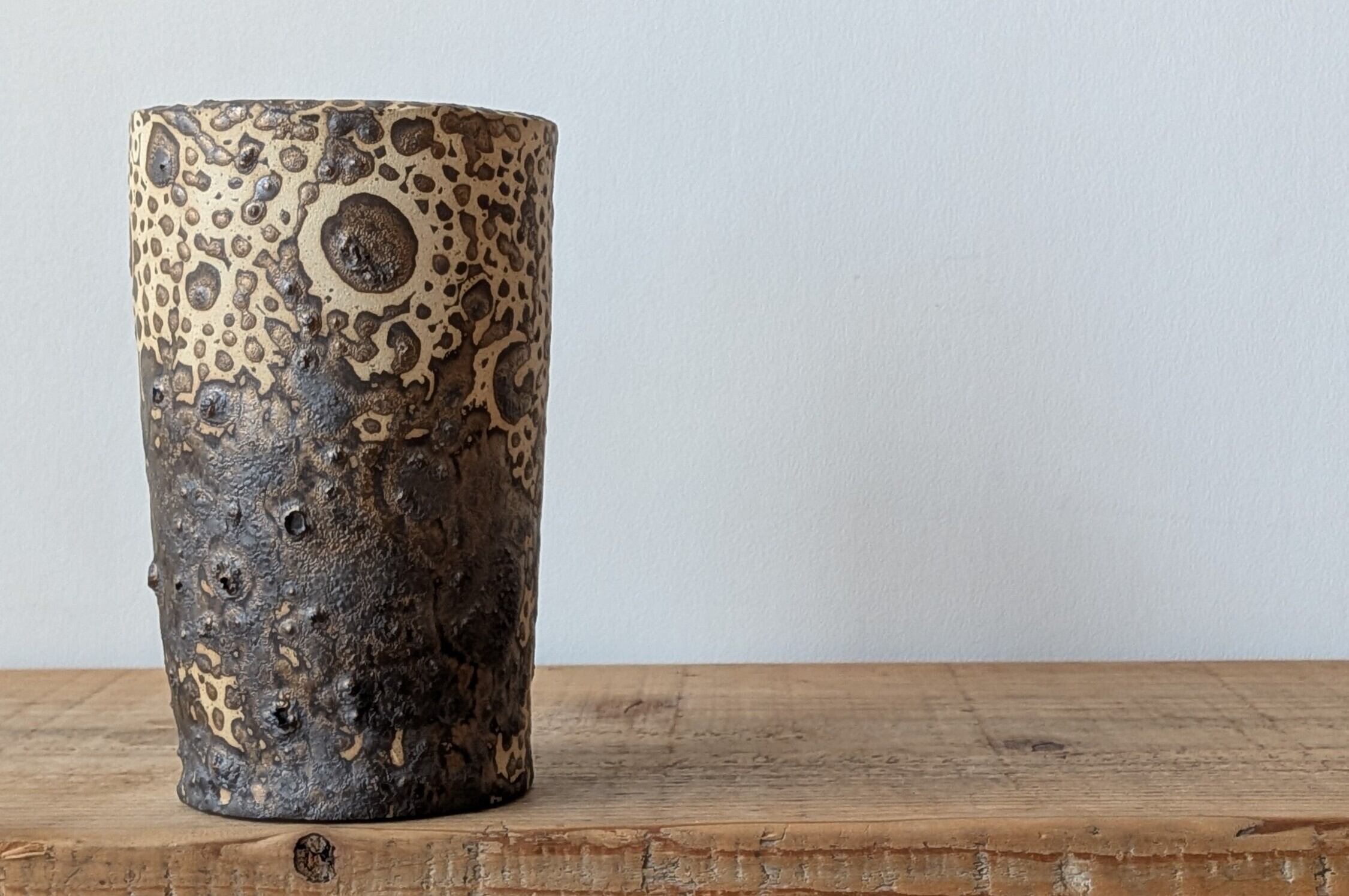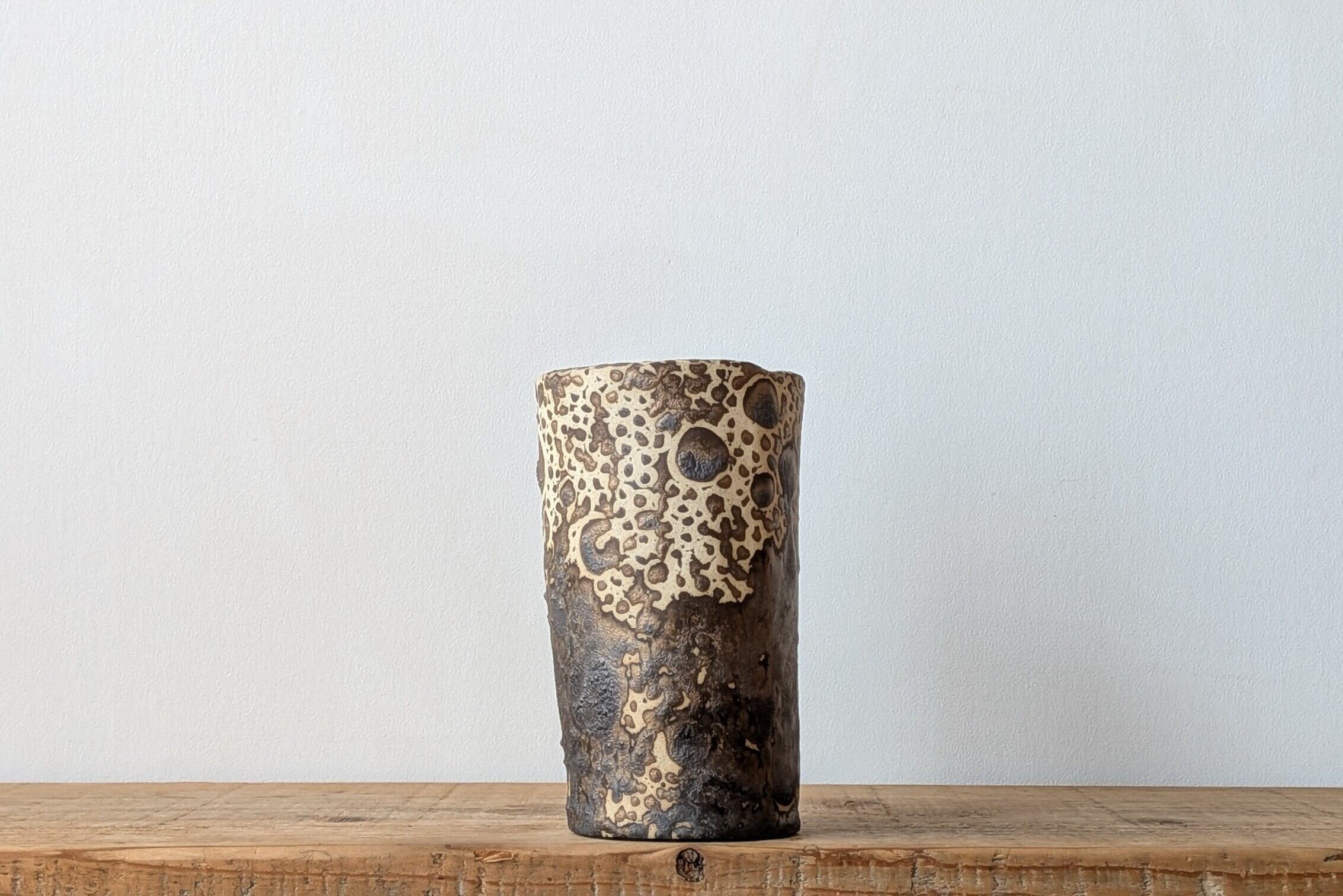 筒型に成型した器を特殊な製法でブチ模様を施しました。アンティークゴールドとベージュの相性がよくファンタジーな雰囲気になっています。