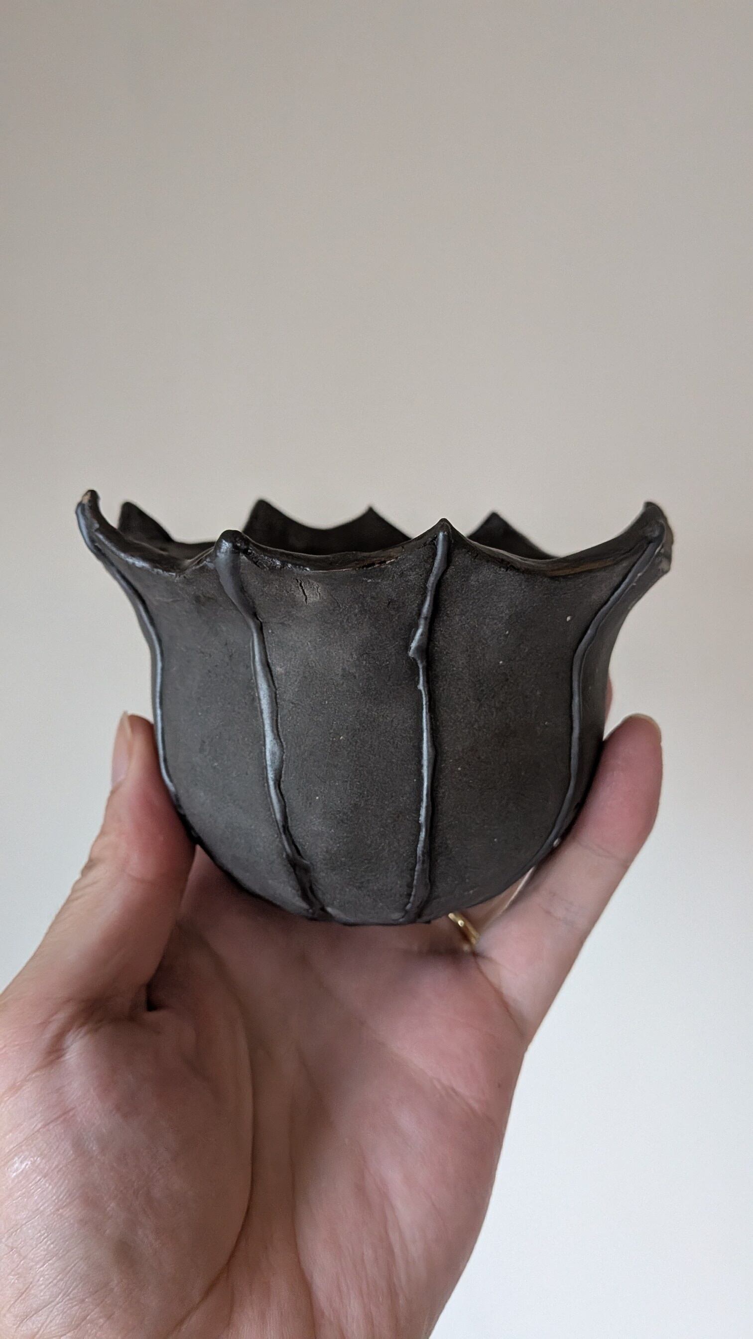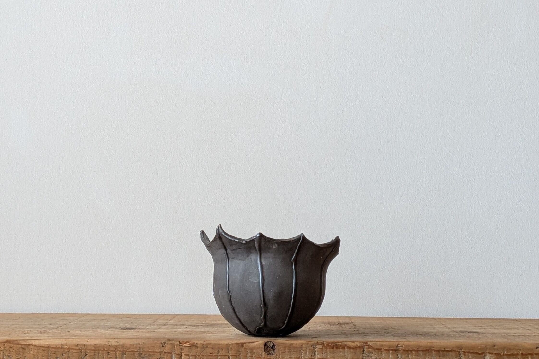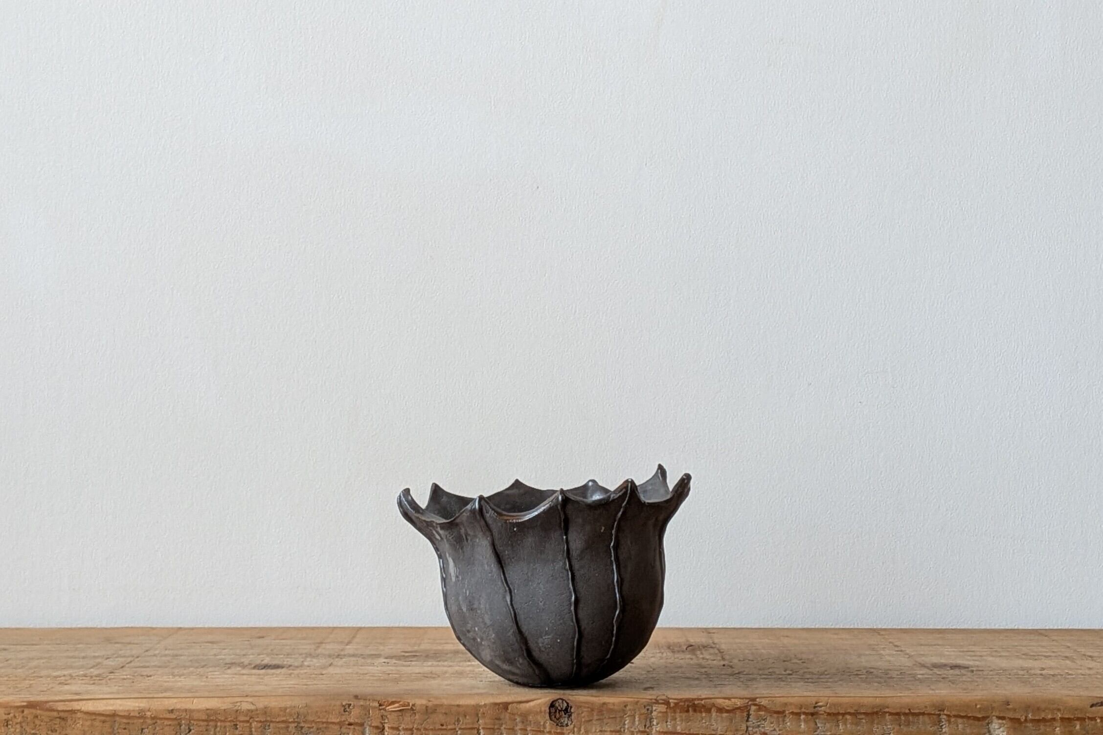 壷型に成型した陶土に特殊な製法で黒色の細かな模様を施しました。ハロウィンのコウモリをイメージしました。尖った縁が植物の雰囲気をちょっと悪い感じにしてくれます。