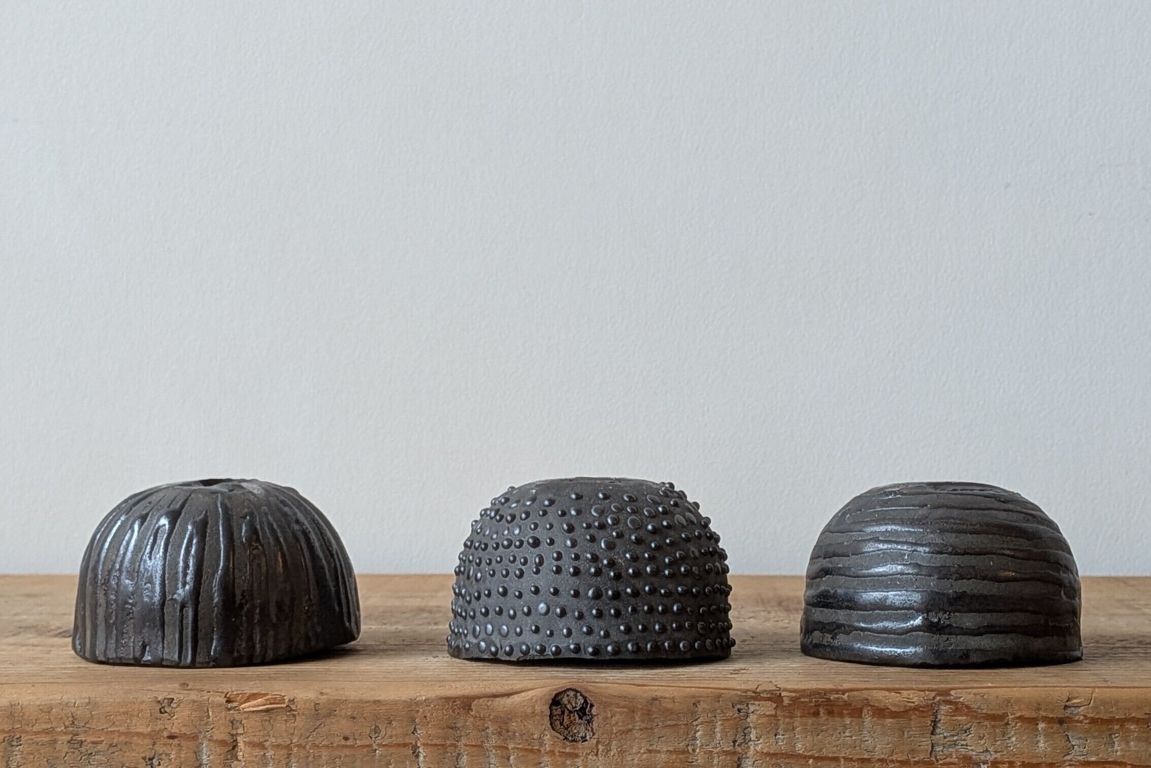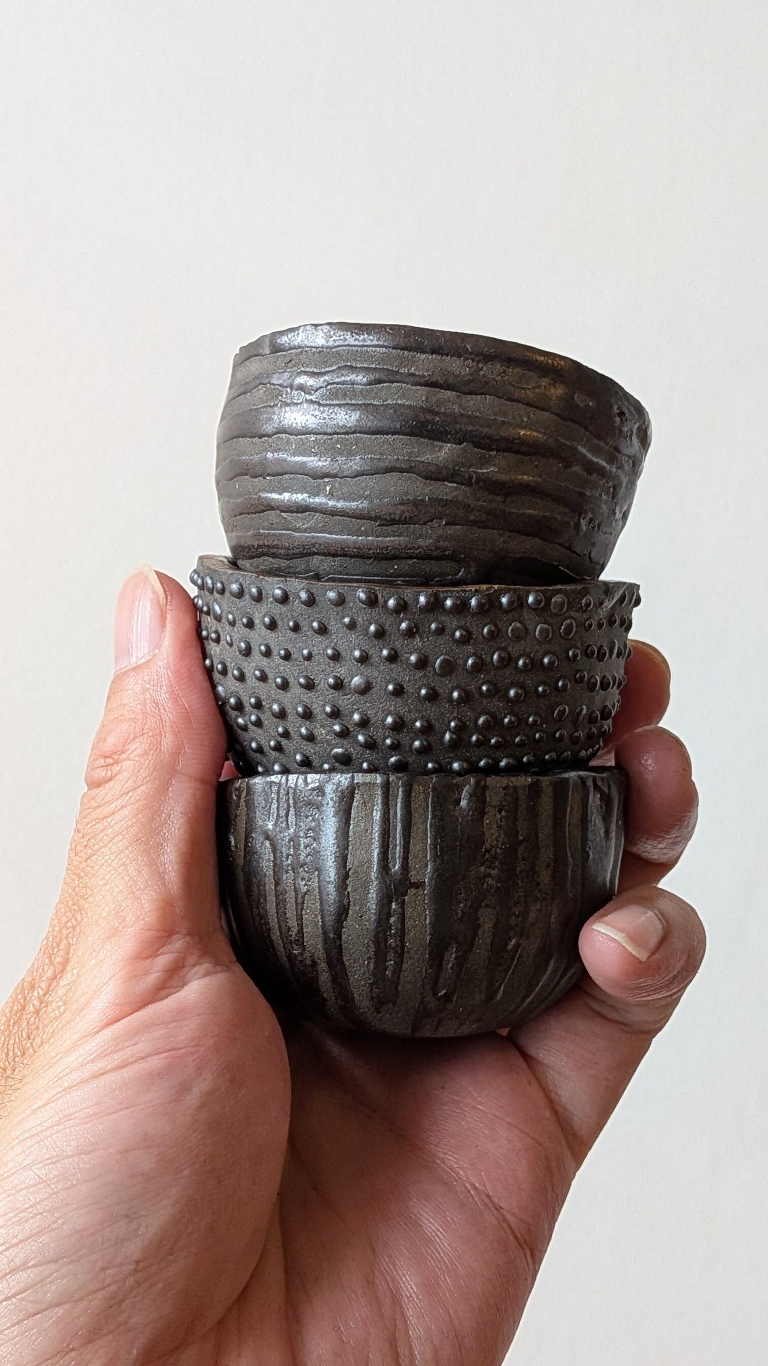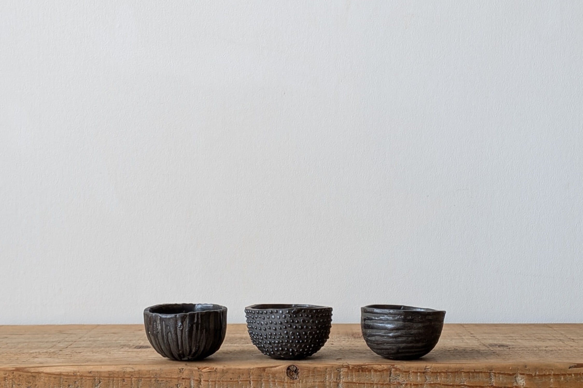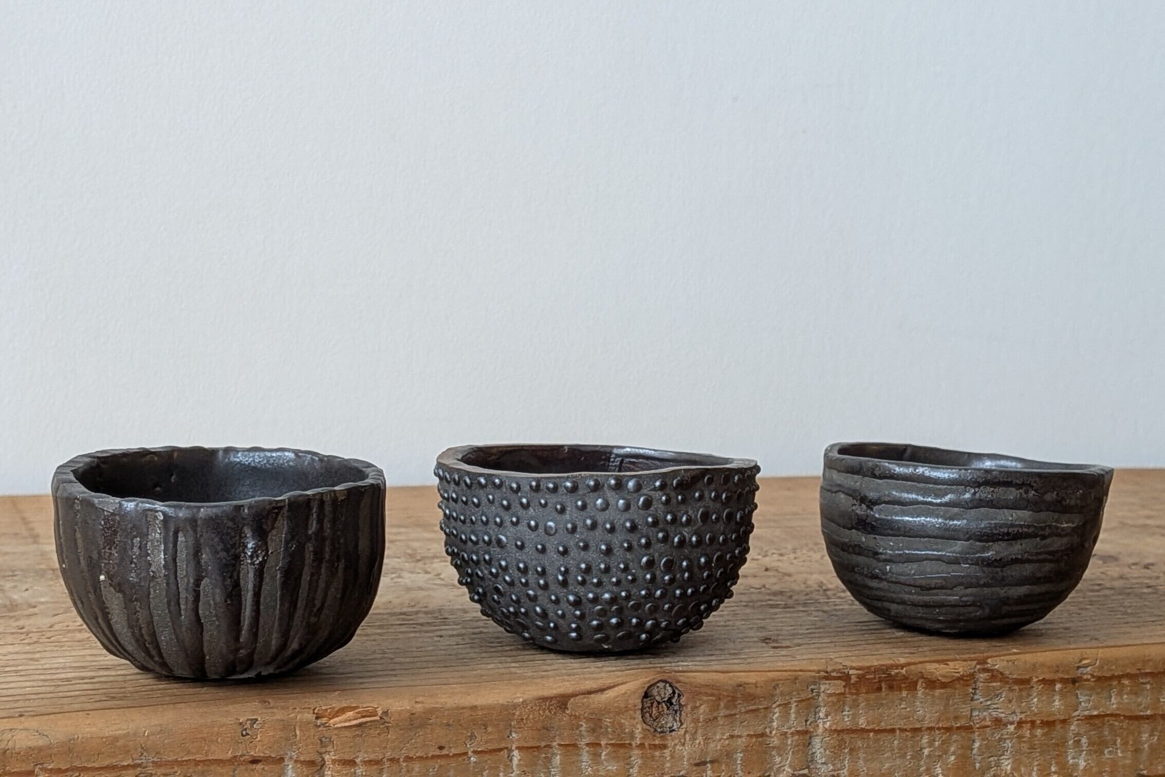 黒土をおちょこ状に成形し、特殊な技法でマットブラックの釉薬を施し凹凸のデザインに仕上げました。立体感ある模様が植えた植物の存在感をアップしてくれます。