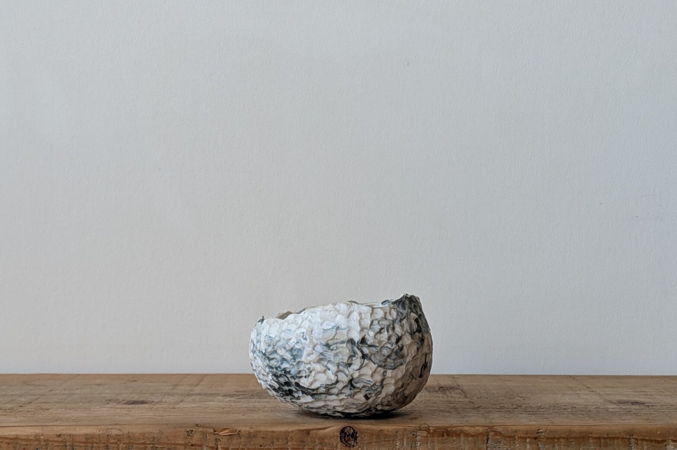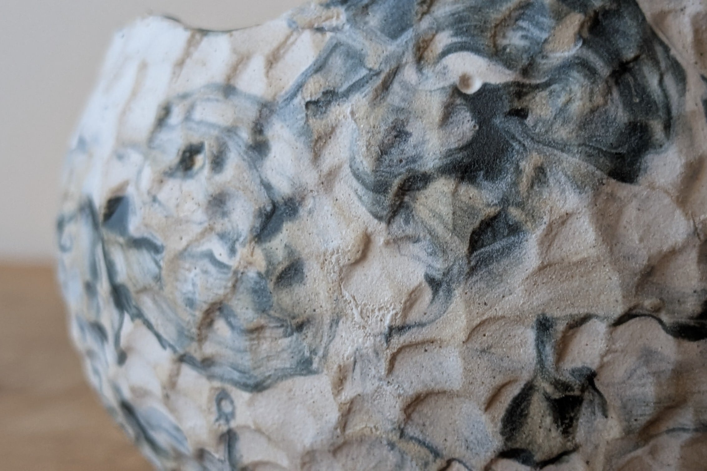 お椀型に成型した陶土に特殊な技法で模様を施し水彩画の様な雰囲気に仕上げました。優しい雰囲気でグリーンとの相性も抜群なデザインです。