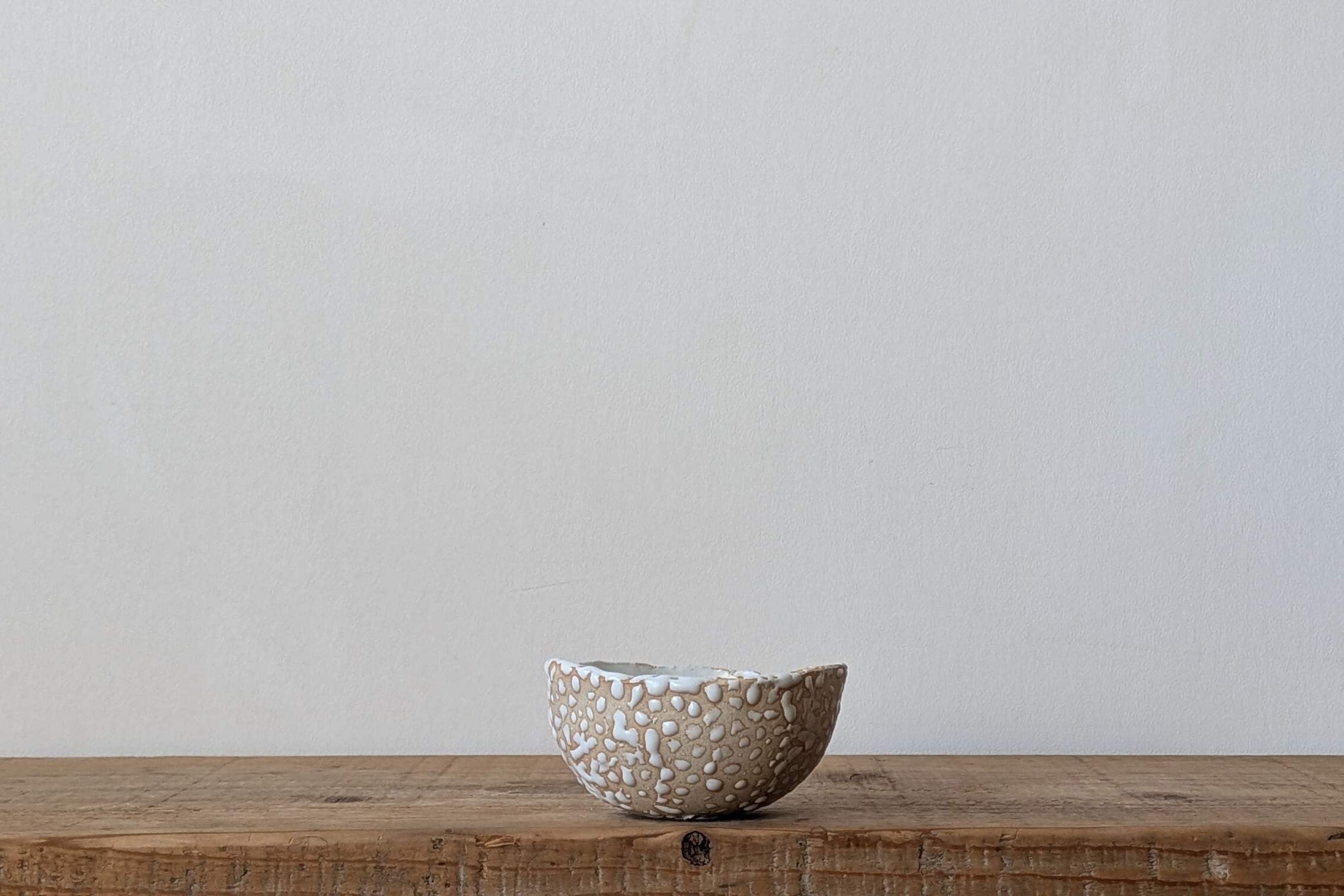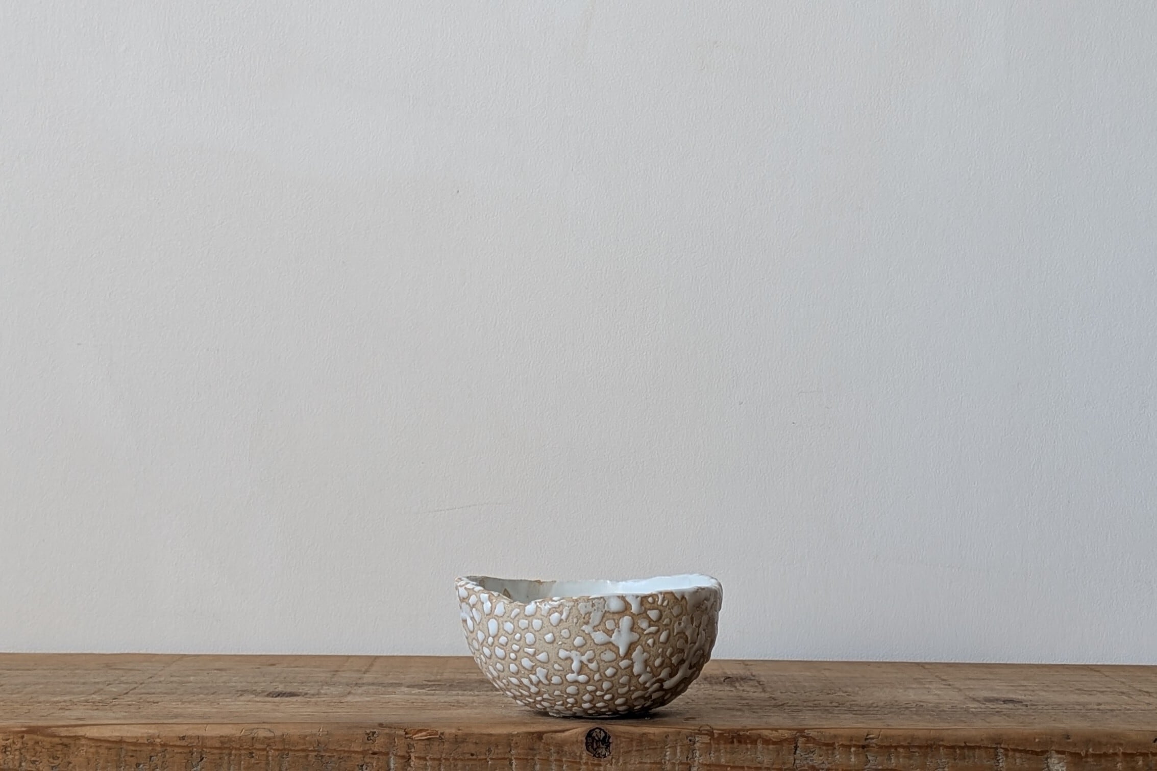 信楽粘土の素朴な風合いをベースに、ぷっくりとした白い釉薬のドット柄が楽しいデザイン。白マットの釉薬が立体的に施され、ポップで可愛らしいテクスチャが魅力の個性派陶器鉢です。