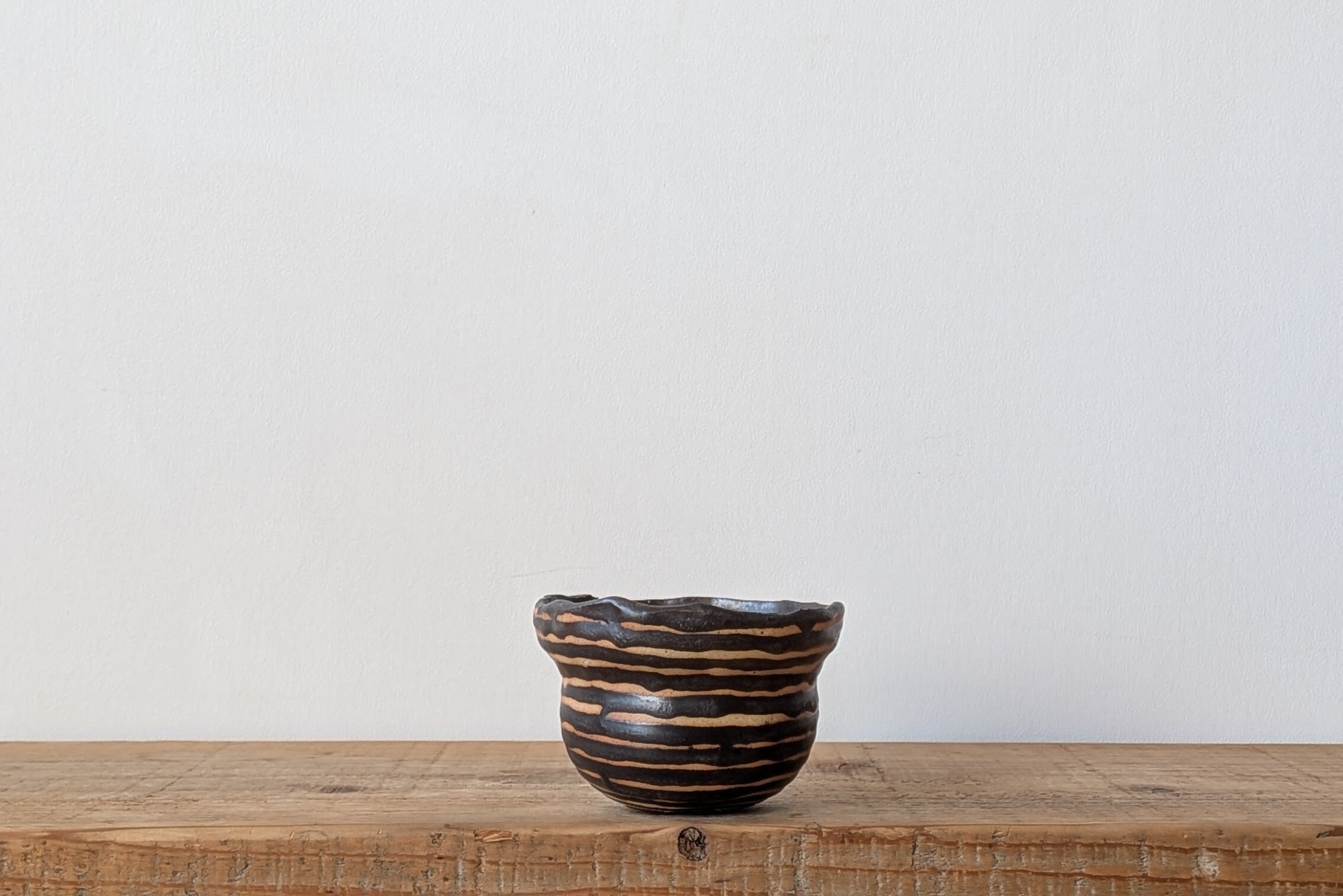 スタンダードな信楽土の温かい色を基調に、マットブラックの釉薬が水平方向の流れるような縞模様を形成。土と黒の層が交互に現れ、モダンでありながら手作りの温かみを感じさせるデザインです。