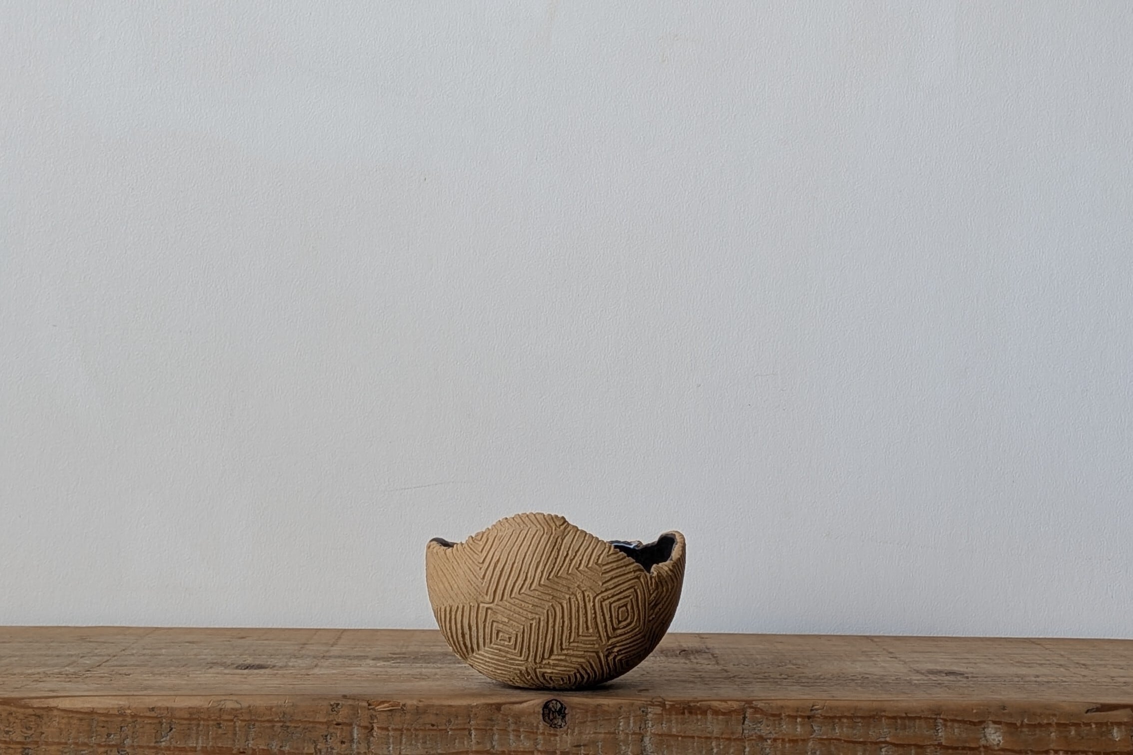特殊な練り込み土の温かみのあるキャメル色を活かし、ジオグラフィックな模様を施しました。内側の黒マット釉薬が、外側の精巧な手仕事によるテクスチャを際立たせるアート作品です